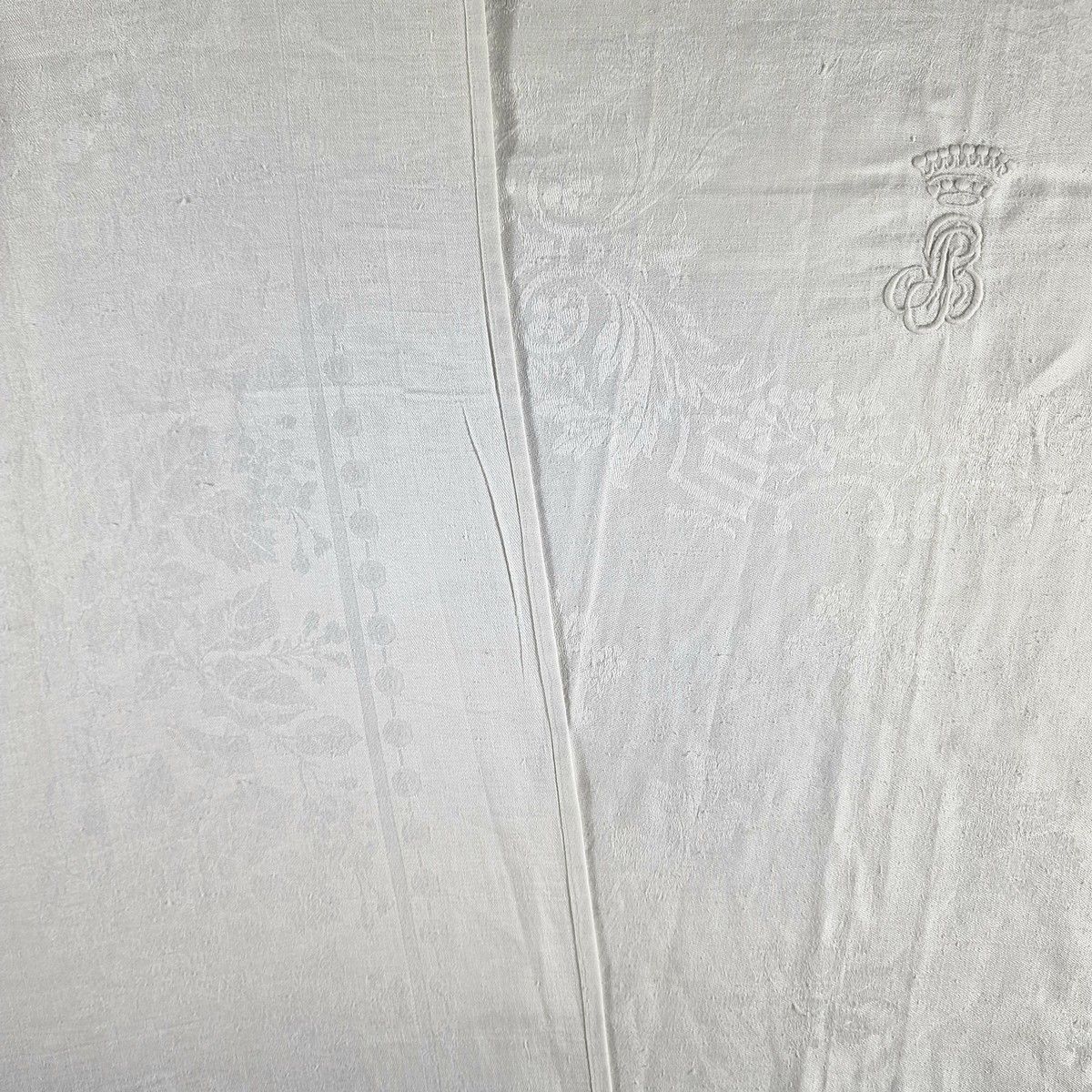 LARGE RECTANGULAR NAPPE in white linen damask Circa 1900 with Louis XVI woven decoration of flowers and flowery garlands and embroidered in bourdon stitch with a white BP monogram stamped with a count's crown in a central cartouche