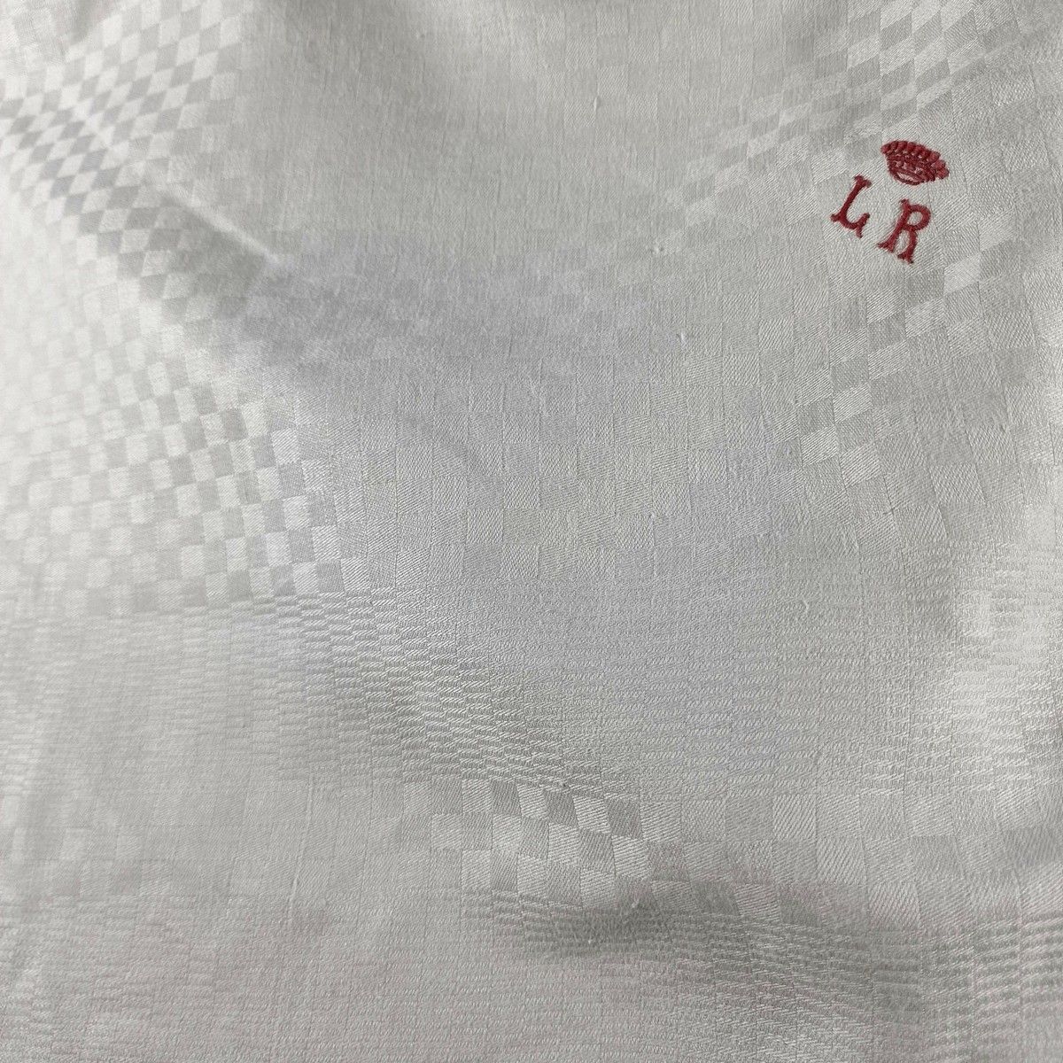 LARGE RECTANGULAR NAPPE in white cotton damask Circa 1890 decorated with woven cubes and embroidered in bourdon stitch with a red monogram LR stamped with a count's crown in one corner