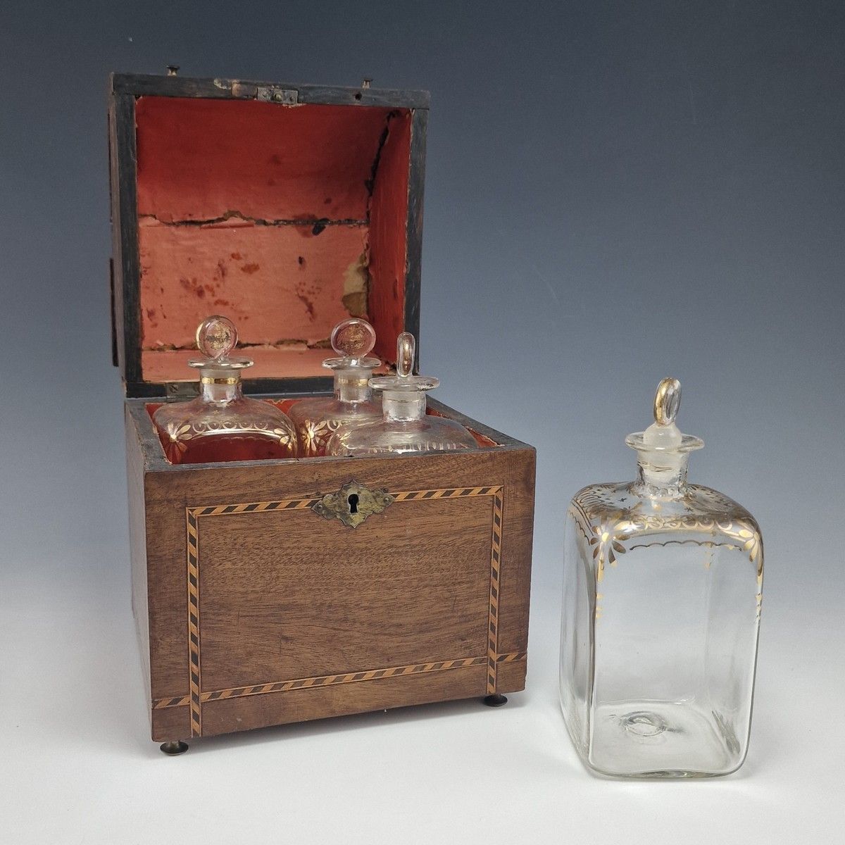 The hinged lid reveals a paper-lined interior containing four square-section blown glass decanters with gold decoration complete with their stoppers.