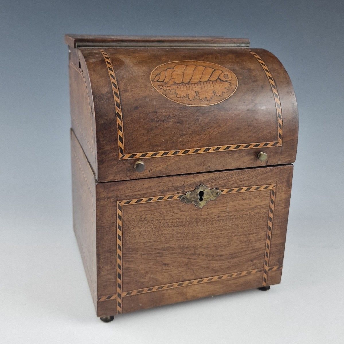 LIQUEUR CELLAR in the form of a cylinder desk in mahogany veneer inlaid with mirliton friezes - England Circa 1800