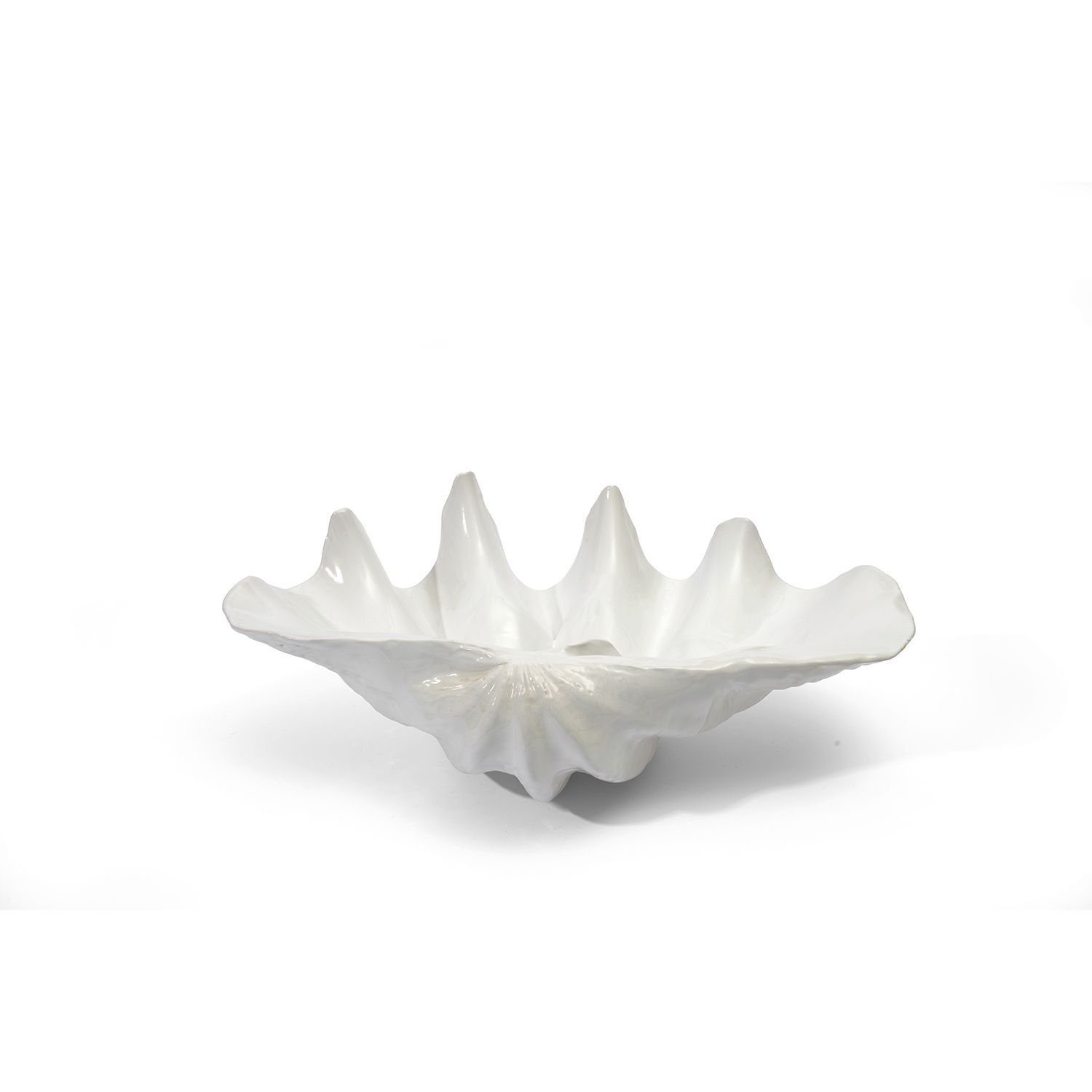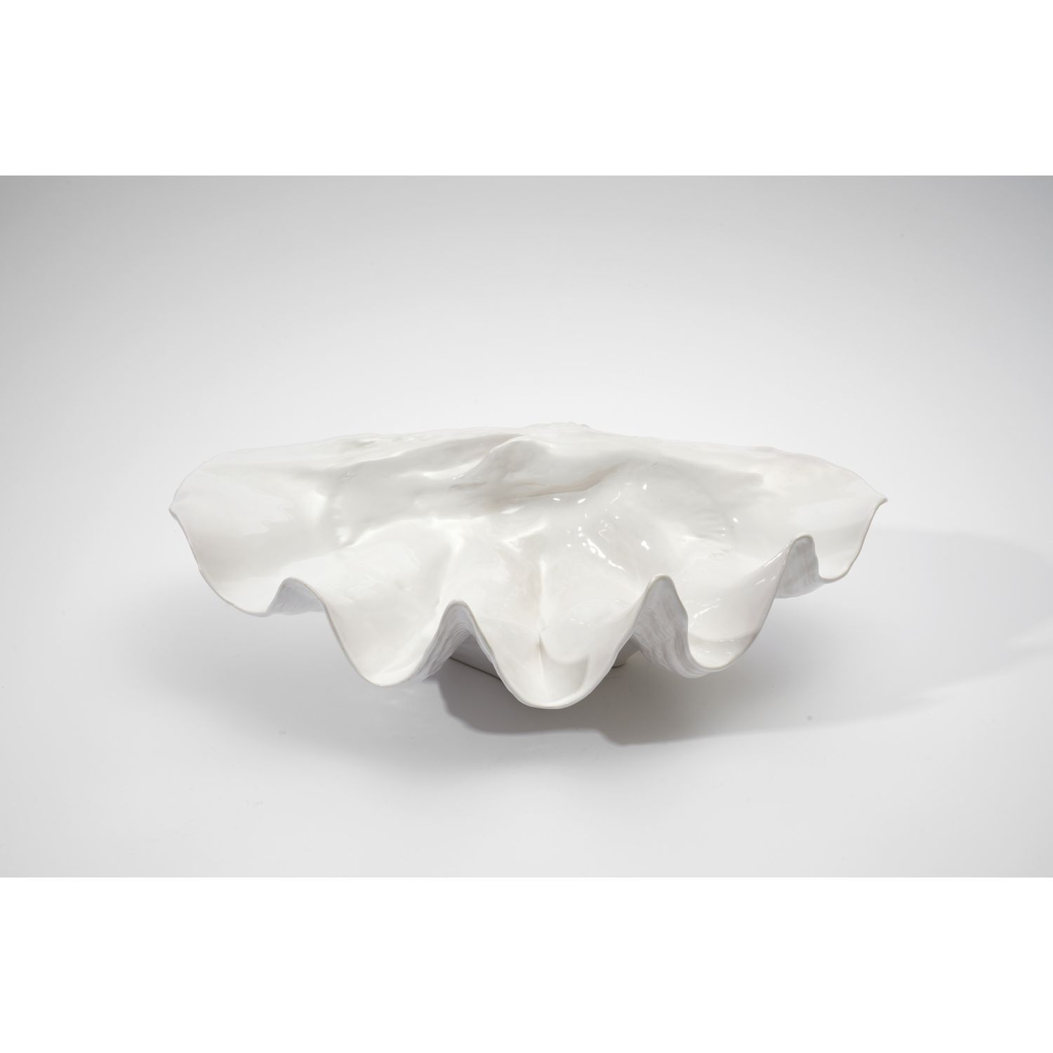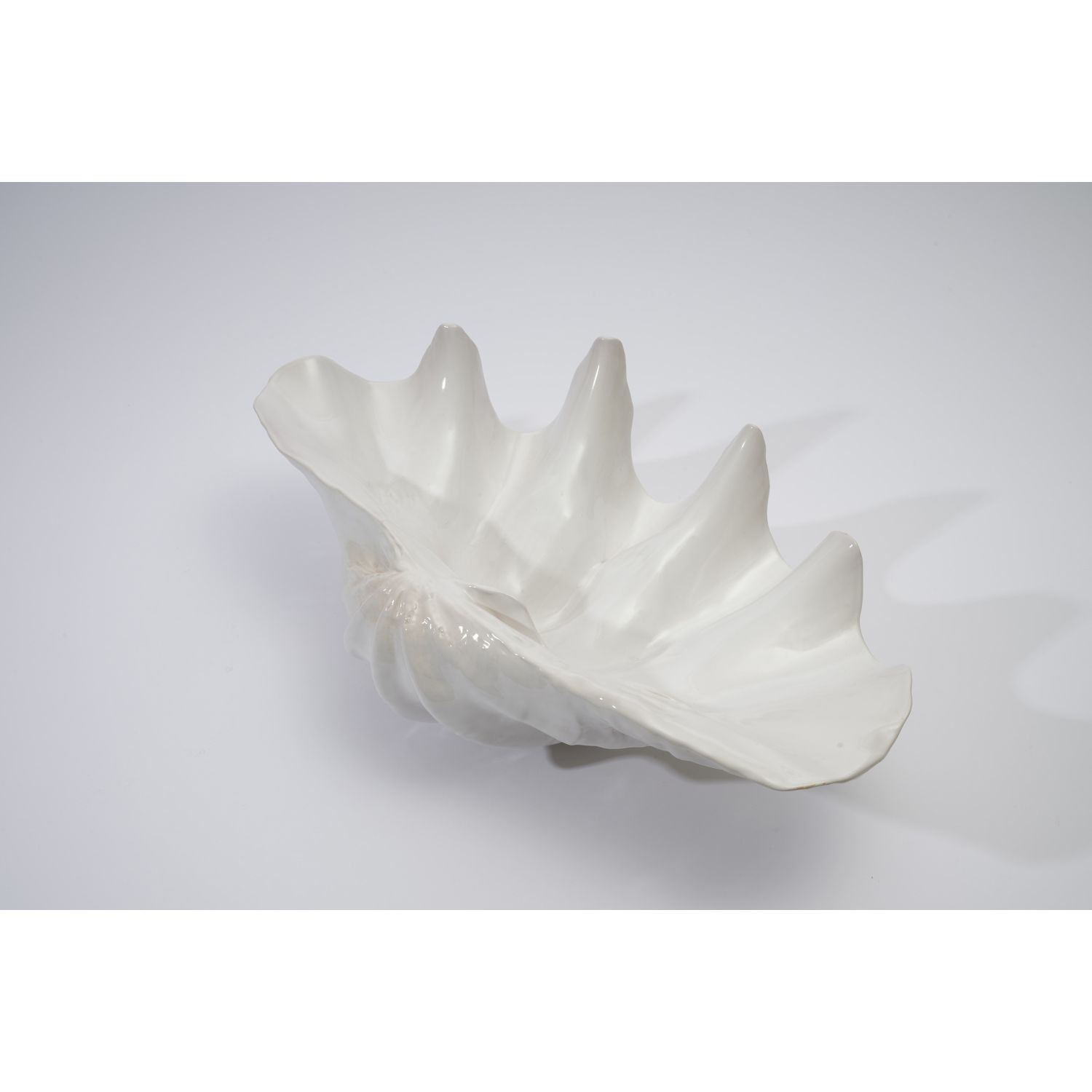Large bowl modelled in the shape of a shell, in white glazed earthenware. Handwritten signature incised on the reverse "Poterie Pol Chambost France". Circa 1960