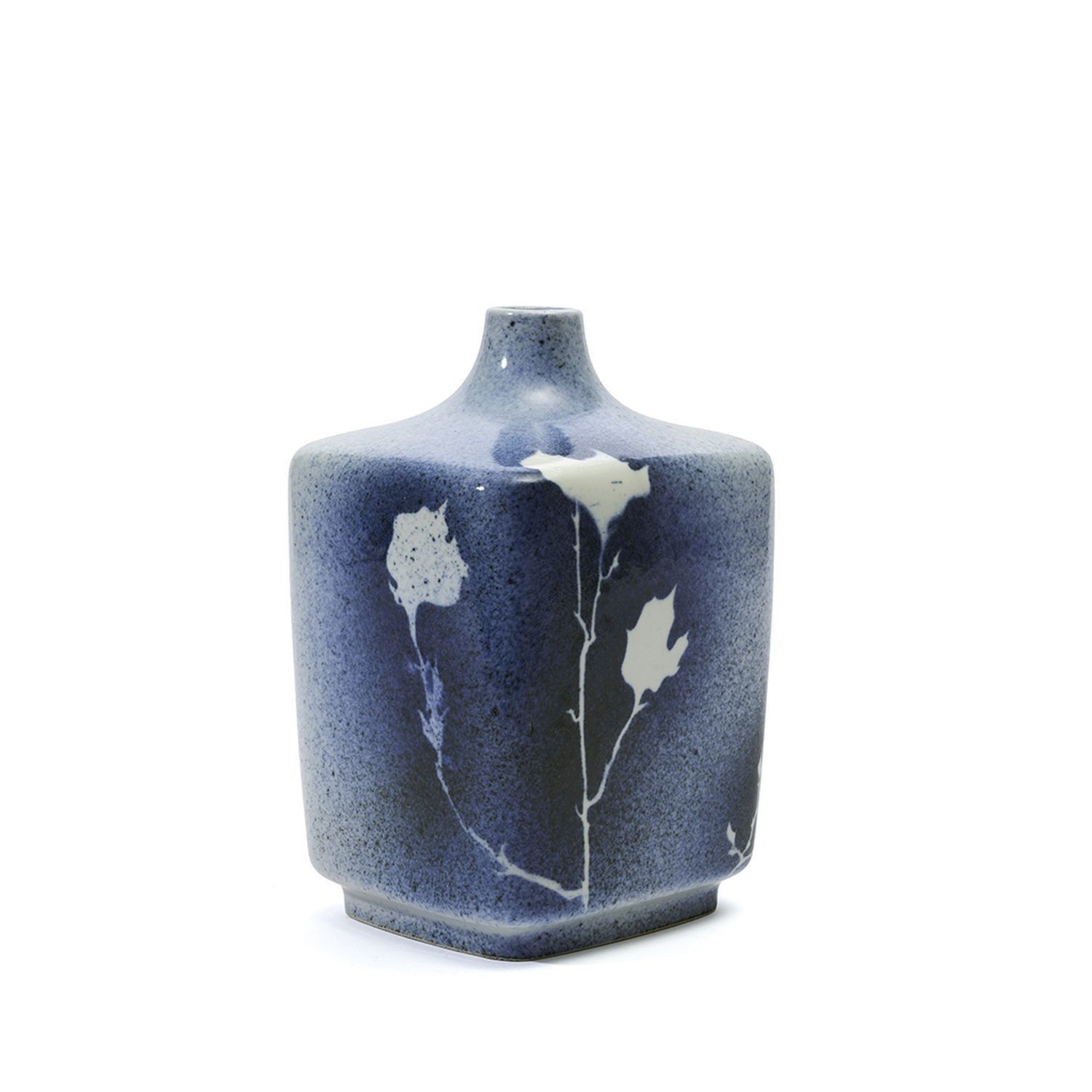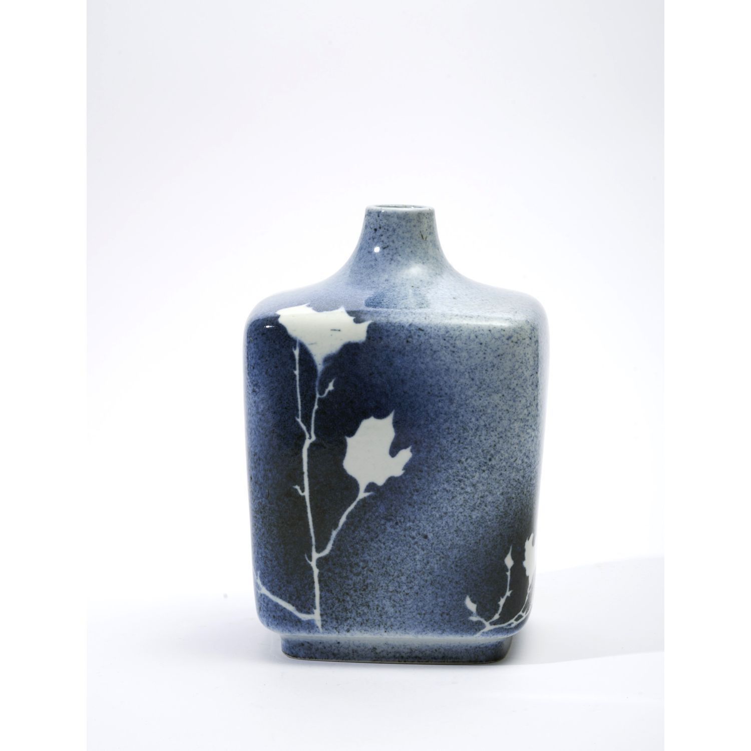 Large square vase-bottle from the "Poplar Branch" series, in blue and white enamelled porcelain. Signed on the reverse of the base.