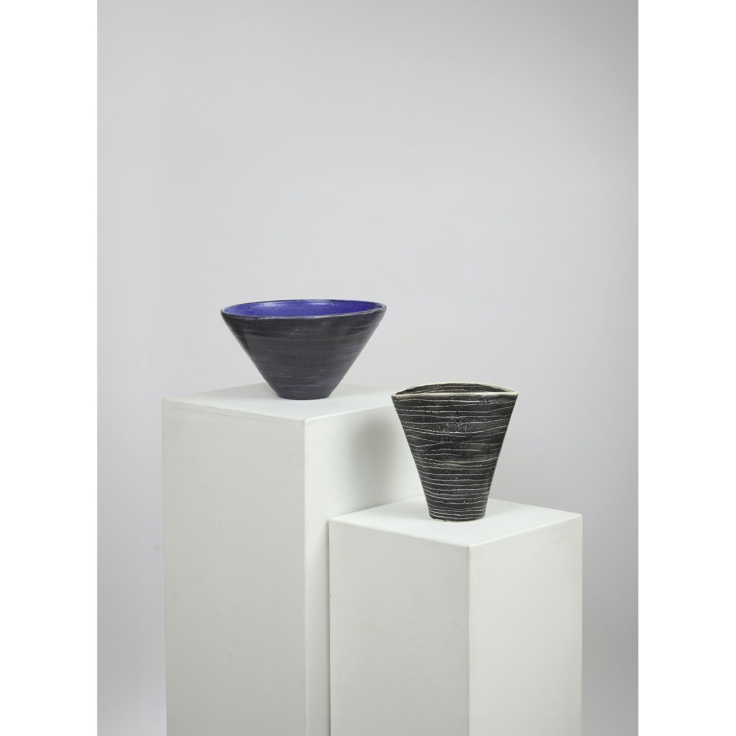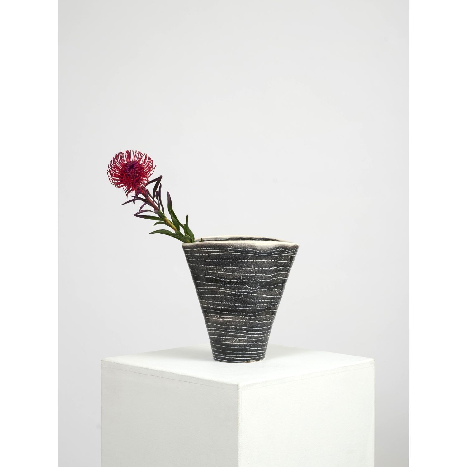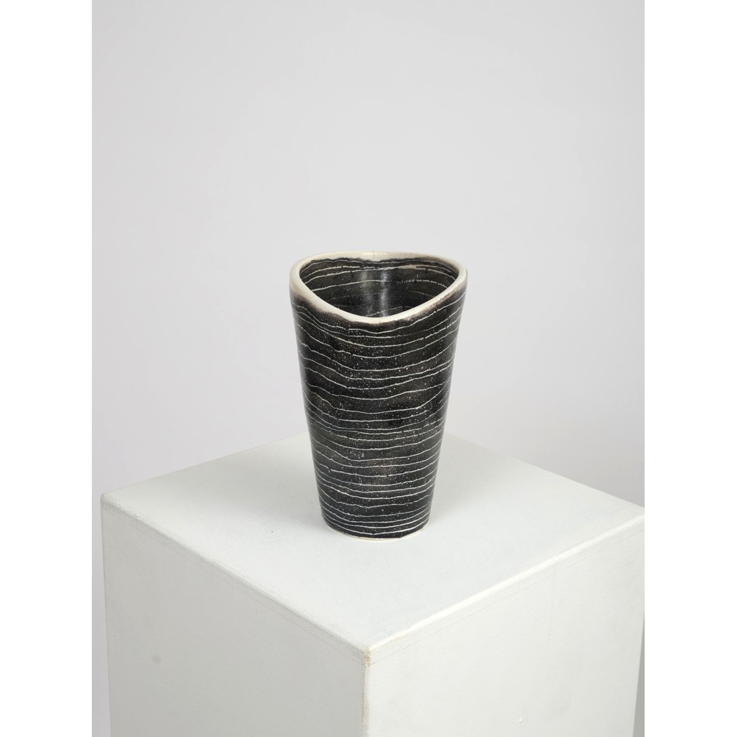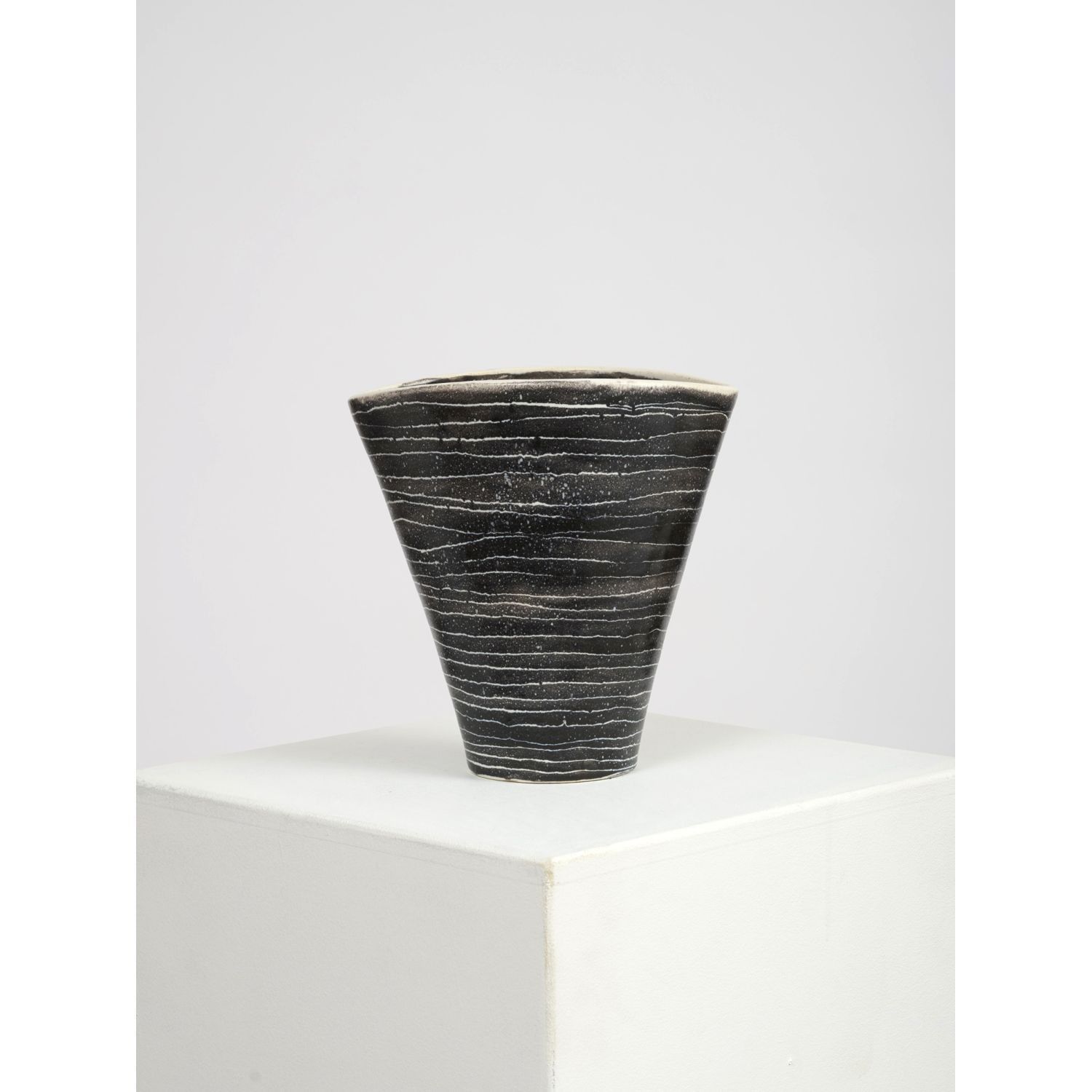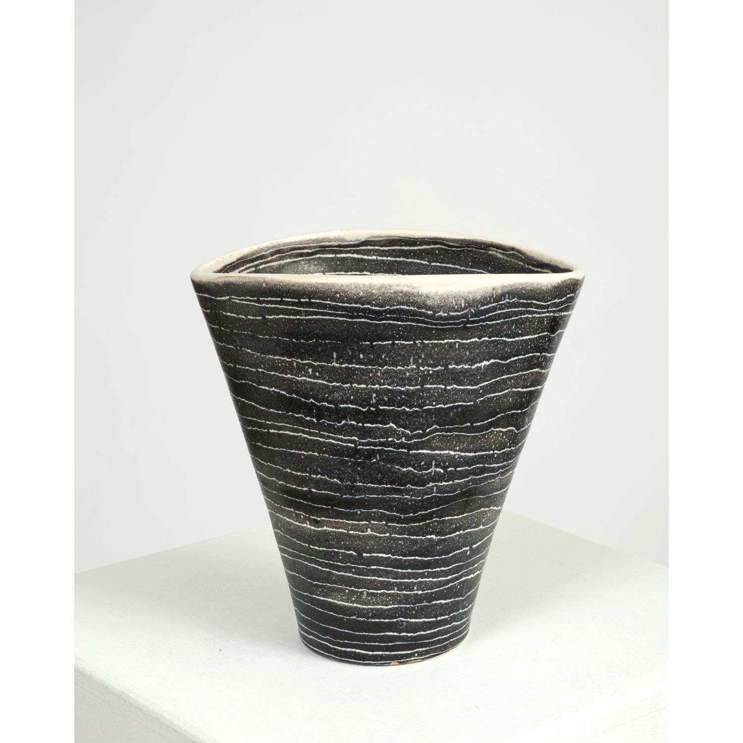 Large earthenware horn vase, fully glazed in black with white lines (inside and out), almond-shaped neck opening. Signed with the artist's monogram on the reverse of the base.