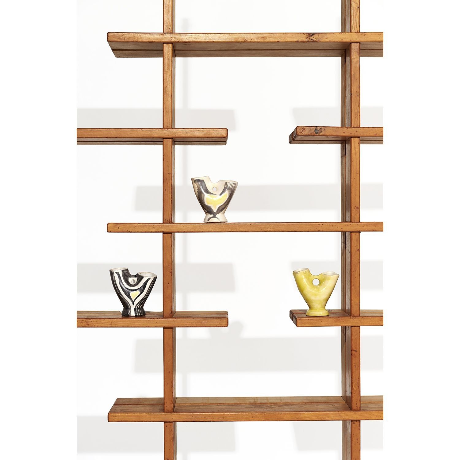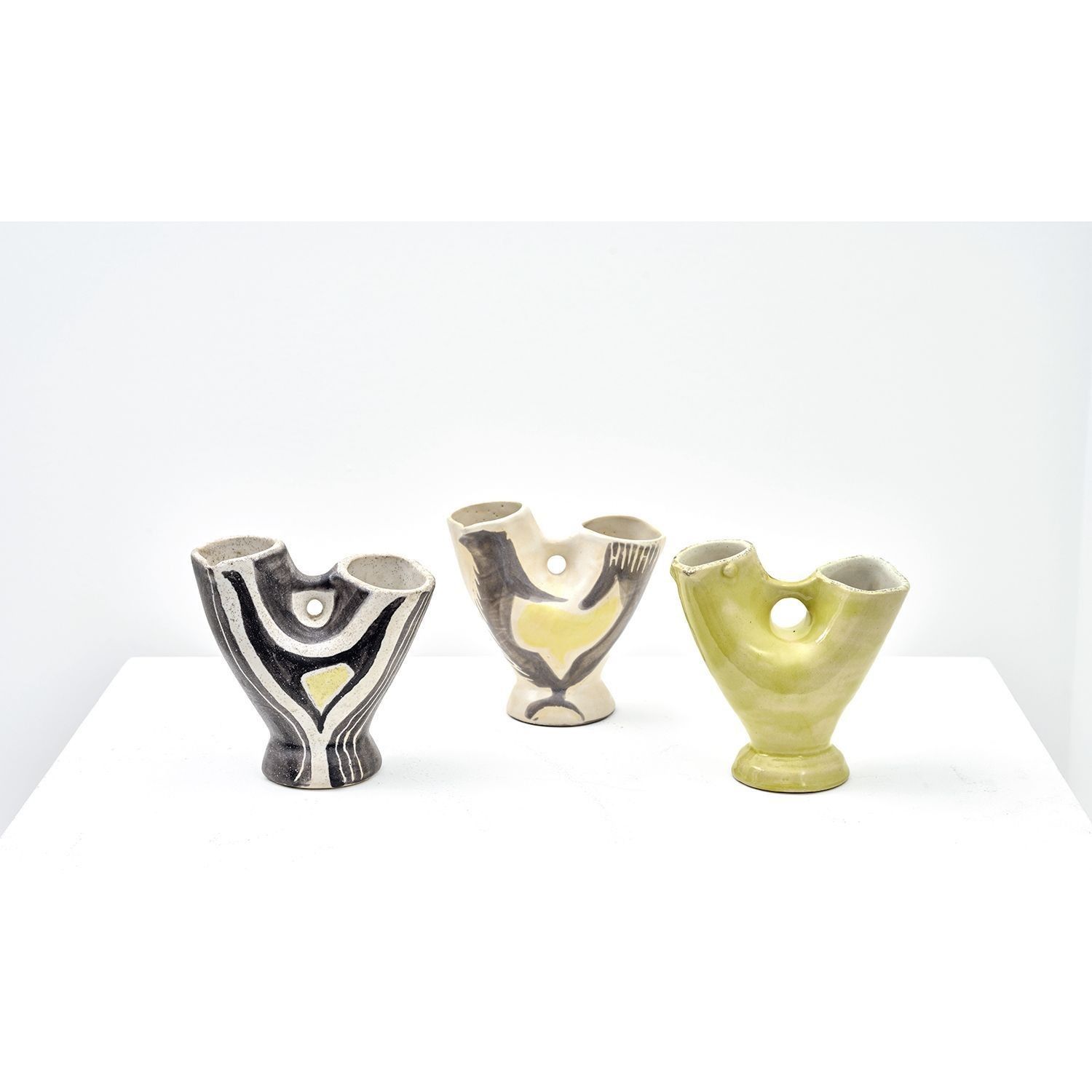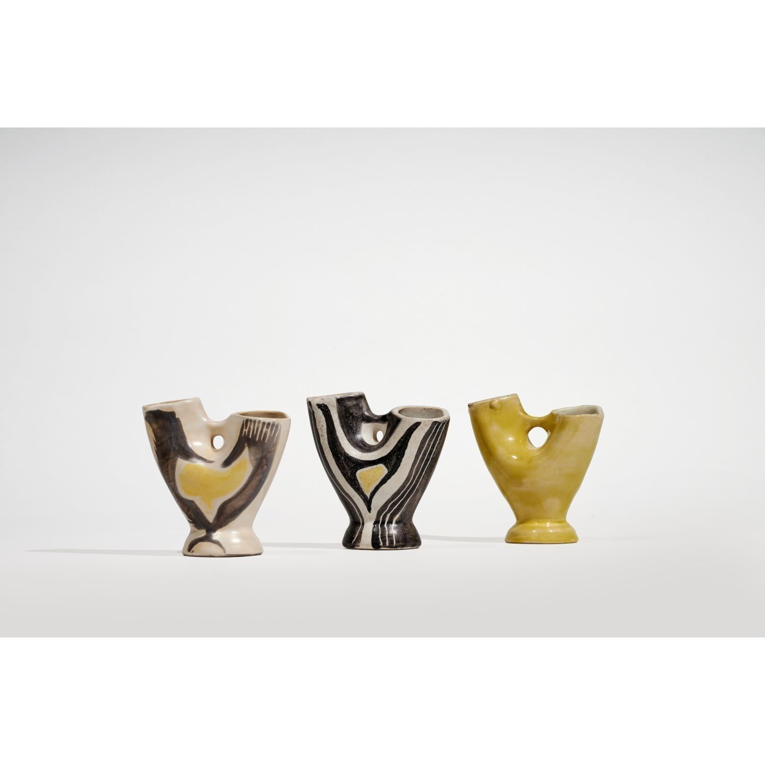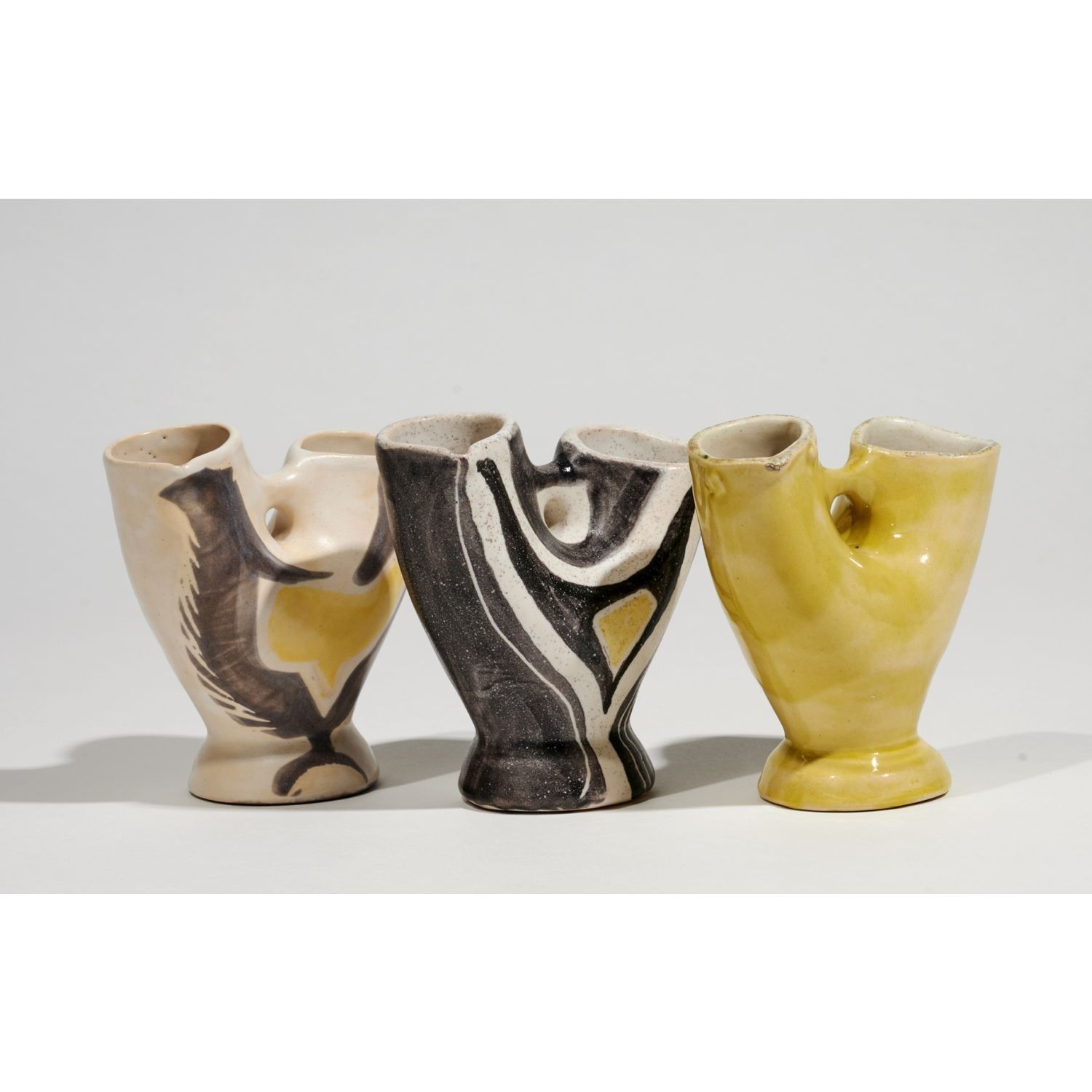 Set of three black, white and yellow glazed earthenware vases known as "Oiseau", two of which are yellow glazed.