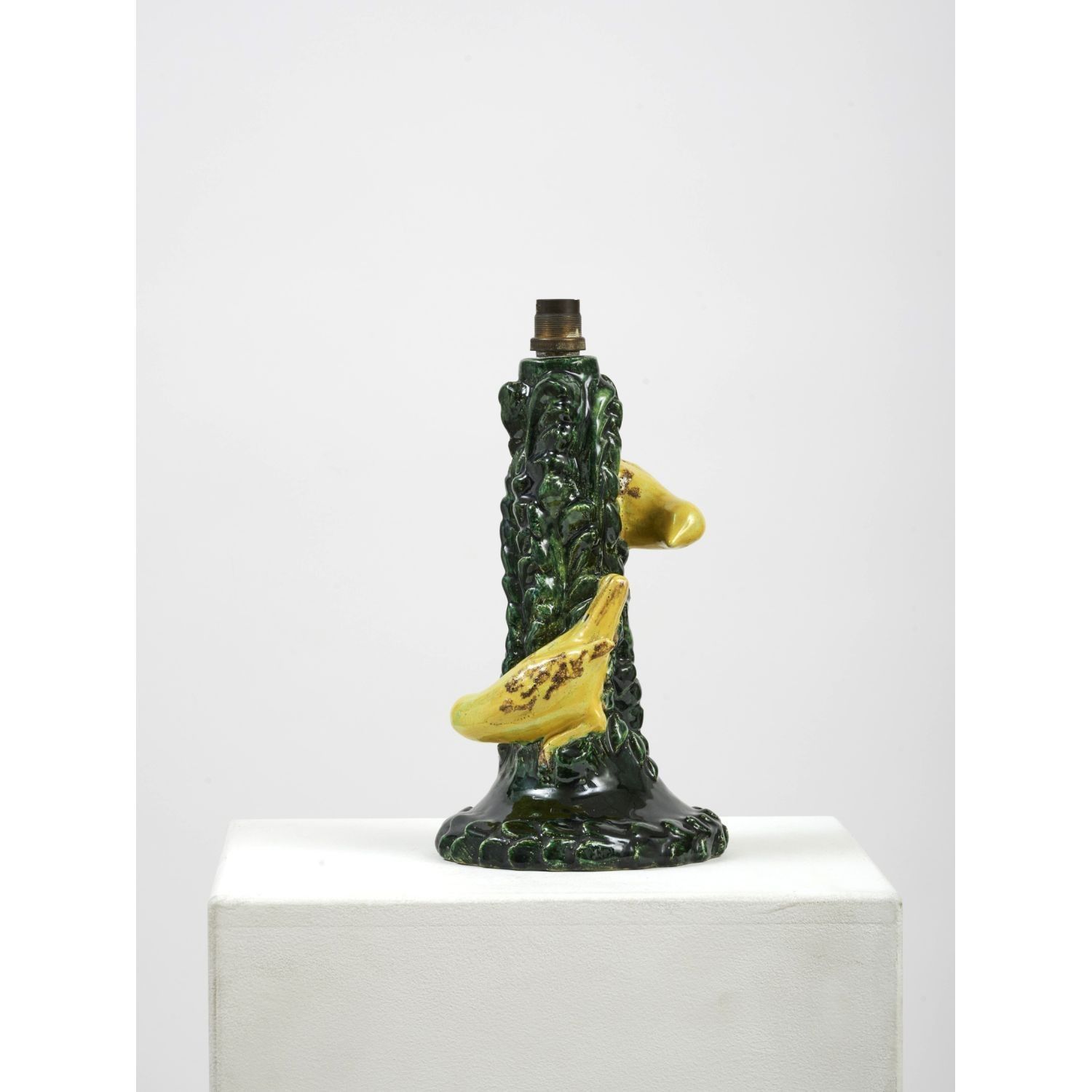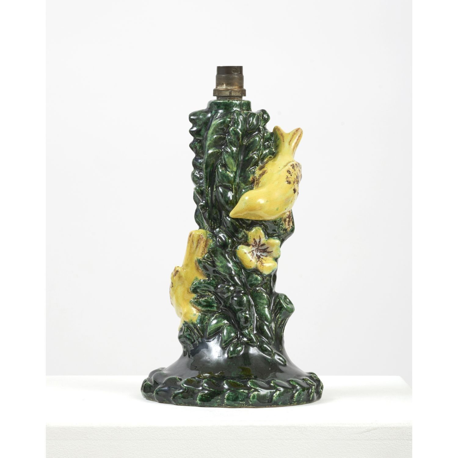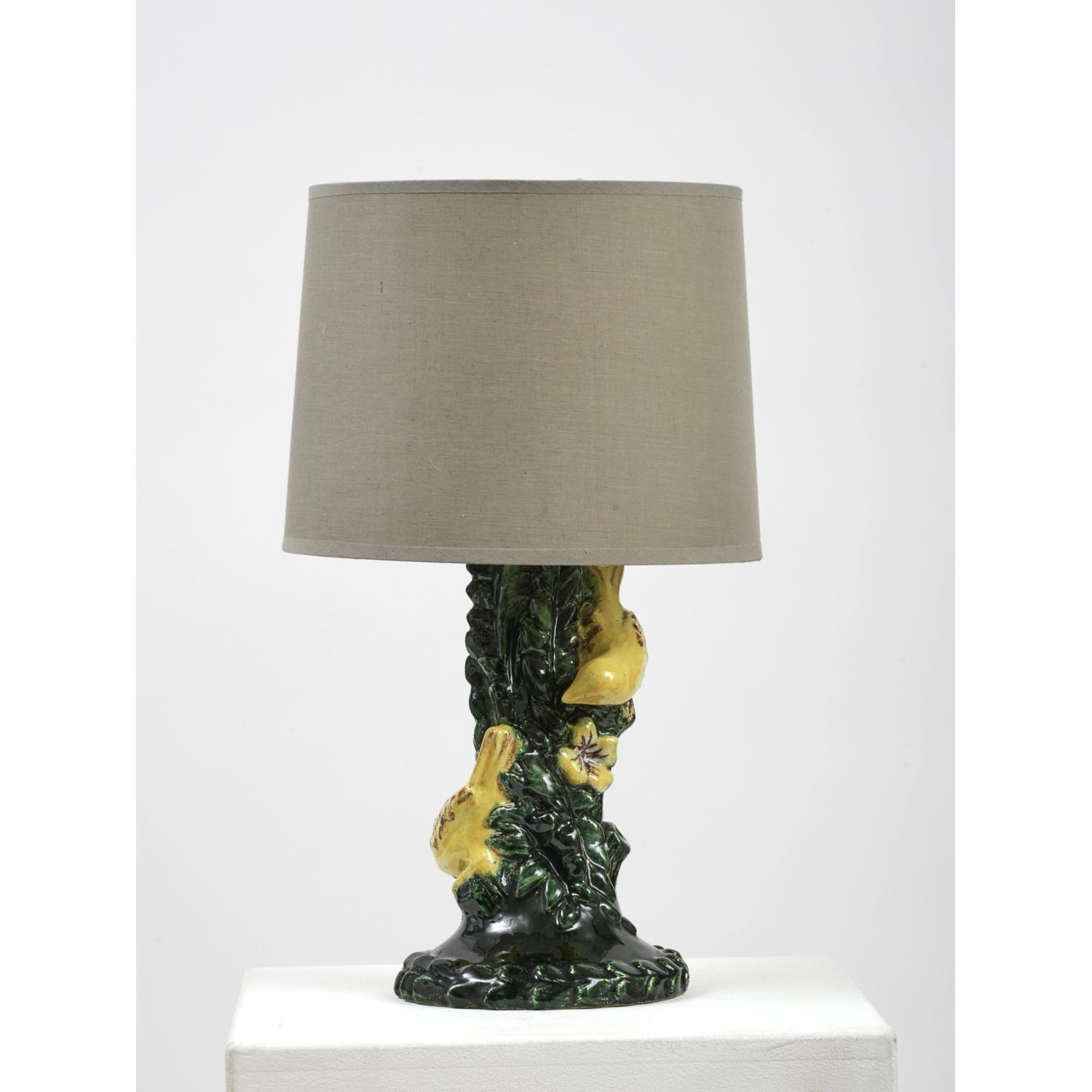 Green enamelled earthenware lamp base, the shaft symbolising a tree, the flared circular base underlined by a plant garland, two birds modelled in the round and two flowers in bas-relief enamelled yellow; later shade in grey cotton. Signed with the artist's stamp on the inside of the foot. Circa 1948
