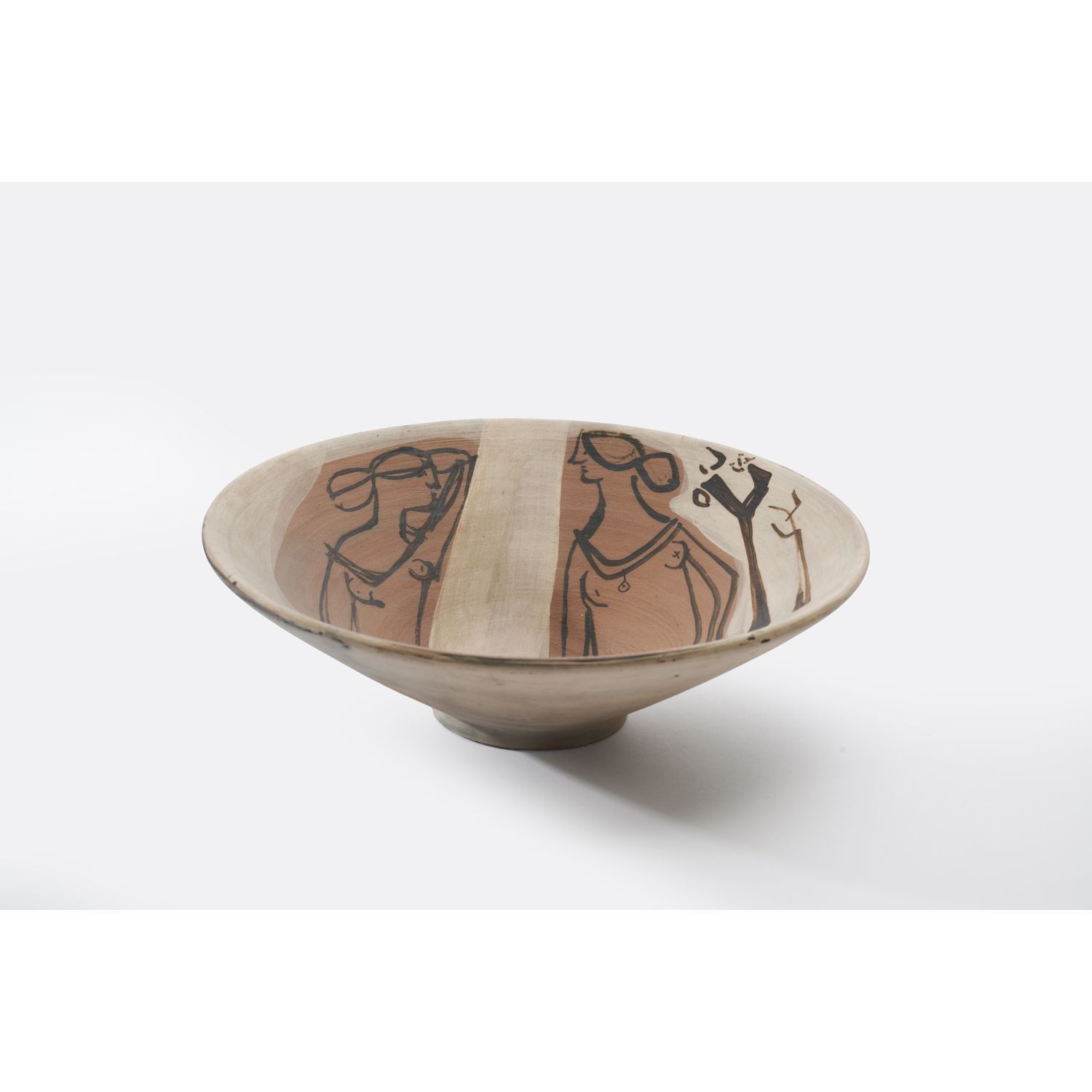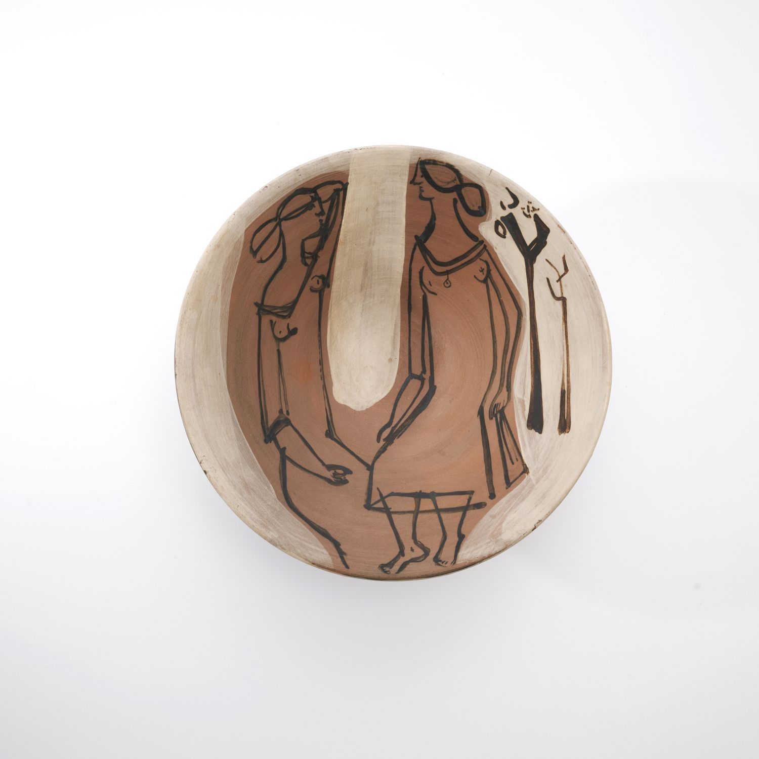 Earthenware bowl with painted decoration of two young women, partially in white slip. Signed with the artist's initials on the reverse of the base.