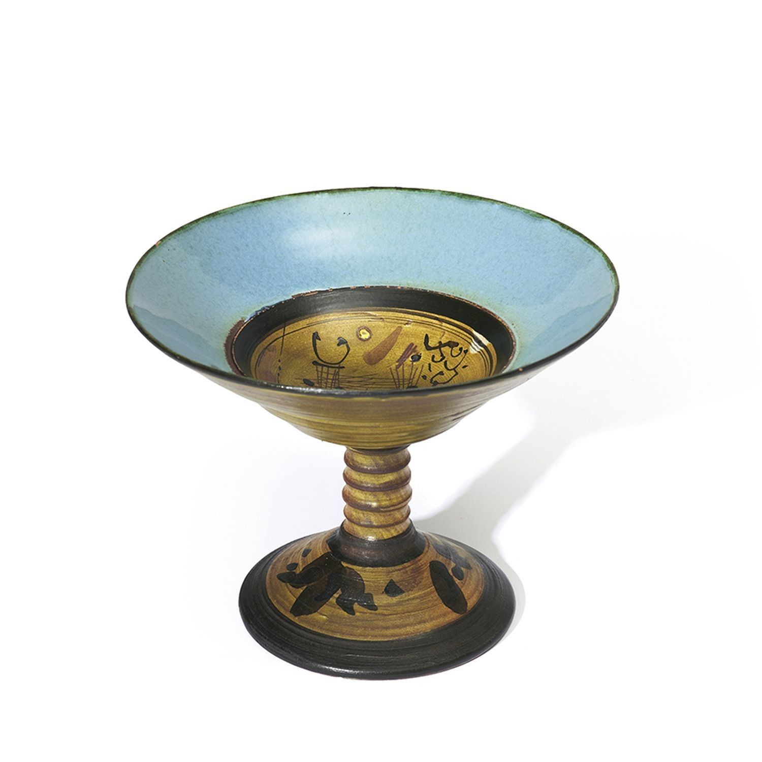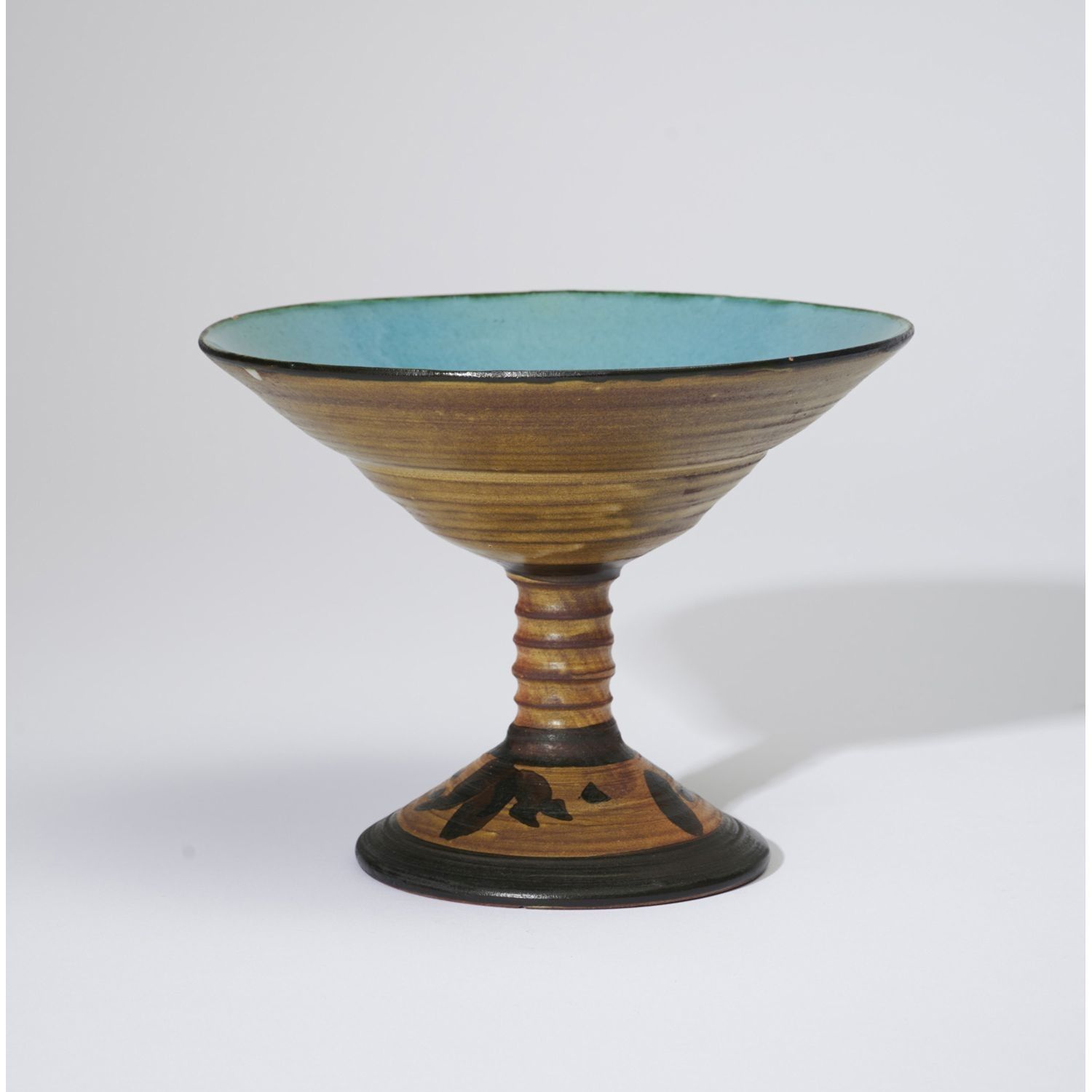 Small glazed earthenware bowl on a truncated cone-shaped base in black and brown slip, ringed shaft, painted abstract background, turquoise blue rim. The artist's monogram is signed on the reverse of the base.
