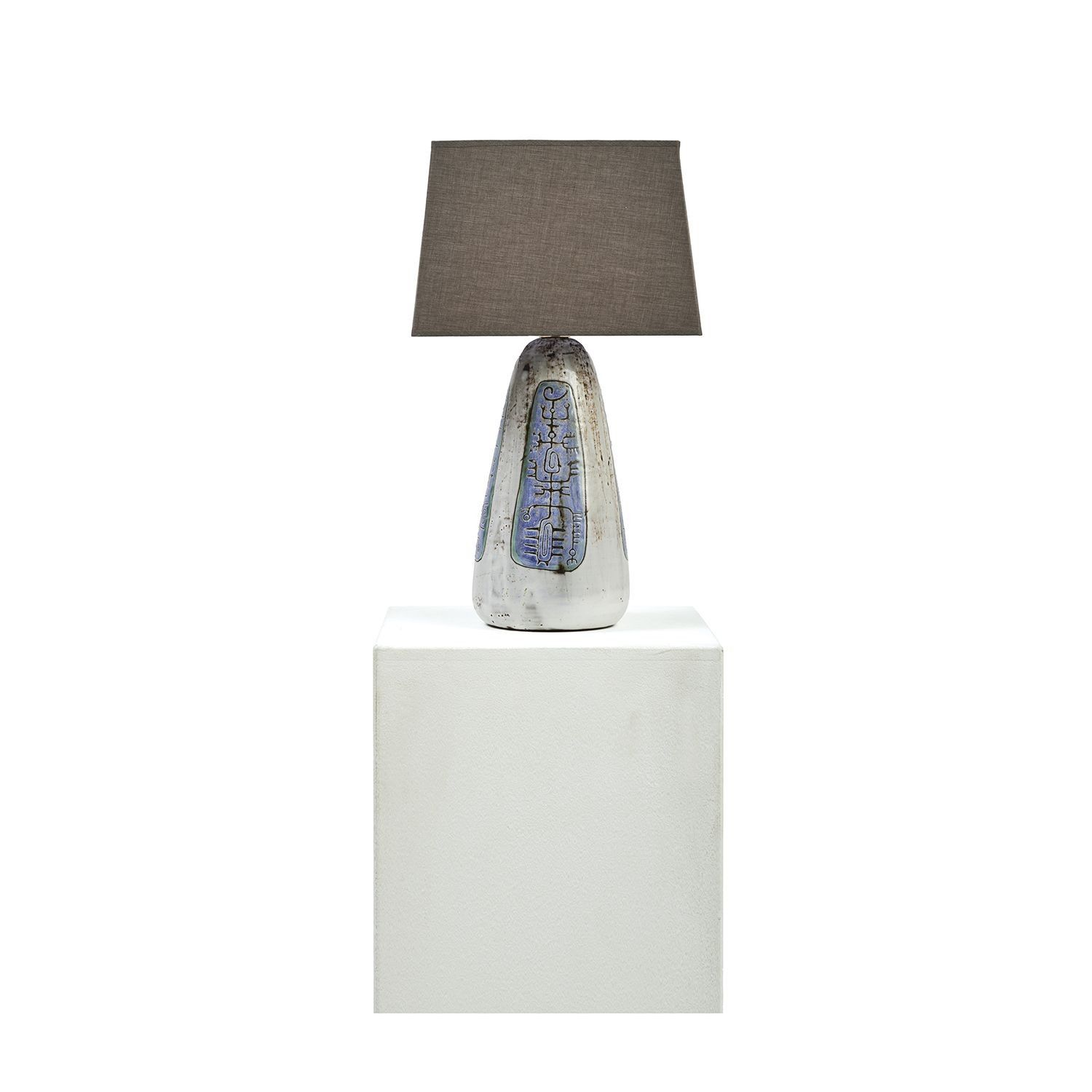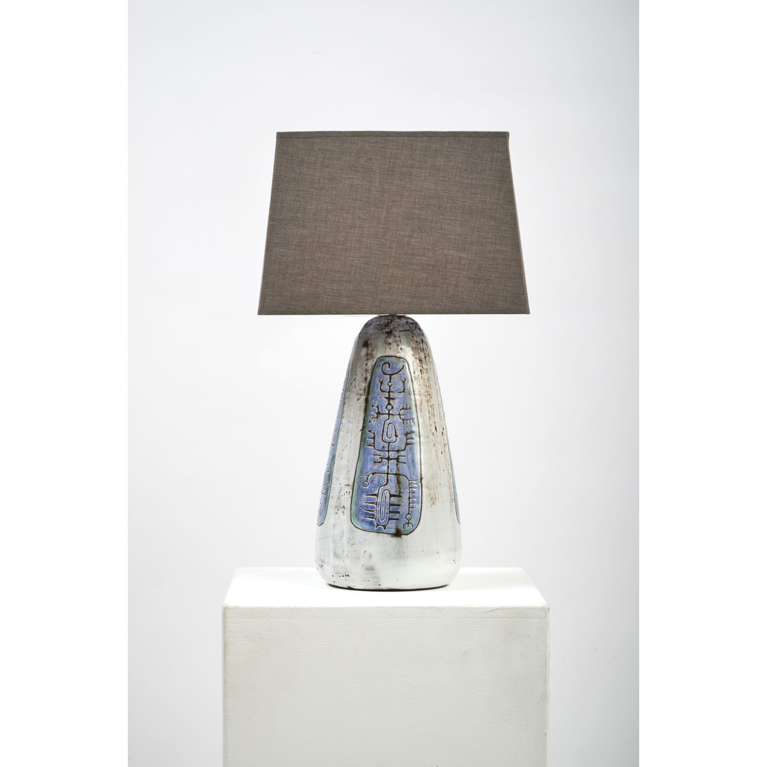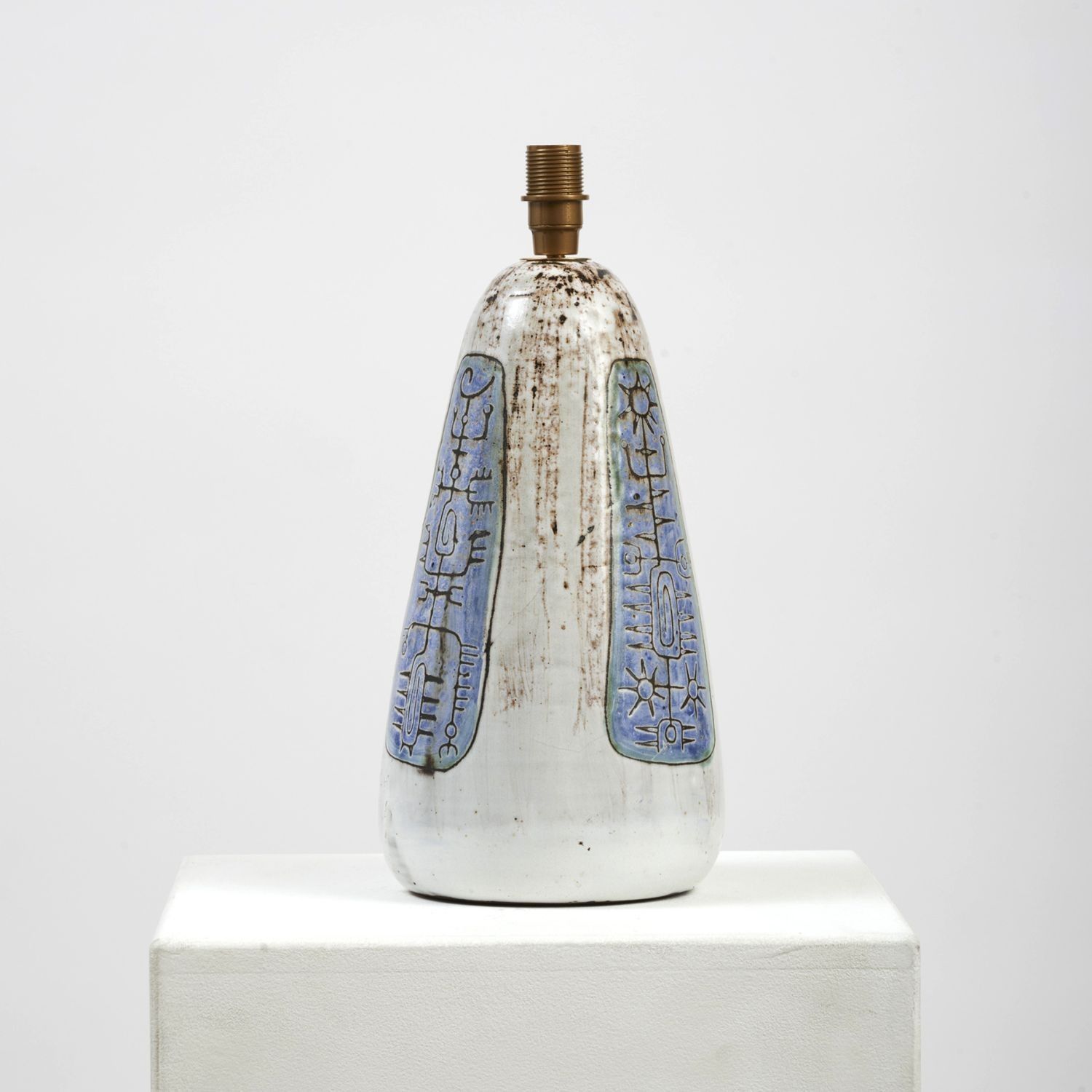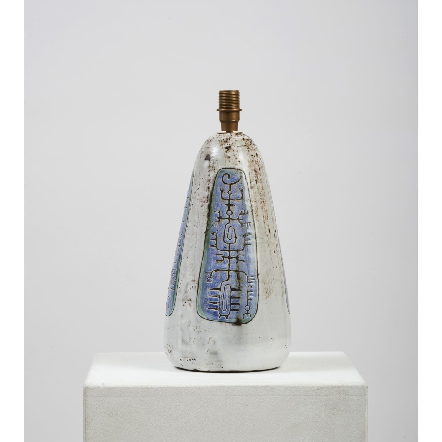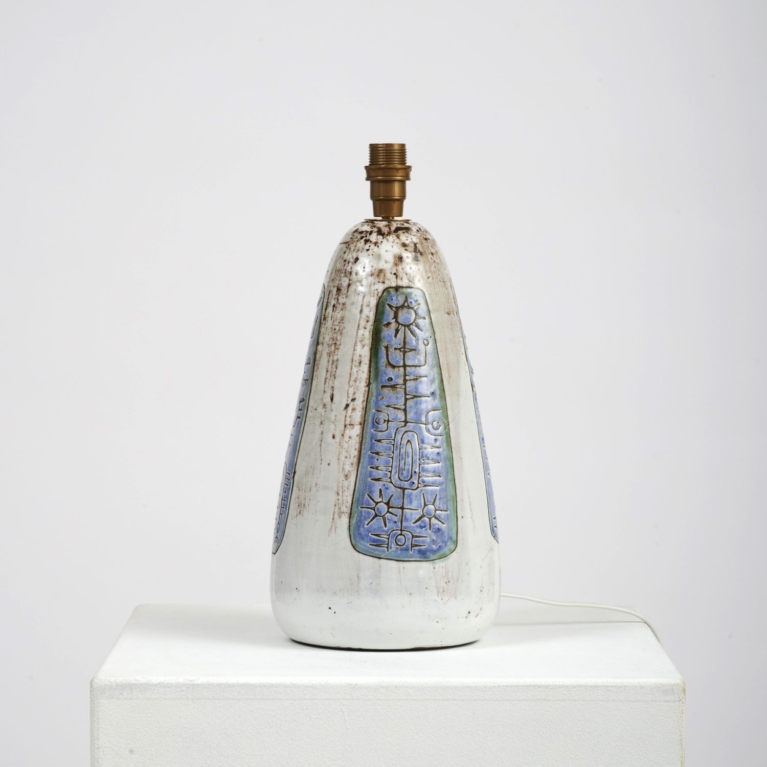 Ovoid lamp base in beige and brown glazed earthenware decorated with large solid colours on a lavender blue background, engraved with runic motifs. Incised handwritten signature "Jean Rivier" on the reverse of the base.