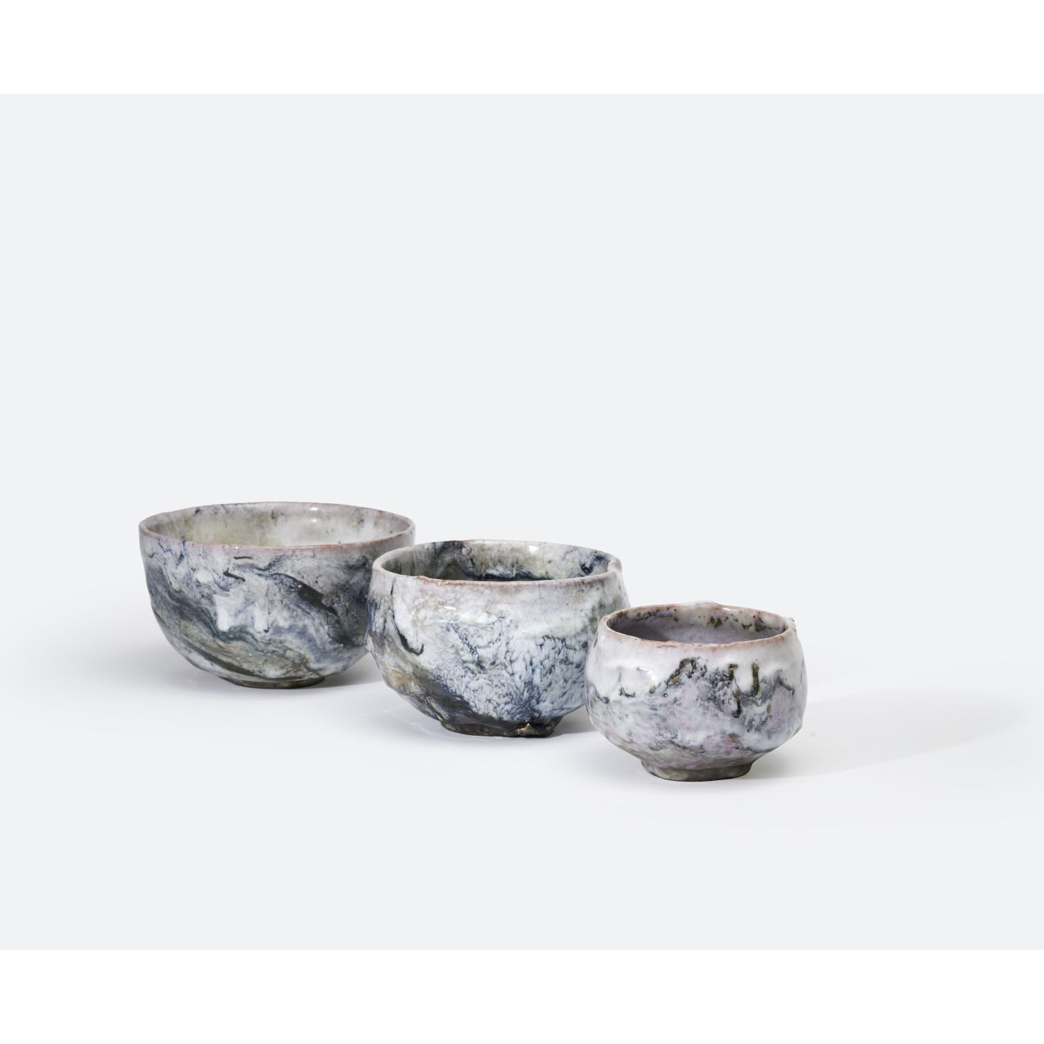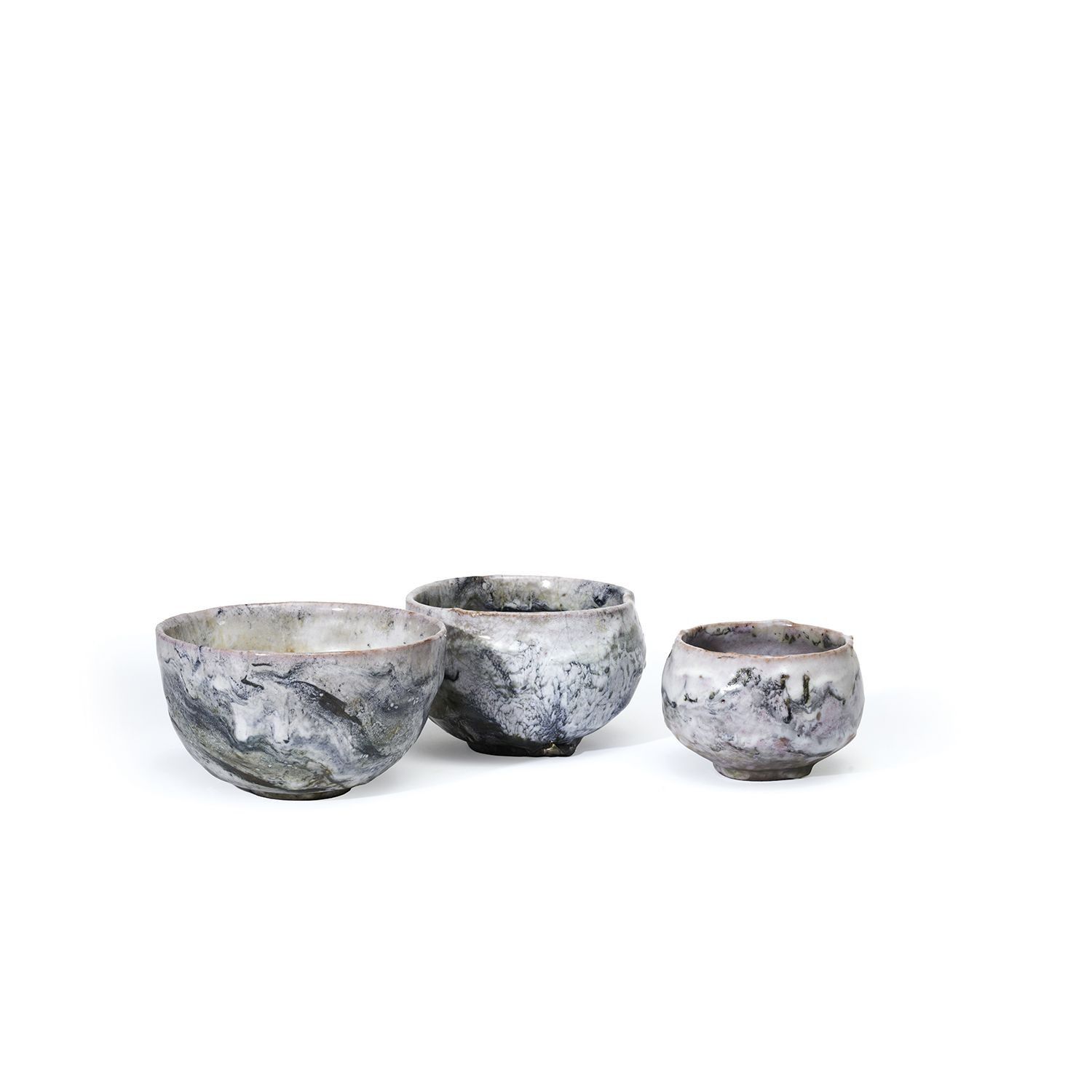 Set of three stoneware bowls decorated with thick layers of shaded enamel forming jaspures. Stamped GBG on the reverse of each piece.