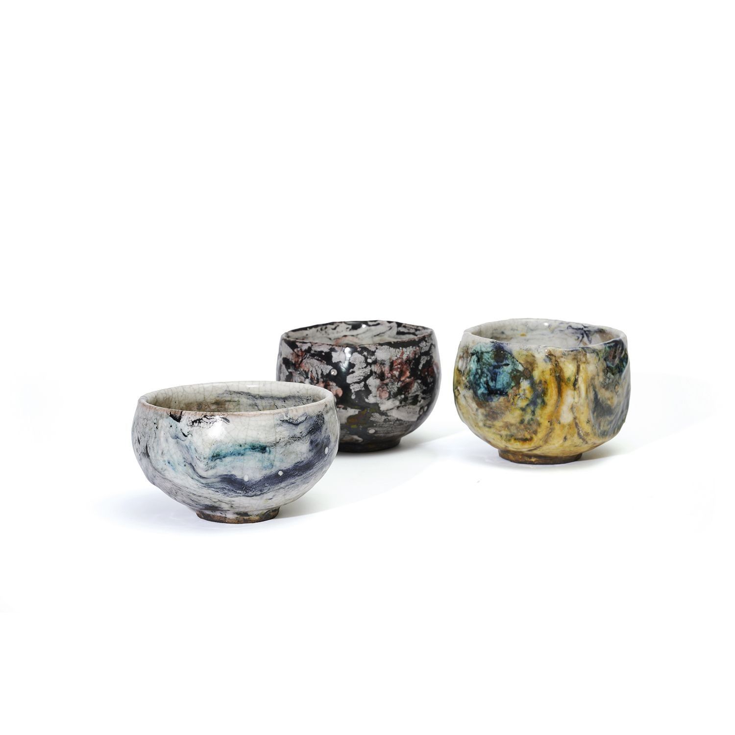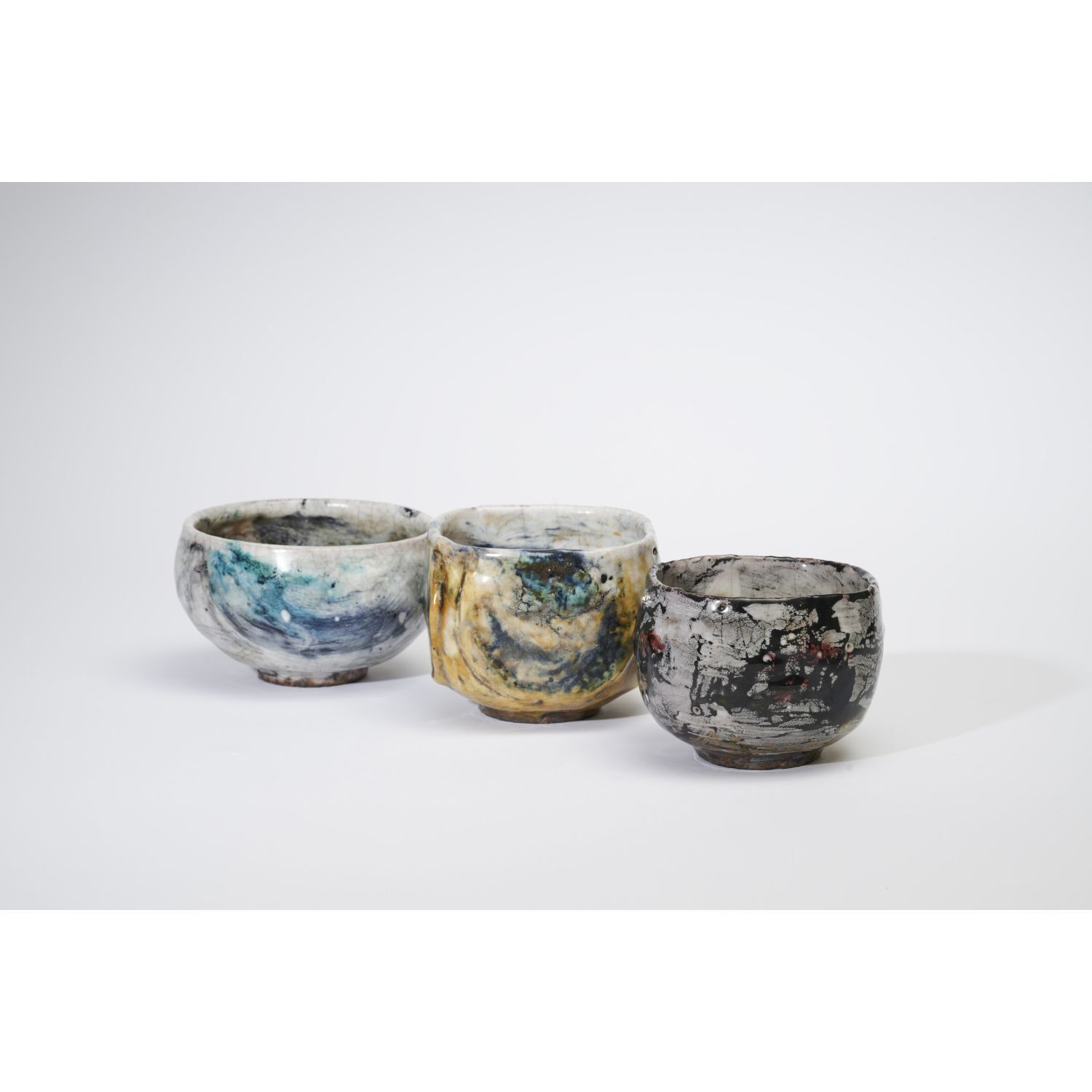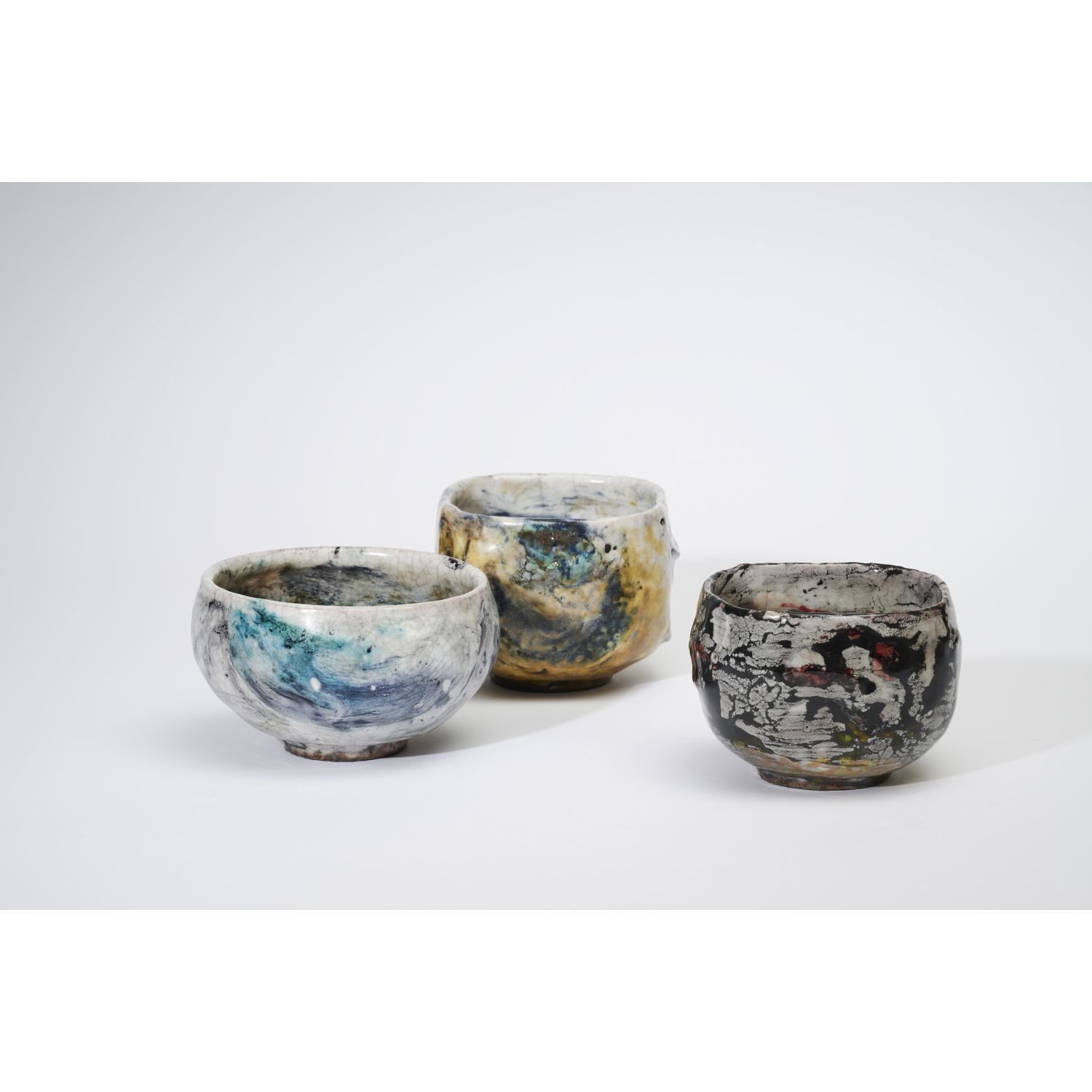 Set of three polychrome enamelled stoneware bowls. Stamped GBG or the artist's initials embossed on the reverse of each piece.