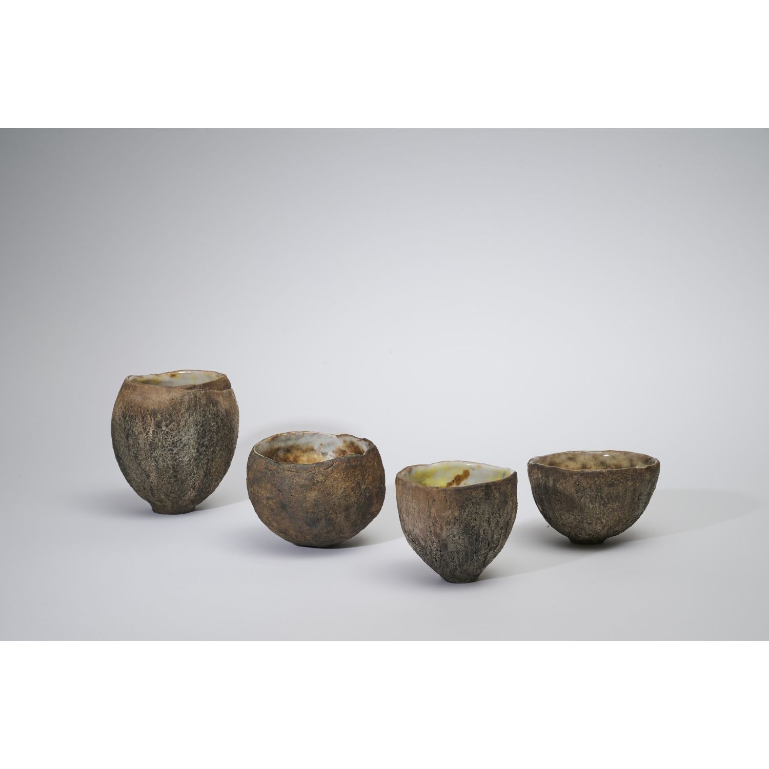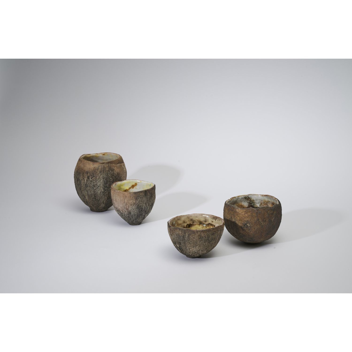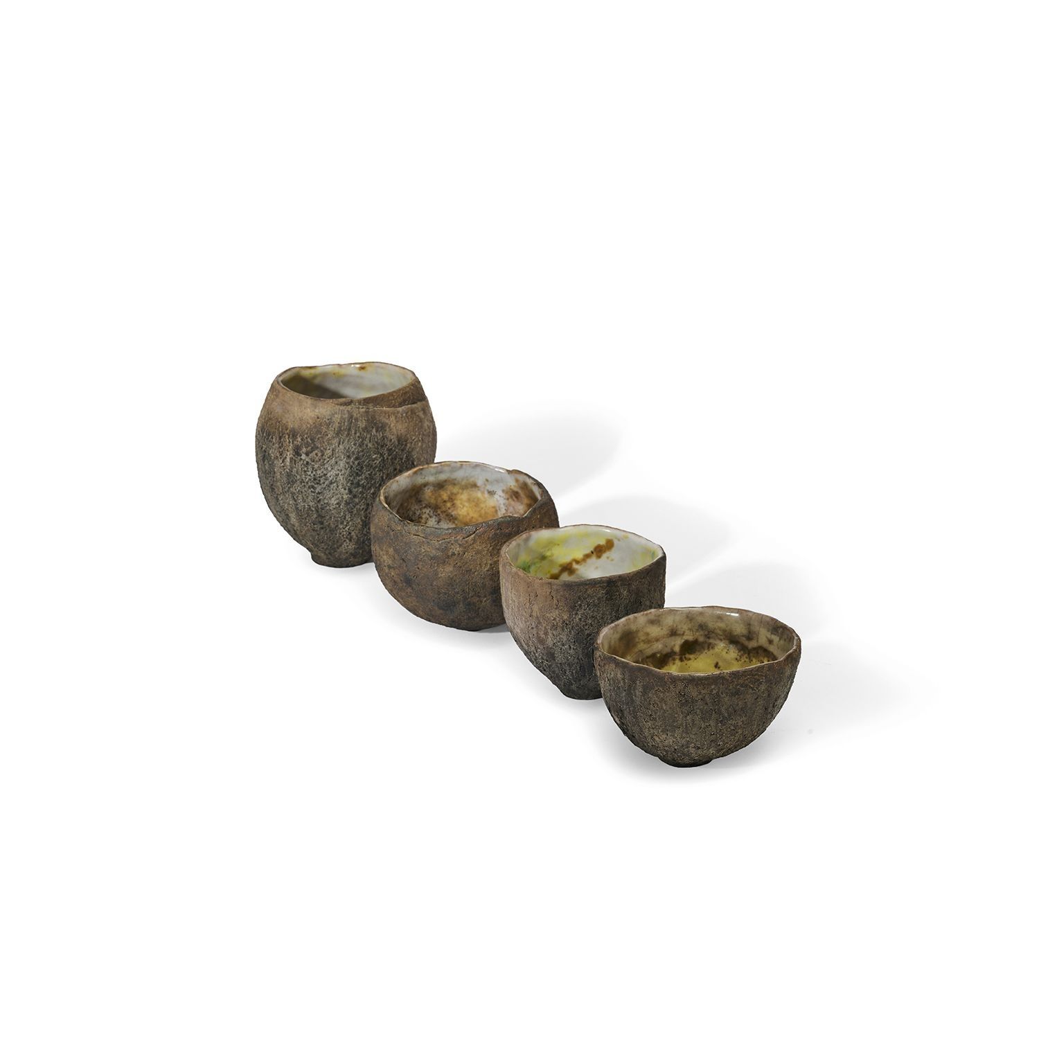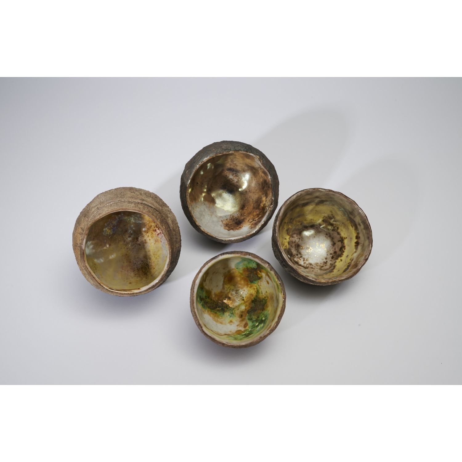 Set of four pieces comprising three bowls and a vase, in bark-like textured stoneware with brown slip on the outside and yellow, green, beige and gold mottled glaze on the inside. Stamped GBG on the reverse of three of the pieces.
