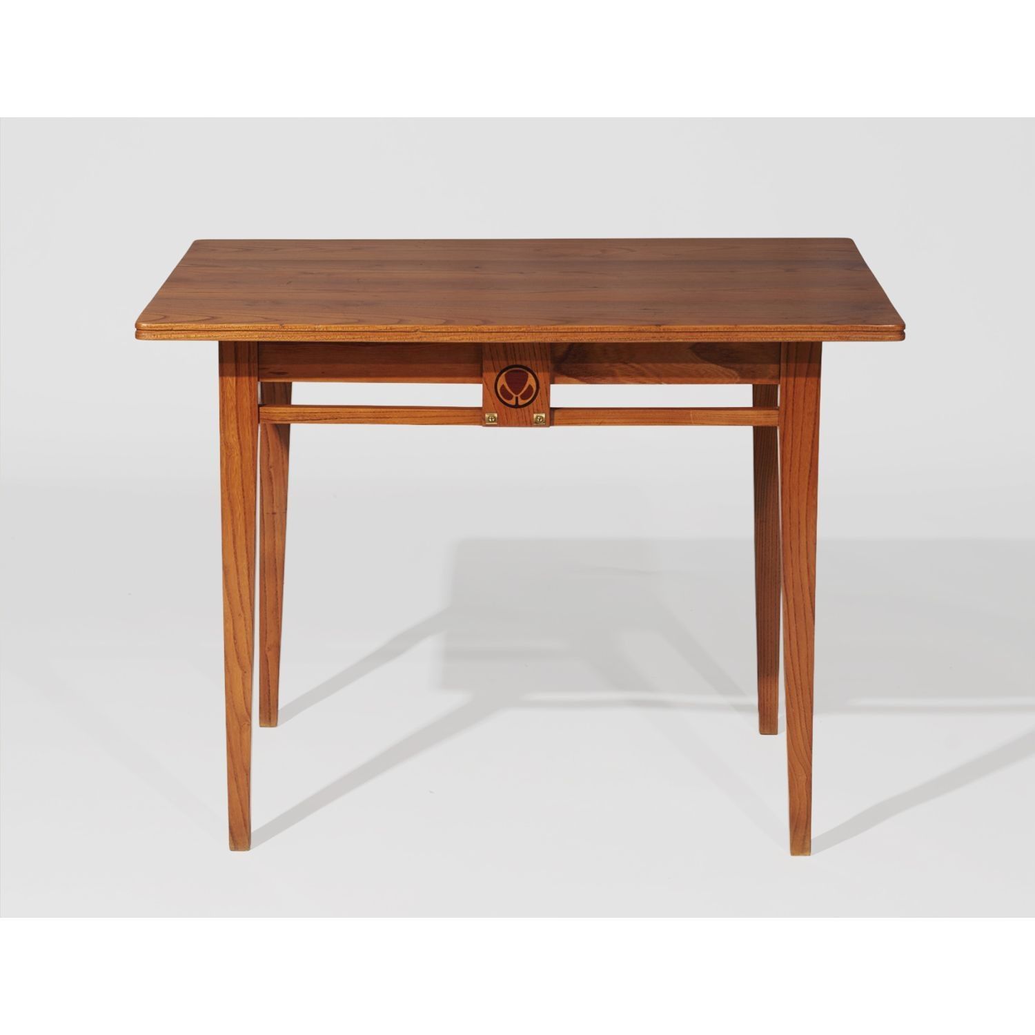 Magnolia" set comprising a small varnished elm table and chair, decorated with floral marquetry and gilded brass facings. The table has a rectangular top resting on tapering legs joined under the top by a wide cut-out belt showing the decoration. Chair with straight openwork back decorated with a flower. Circa 1905