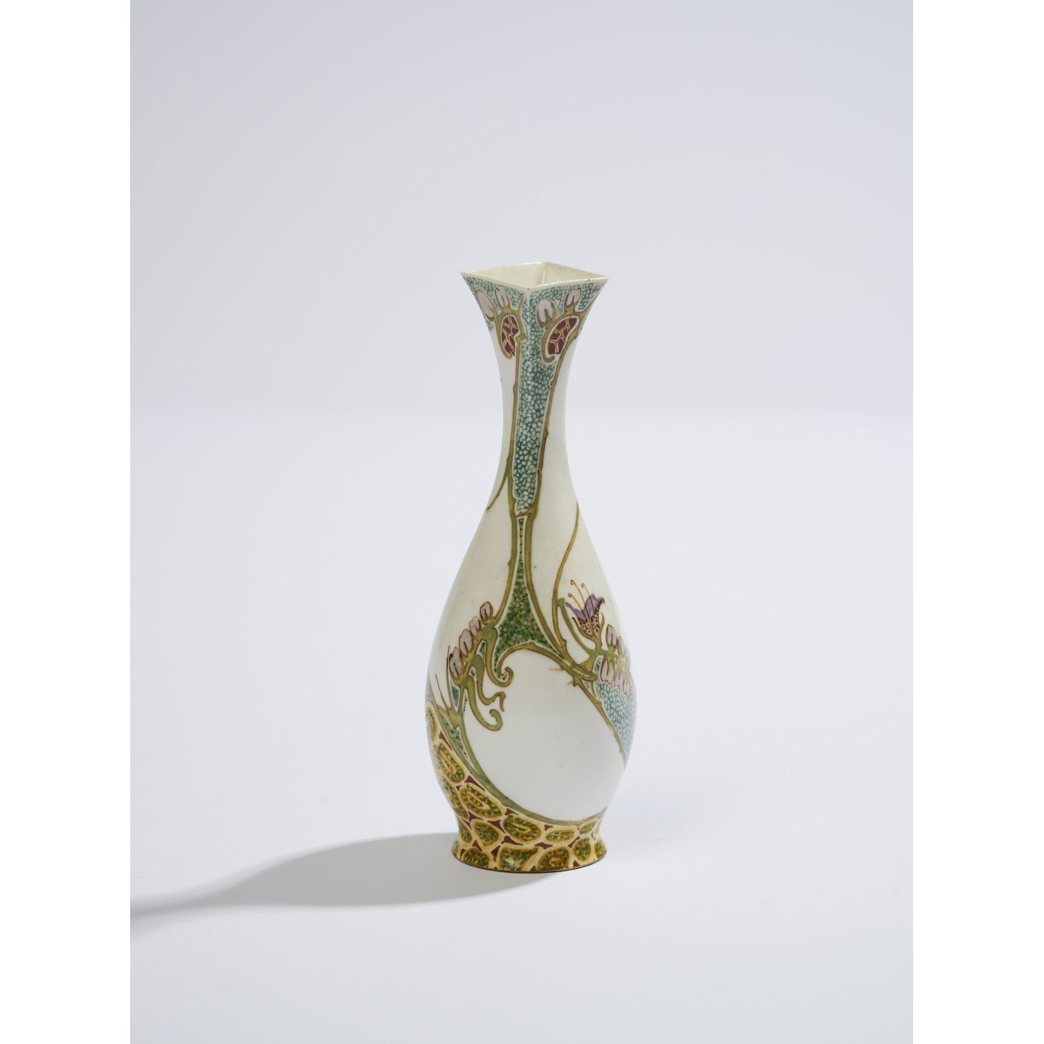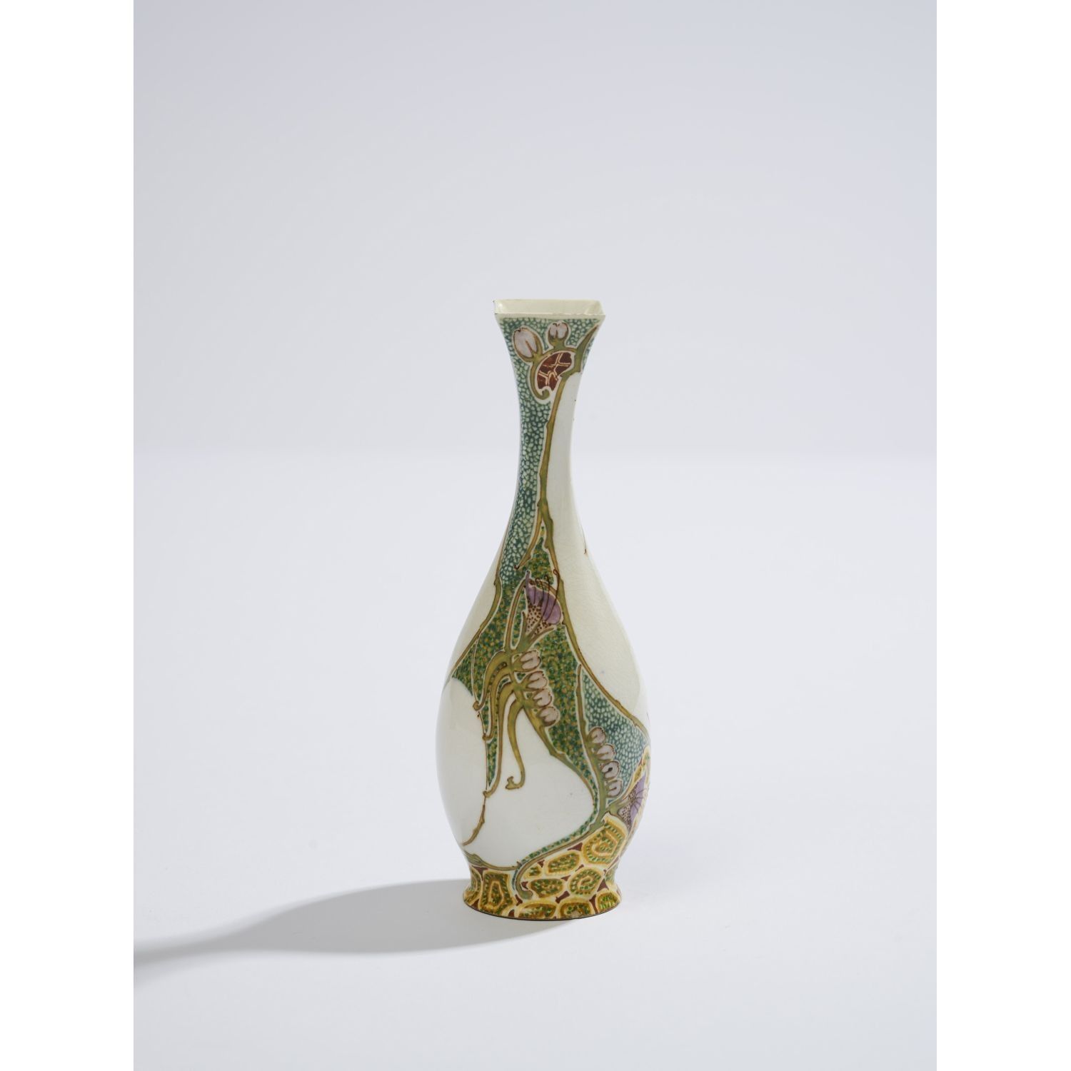 Eggshell porcelain piriform vase with quadrangular neck, delicate polychrome enamelled floral decoration. Handwritten signature "Rozenburg den Haag 1819" embellished with a bee and a stork on the reverse of the base, as well as the mark of Jacobus Verhoog. Circa 1899/1900.