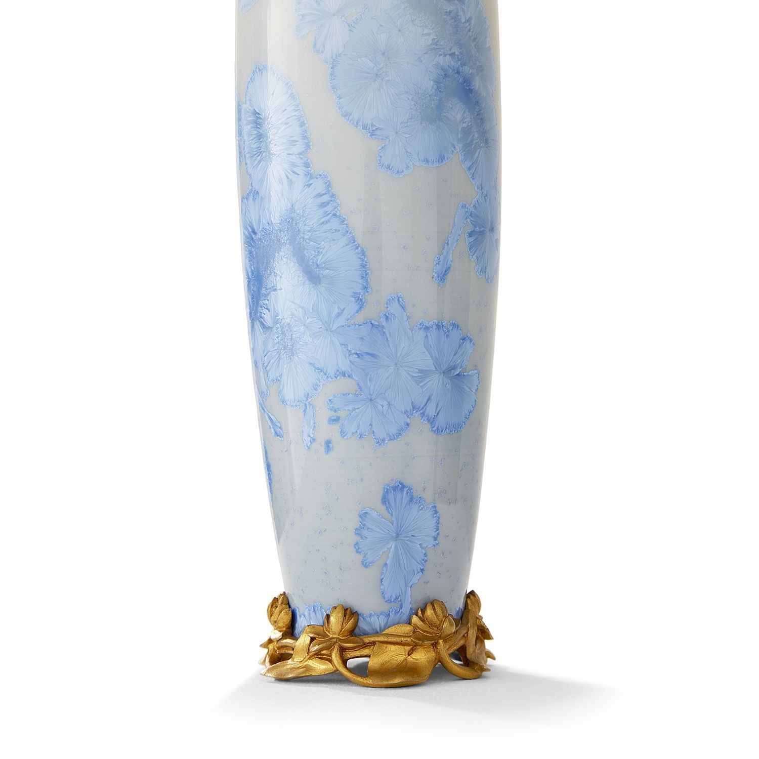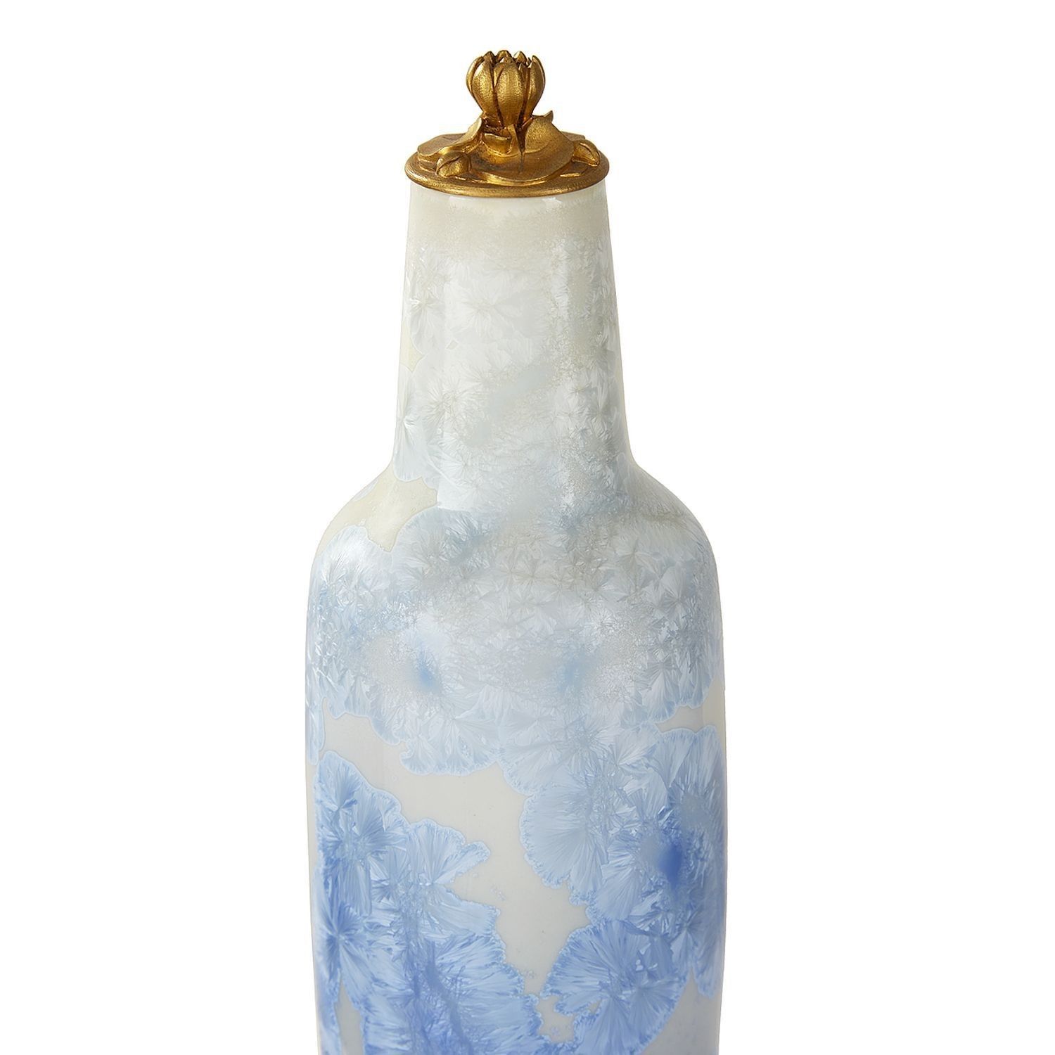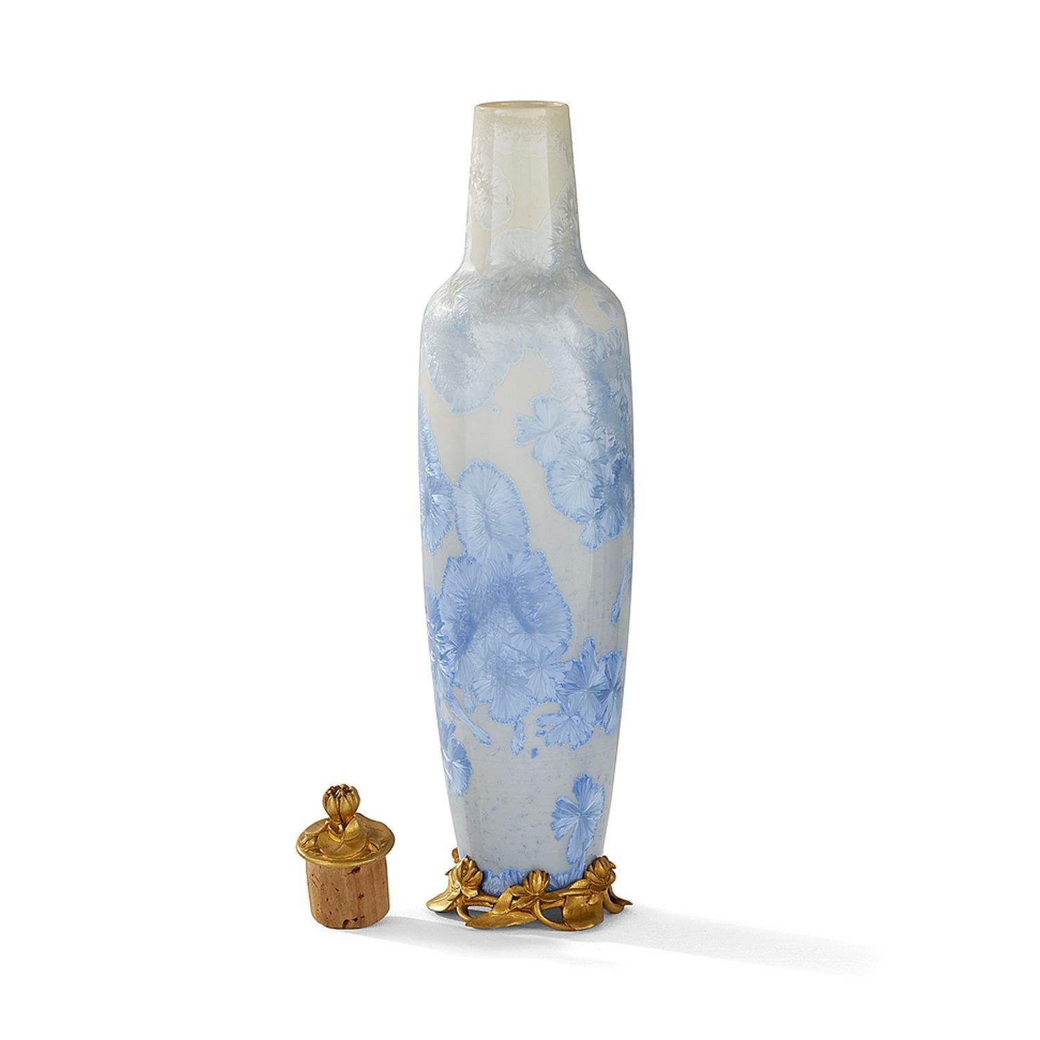 De Chevilly rond" vase in new paste with pale blue crystallisation decoration, gilt bronze mounting and stopper decorated with leaves and water lily flowers. Mark of the Manufacture "S 1900" in a black triangle and inscription "AV 007 PN" on the reverse of the base.