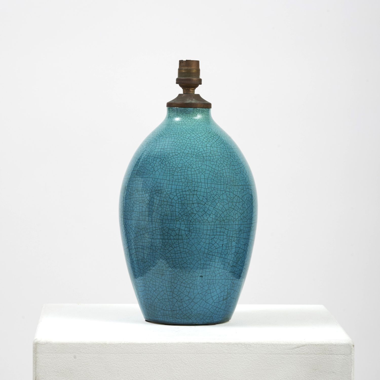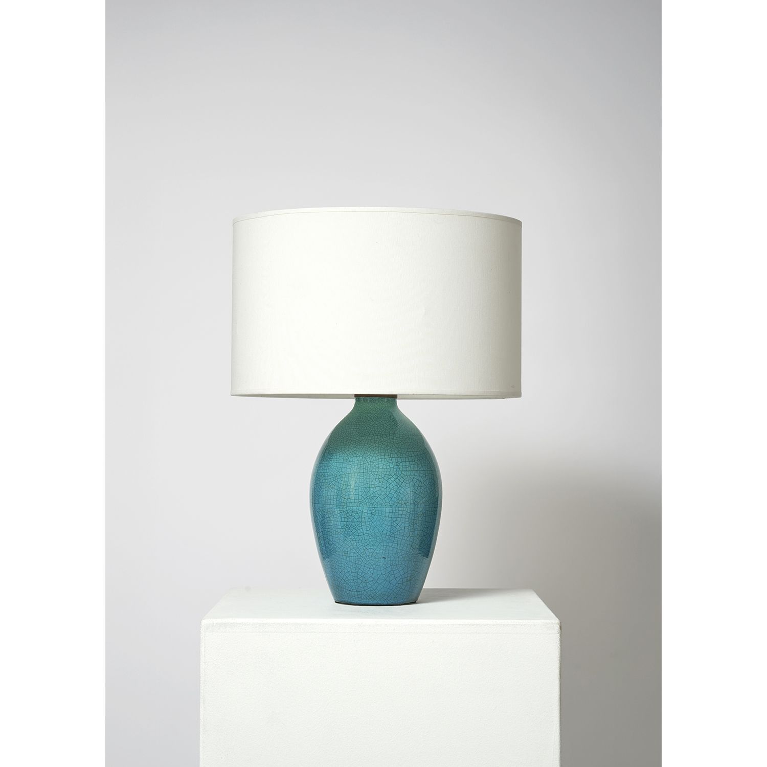 Earthenware egg-shaped lamp base, glazed in turquoise blue under a cracked white glaze. Signed "Jean Besnard France" on the reverse of the base. A white lampshade is included.
