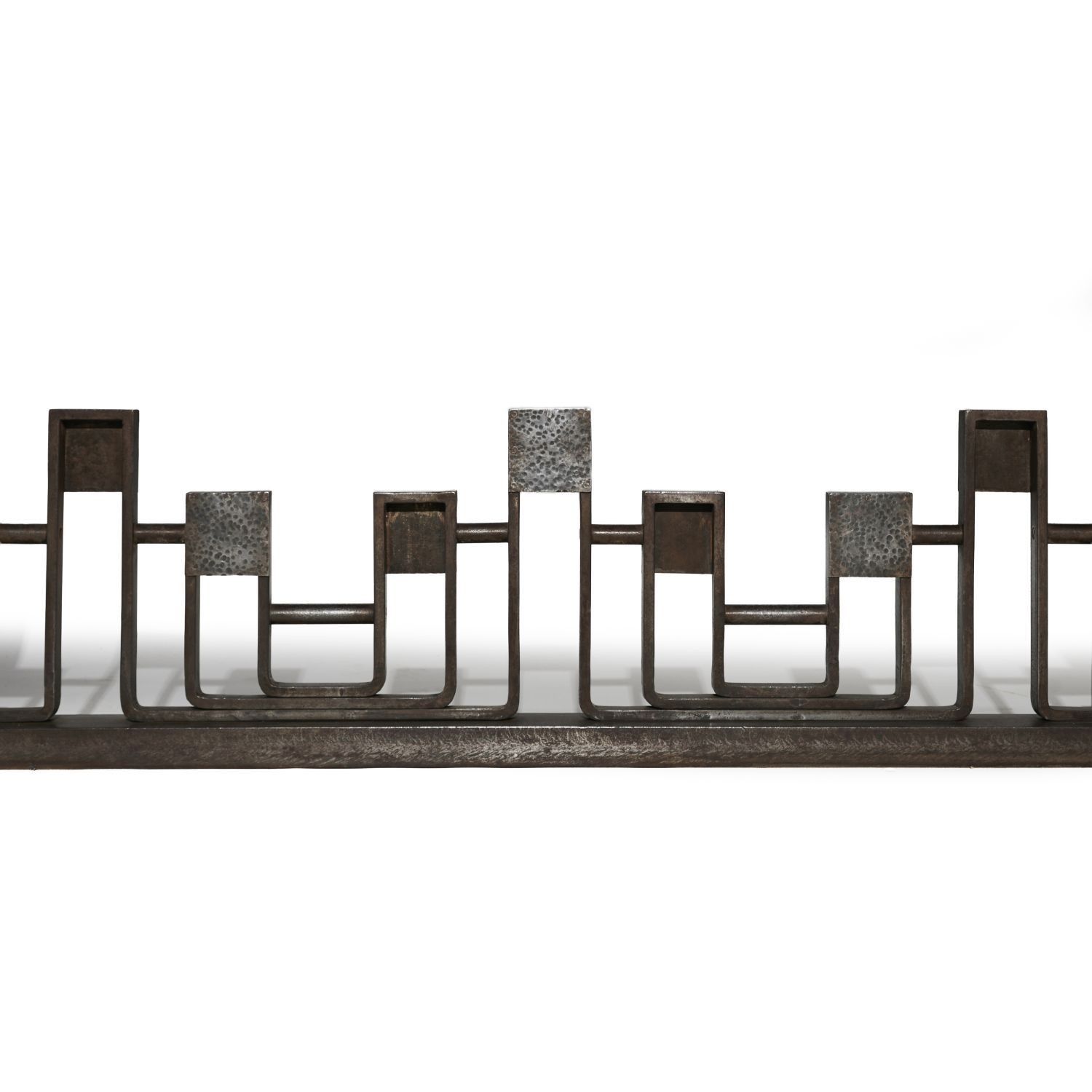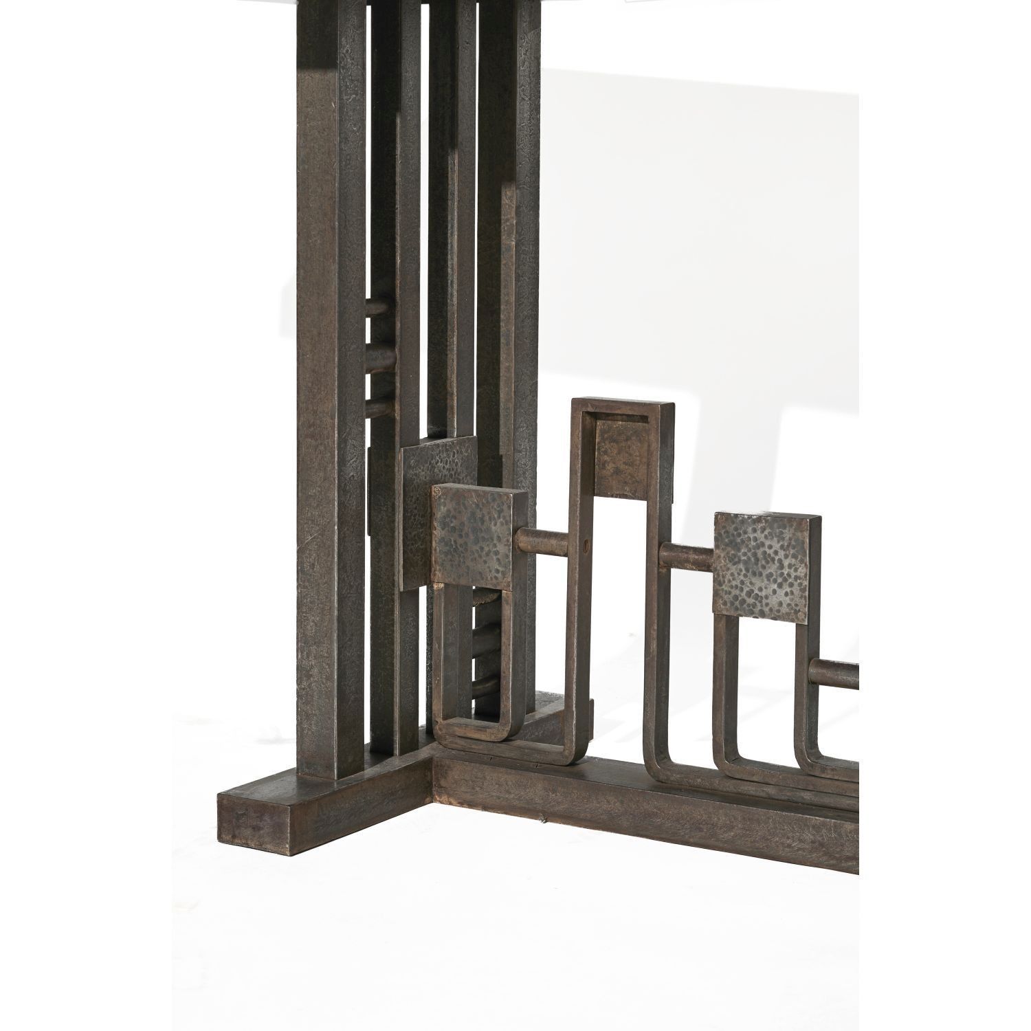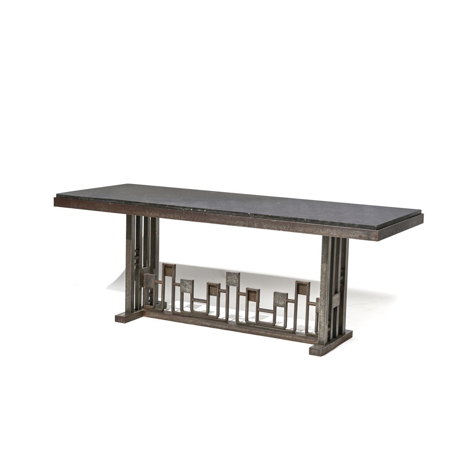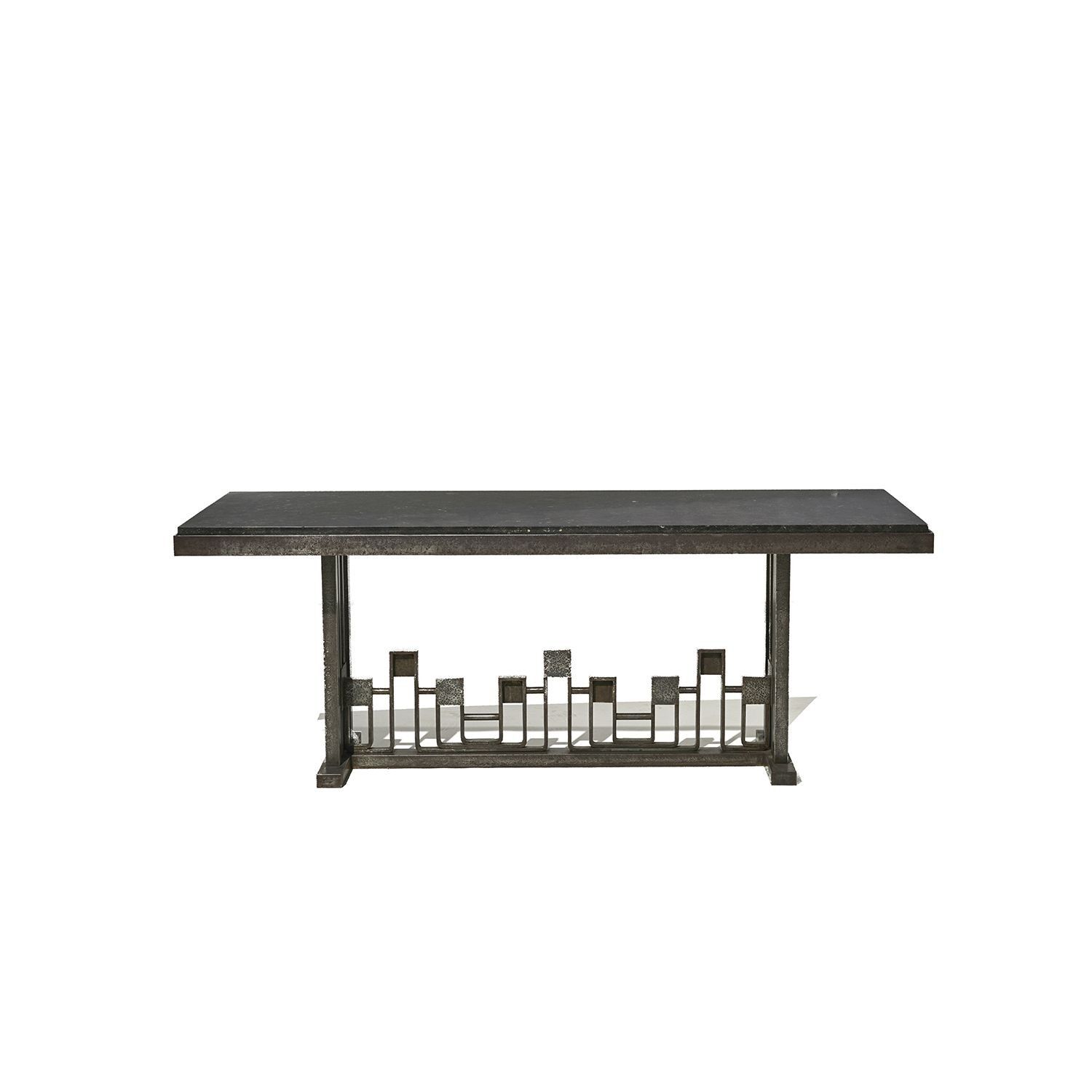 Wrought-iron dining table with a rectangular top in anthracite grey marble, supported by L-shaped legs linked by a brace with geometric decoration evoking an architectural composition. Unsigned. Circa 1930