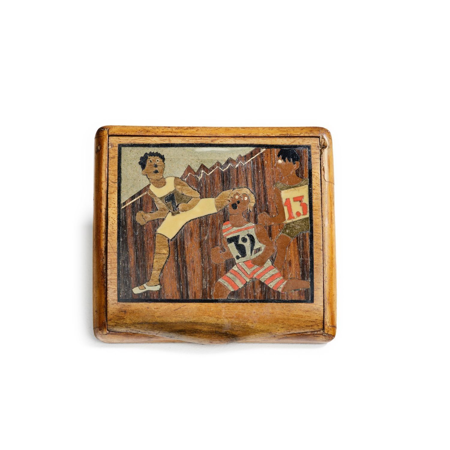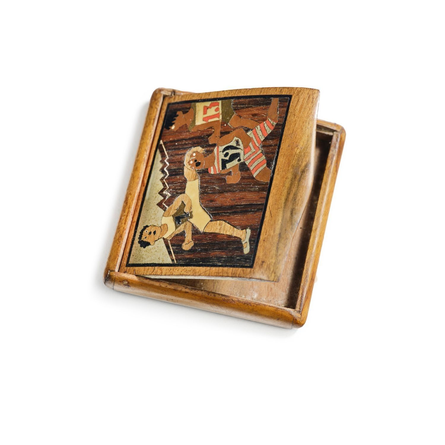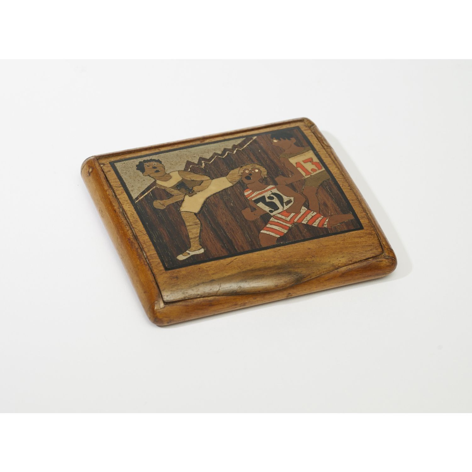 Cigarette box in cherry wood, with a lid decorated with bakelite and lacquer marquetry on the theme of sport. Circa 1922