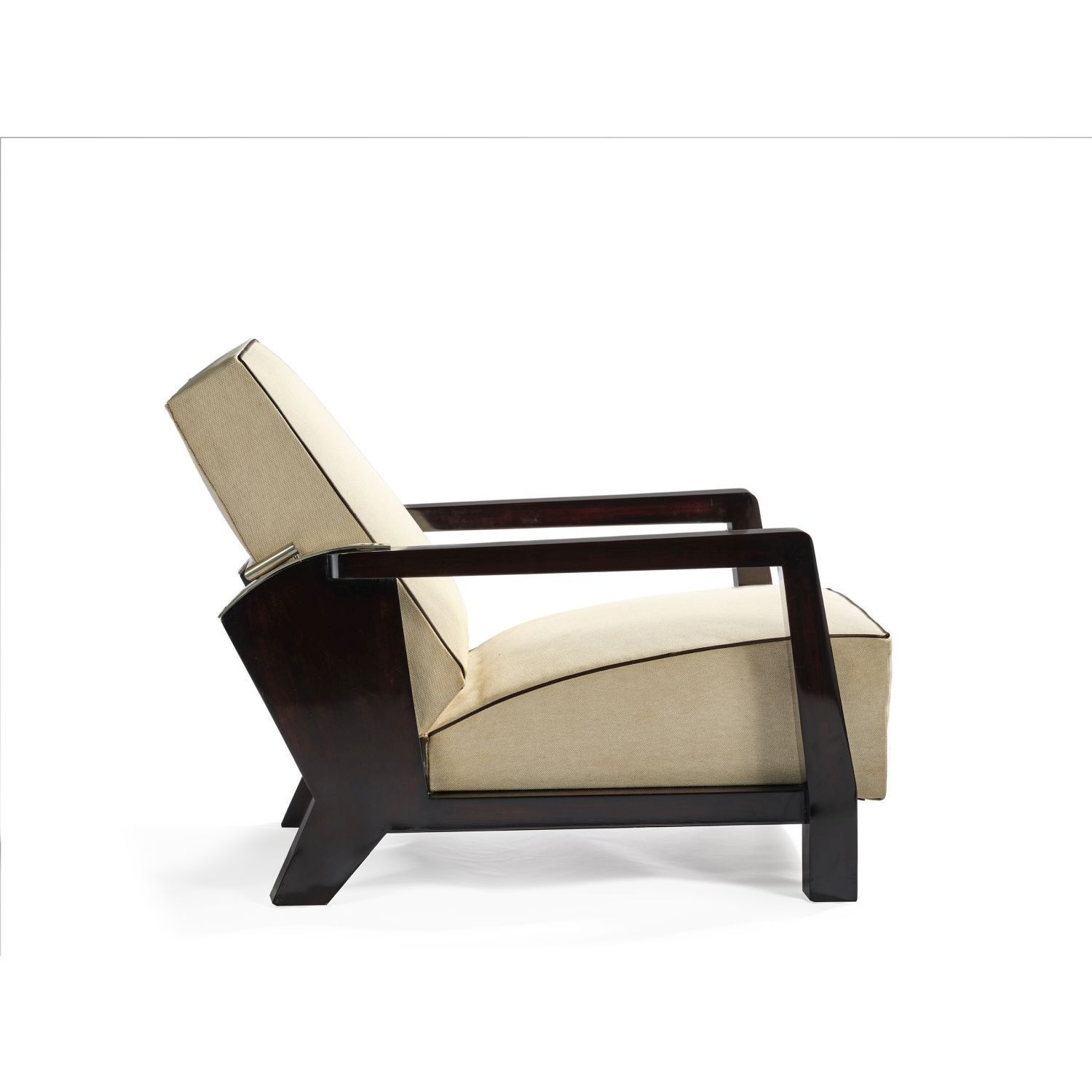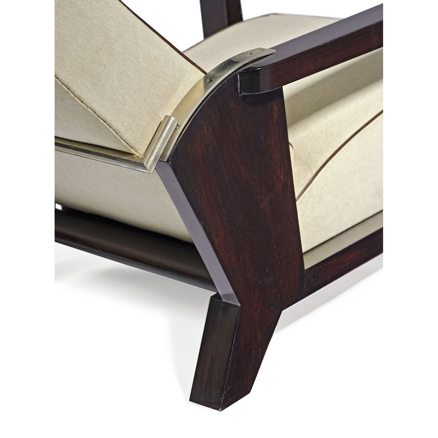 Modernist armchair with variable tilt, in stained and varnished beech. Seat and backrest upholstered in beige Hermès fabric with brown leather piping. Tilt adjustment system on the back of the seat, consisting of a rack and a nickel-plated metal bar. Circa 1935