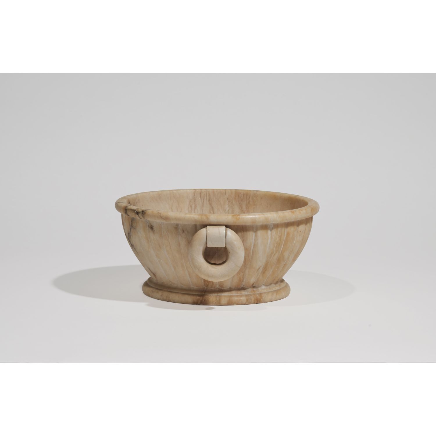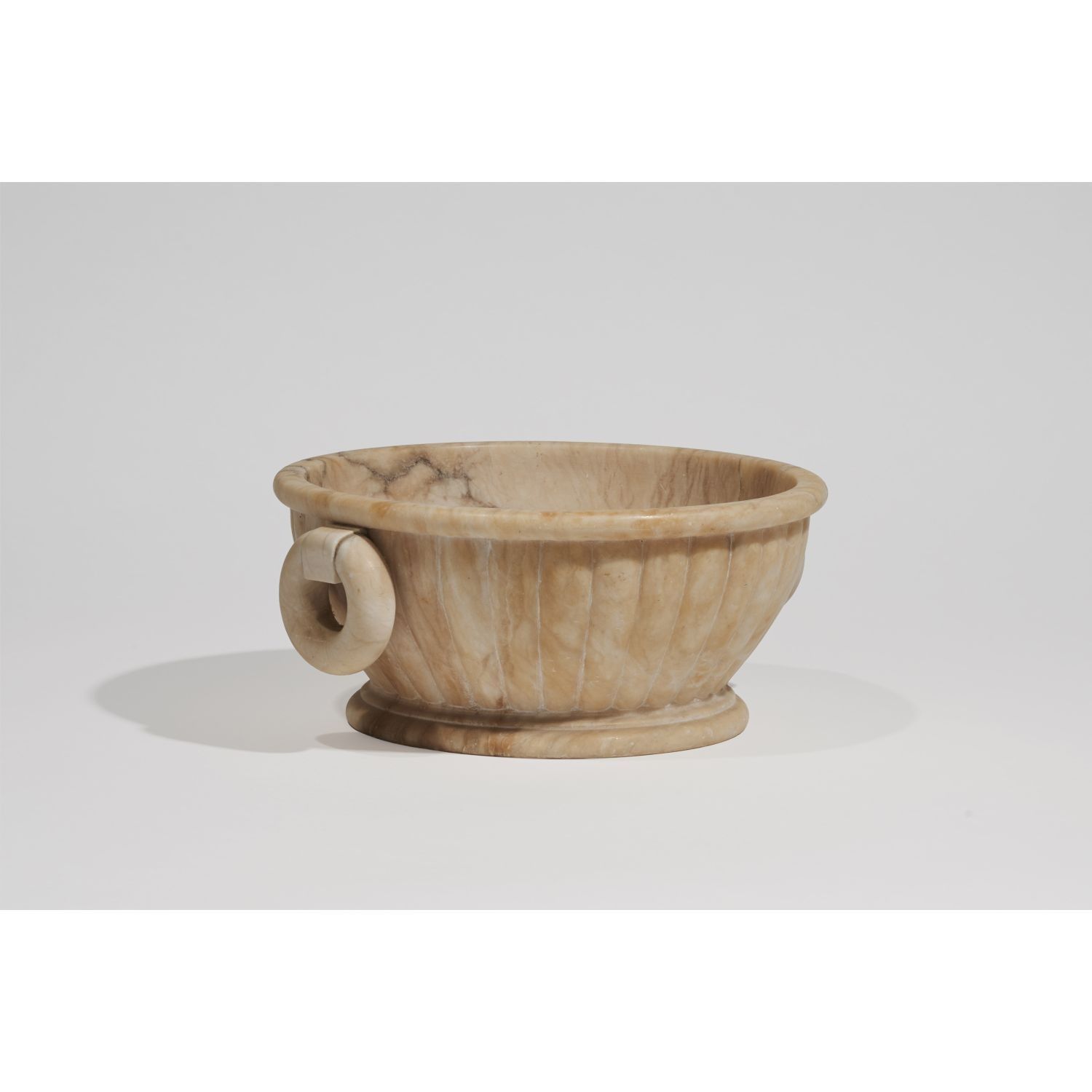Neoclassical alabaster bowl with fluted body, framed by two ring-shaped handles.