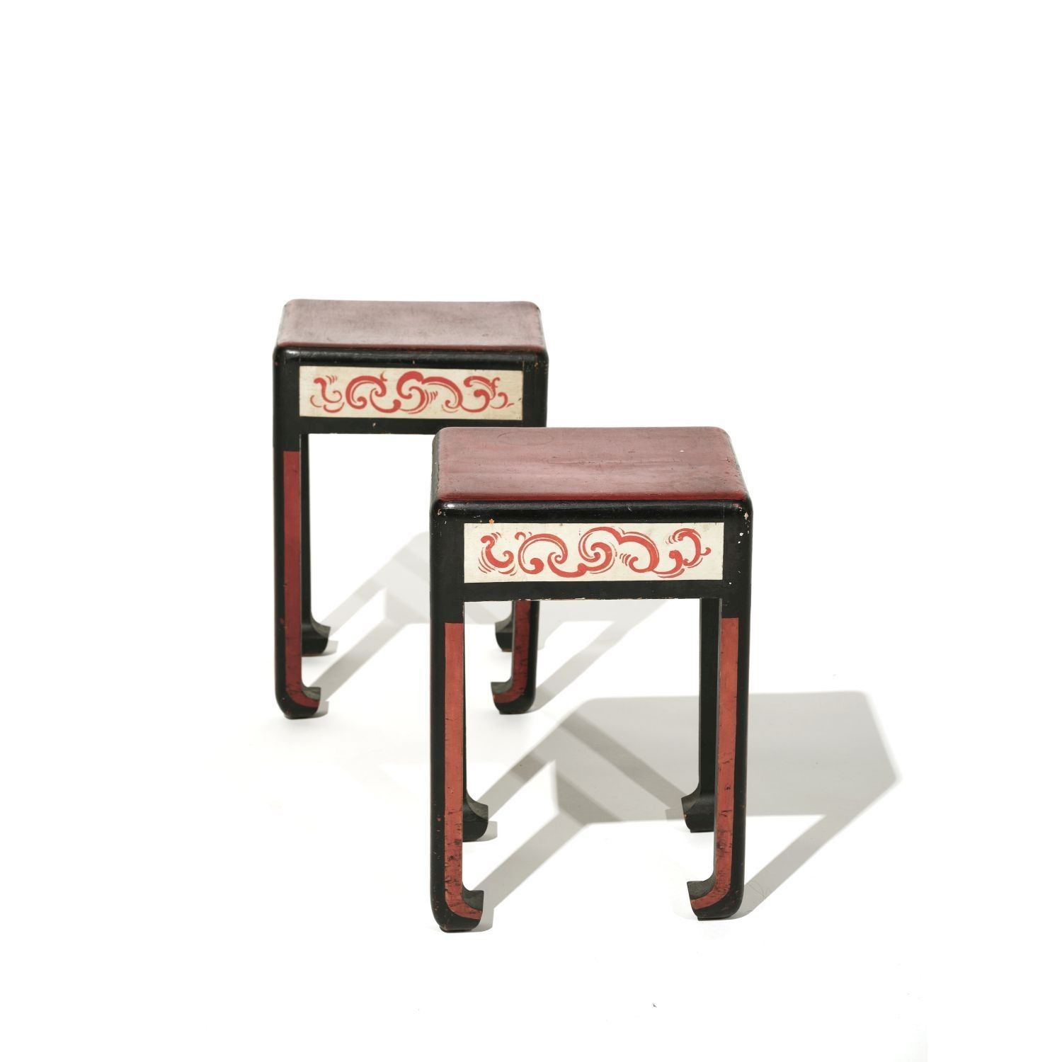 Pair of small black and red lacquered wooden sofa ends, with square top, waistband outlined with white bands and decorated with red ovals, resting on Japanese-style legs.