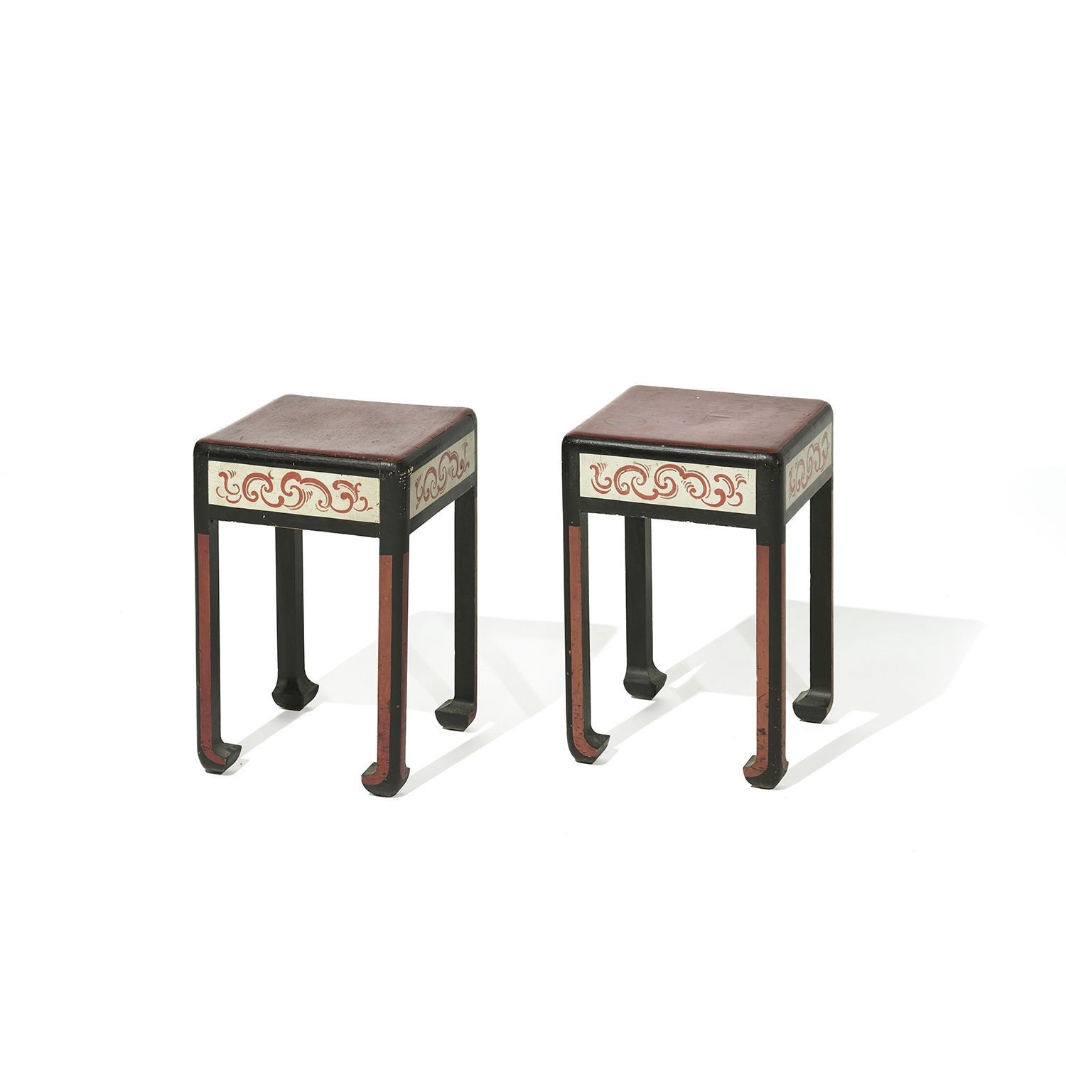 A pair of small lacquered wood side tables. (Wear, scratches, and stains)