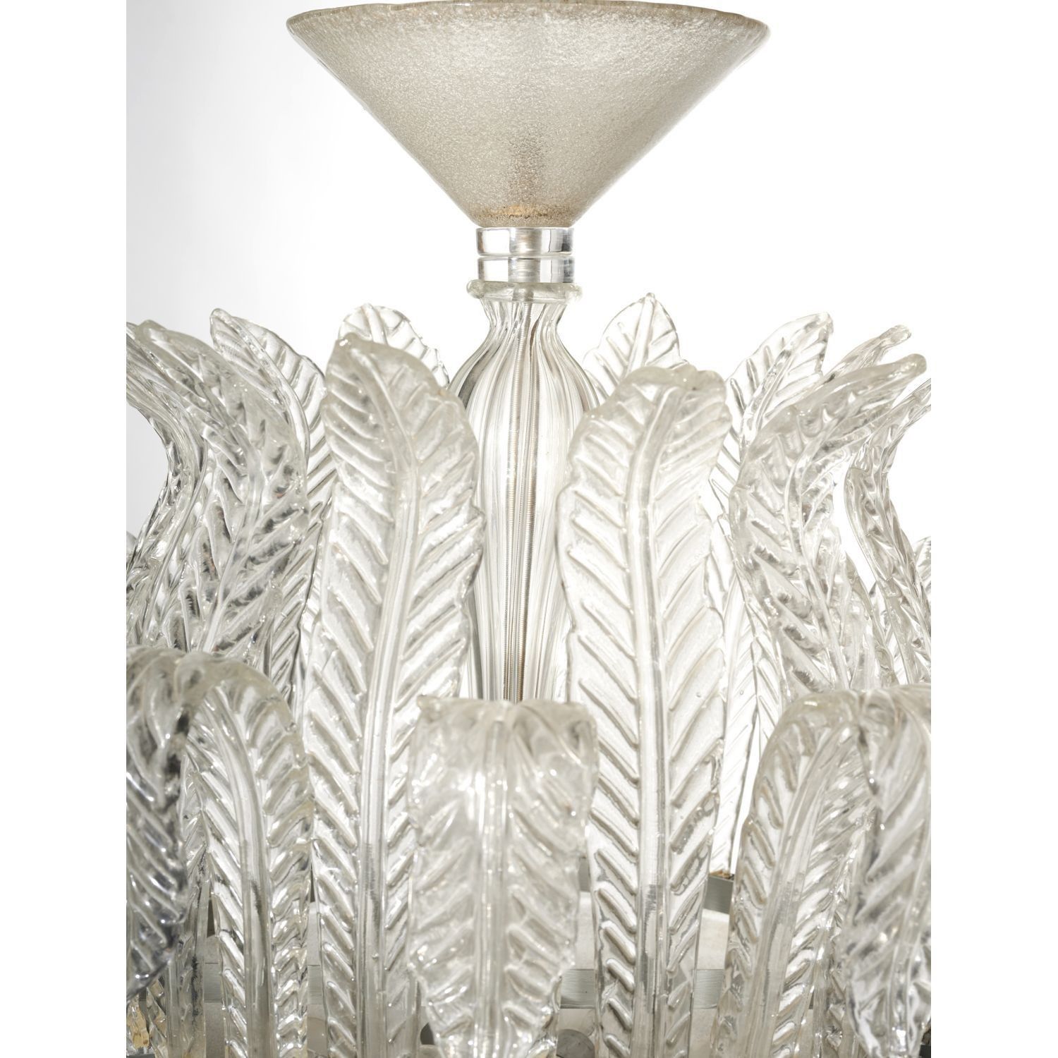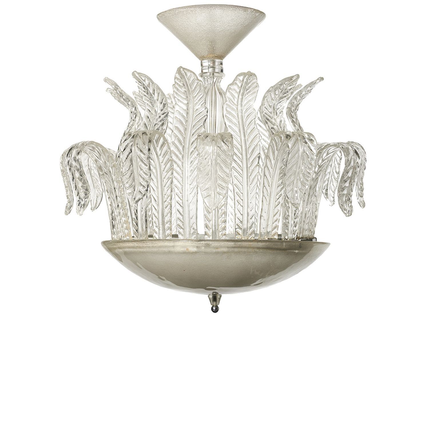 Murano glass suspension lamp consisting of a large bowl holding six lights and a metal ring holding palm leaves forming a crown, baluster shaft topped with a truncated cone-shaped cover. Circa 1940