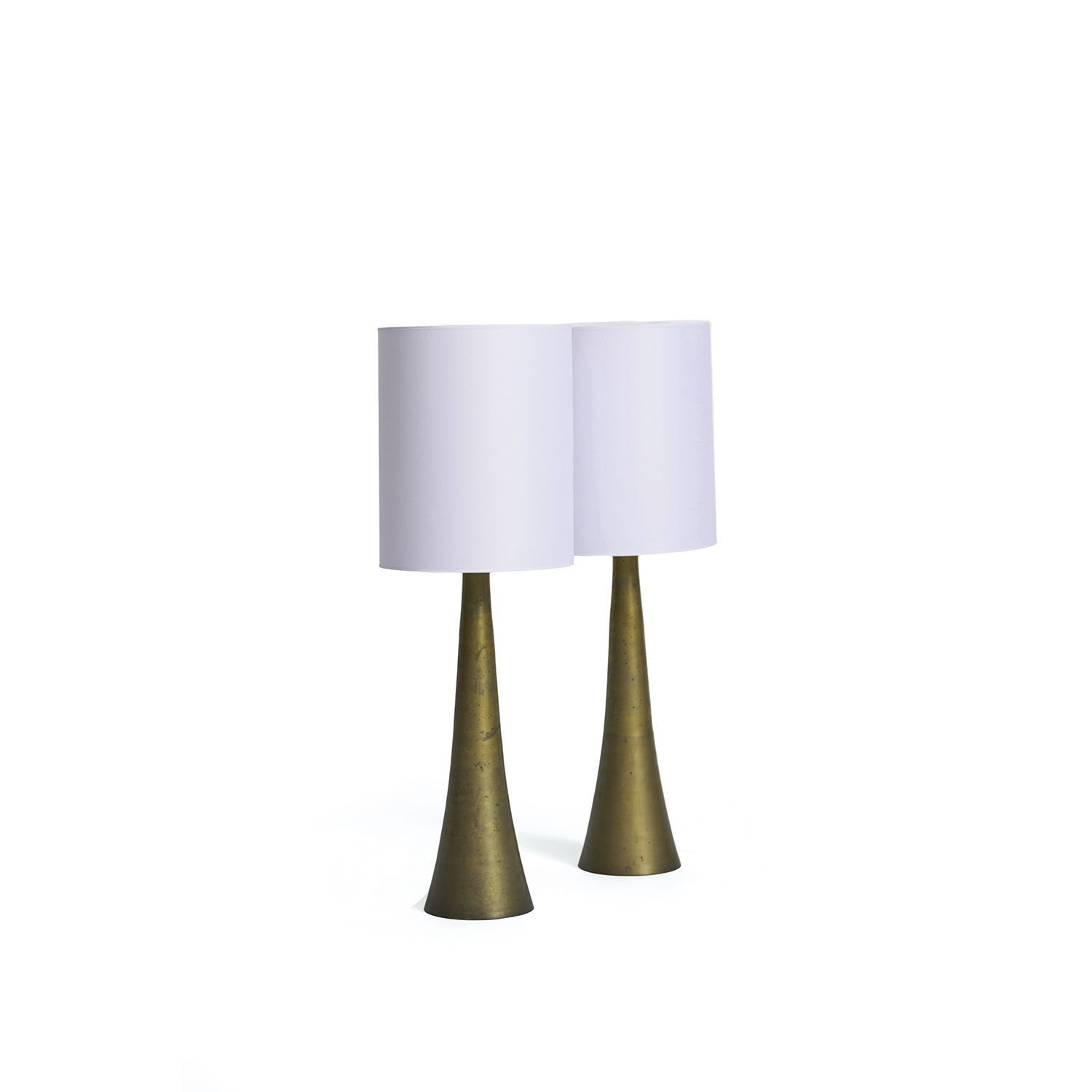 Pair of large truncated cone-shaped lamps in patinated brass. With later white cylindrical shades. Circa 1960