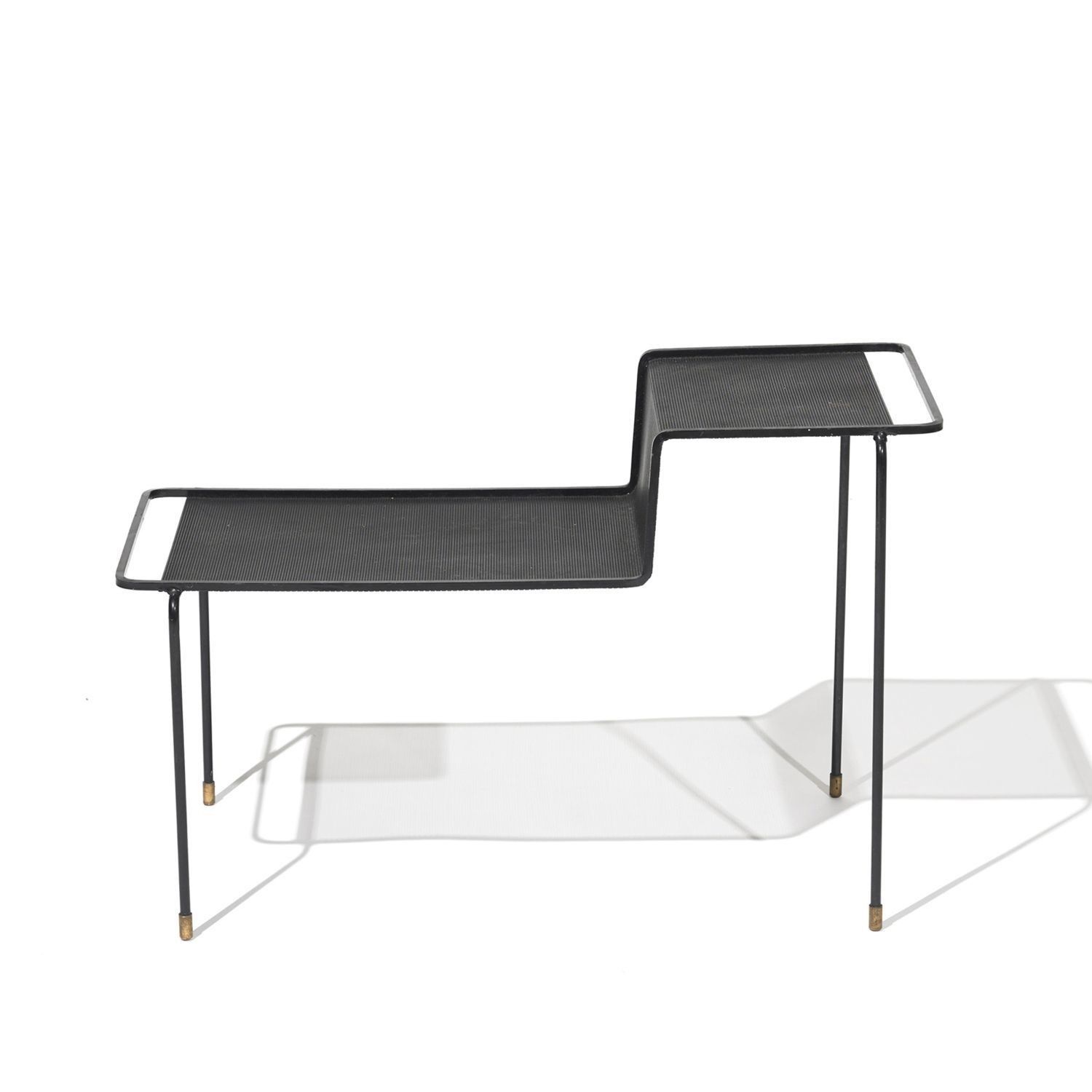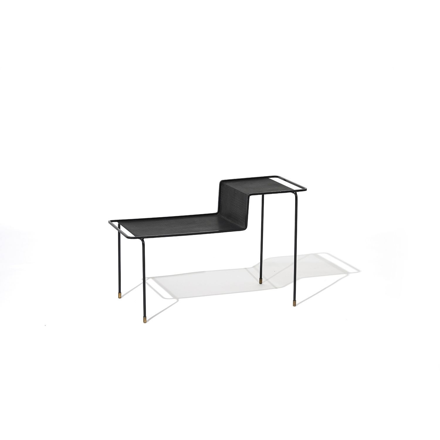 A 'Java' low table in lacquered metal with perforated sheet-metal top and brass sabots.