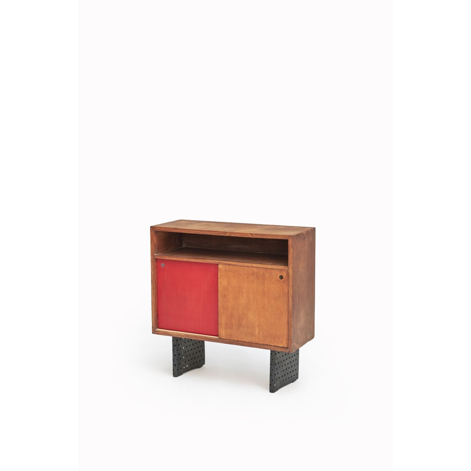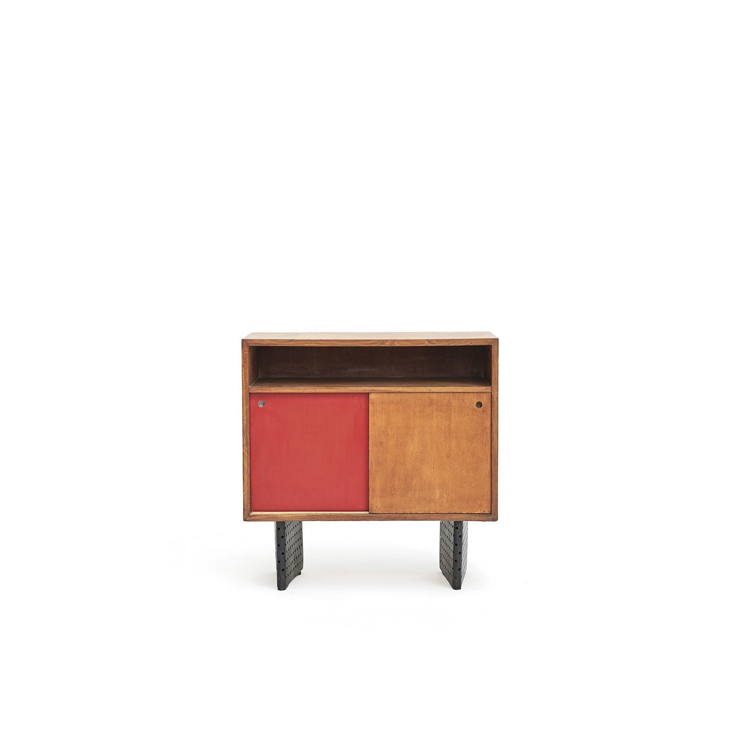 Oak veneer storage unit, opening to two sliding doors topped by a niche, standing on black lacquered metal legs with circular perforations. Made by Yvroud. Circa 1954