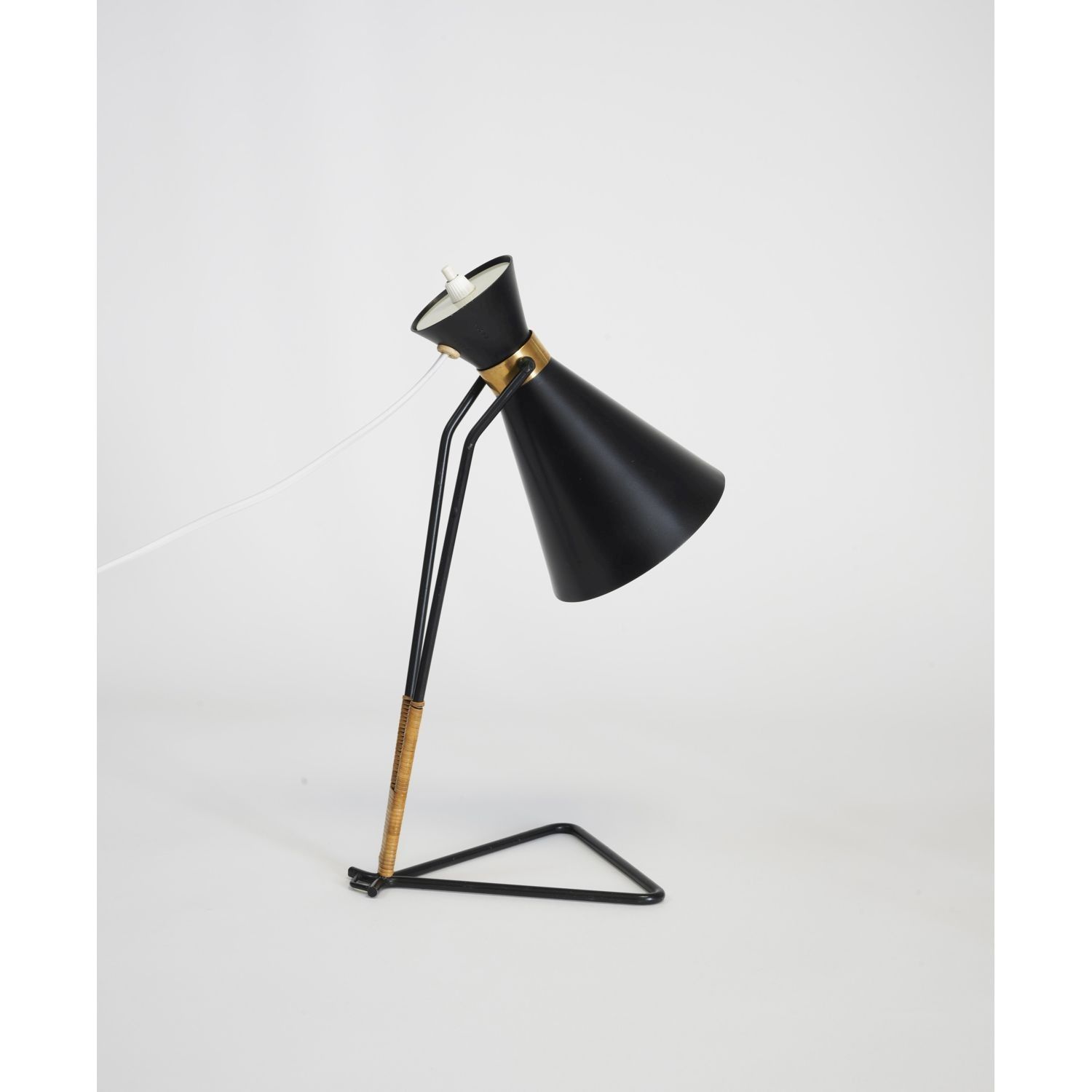 Small lamp in black lacquered tubular metal, with adjustable diabolo spotlight, encircled by a brass ring. The shaft is highlighted with rattan caning and the base is triangular.