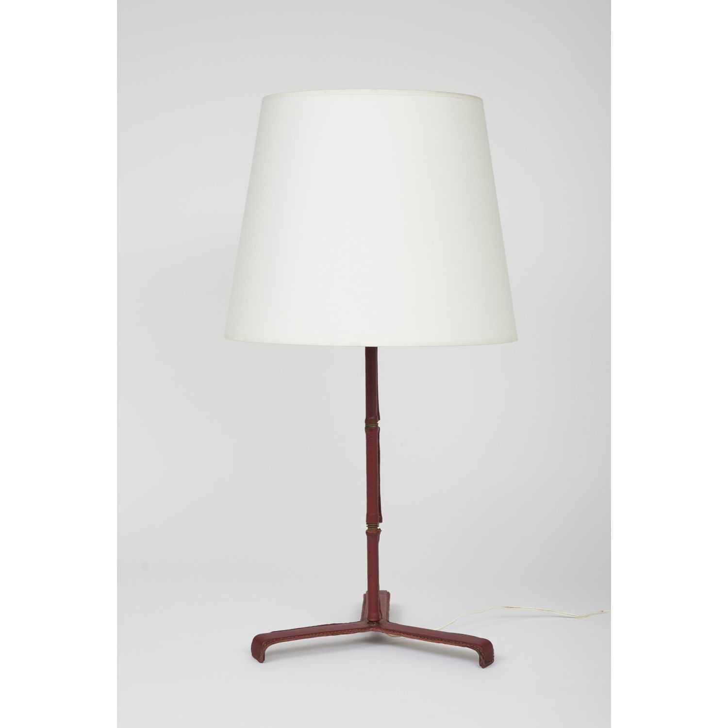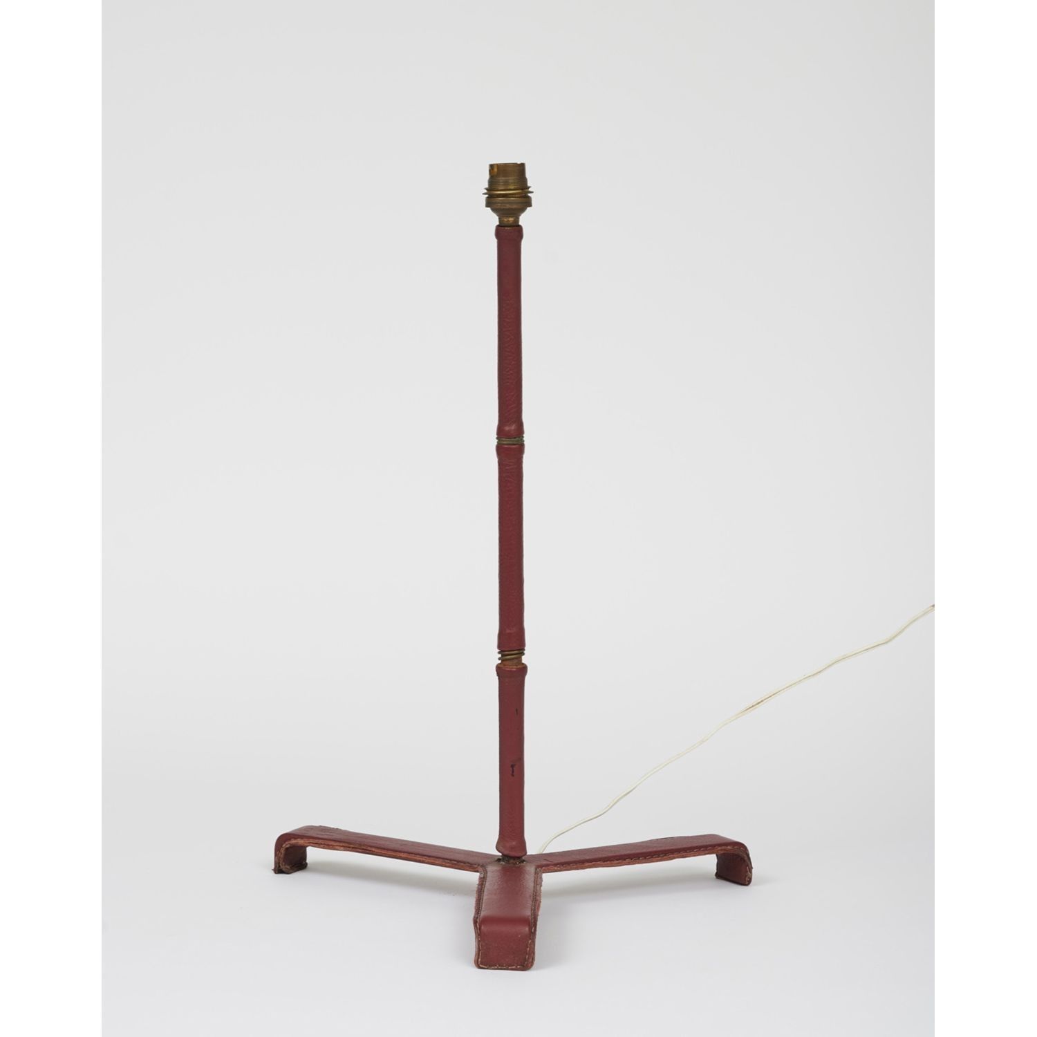 Metal lamp base sheathed in red leather with saddle-stitching, tripod base in metal strip, shaft ringed in bamboo style.
