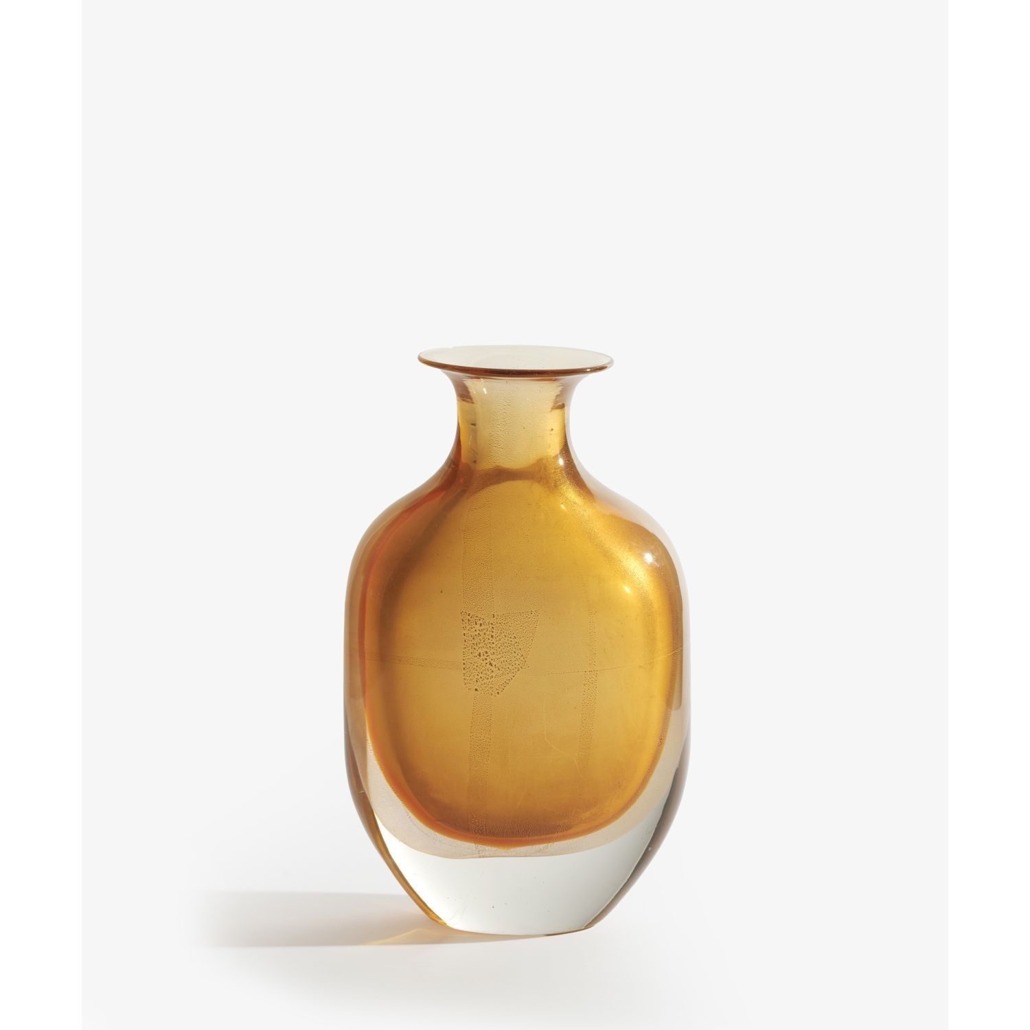 Important "sommerso" vase in translucent and gilded glass, ovoid shape with wide neck, delicately enhanced with gold leaf inclusions. Handwritten signature engraved in point on the reverse of the base "Archimede Seguso Murano".