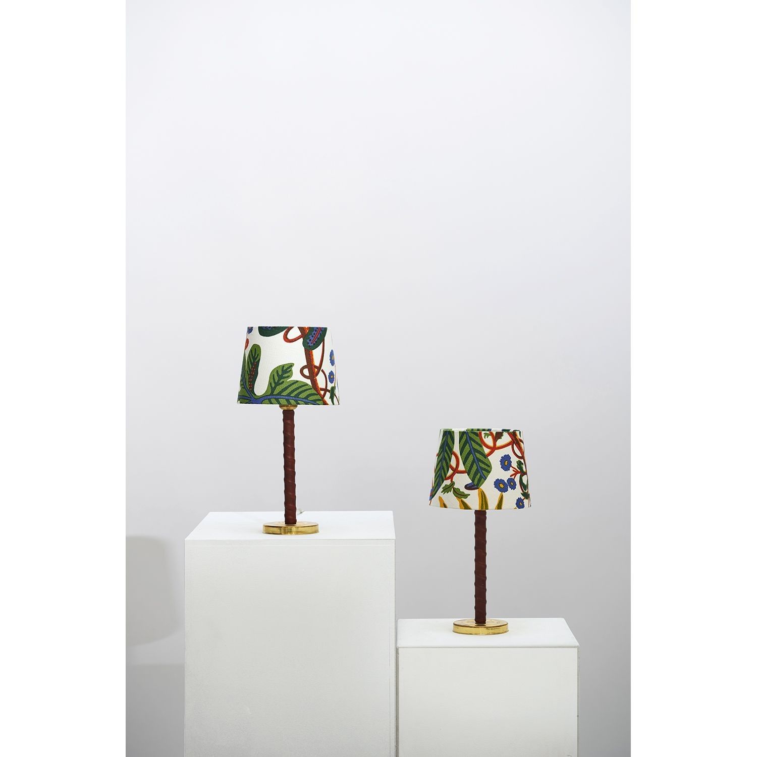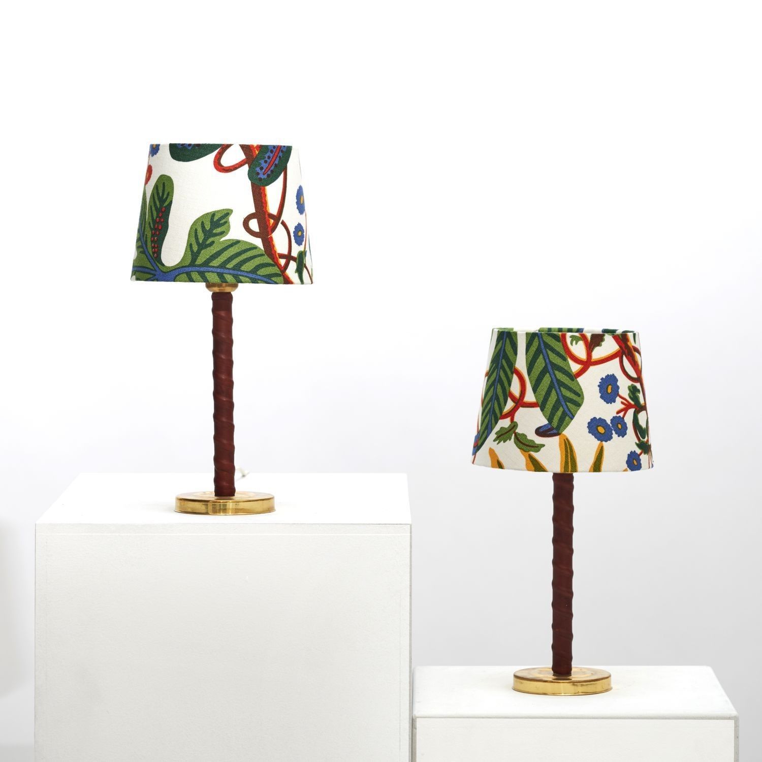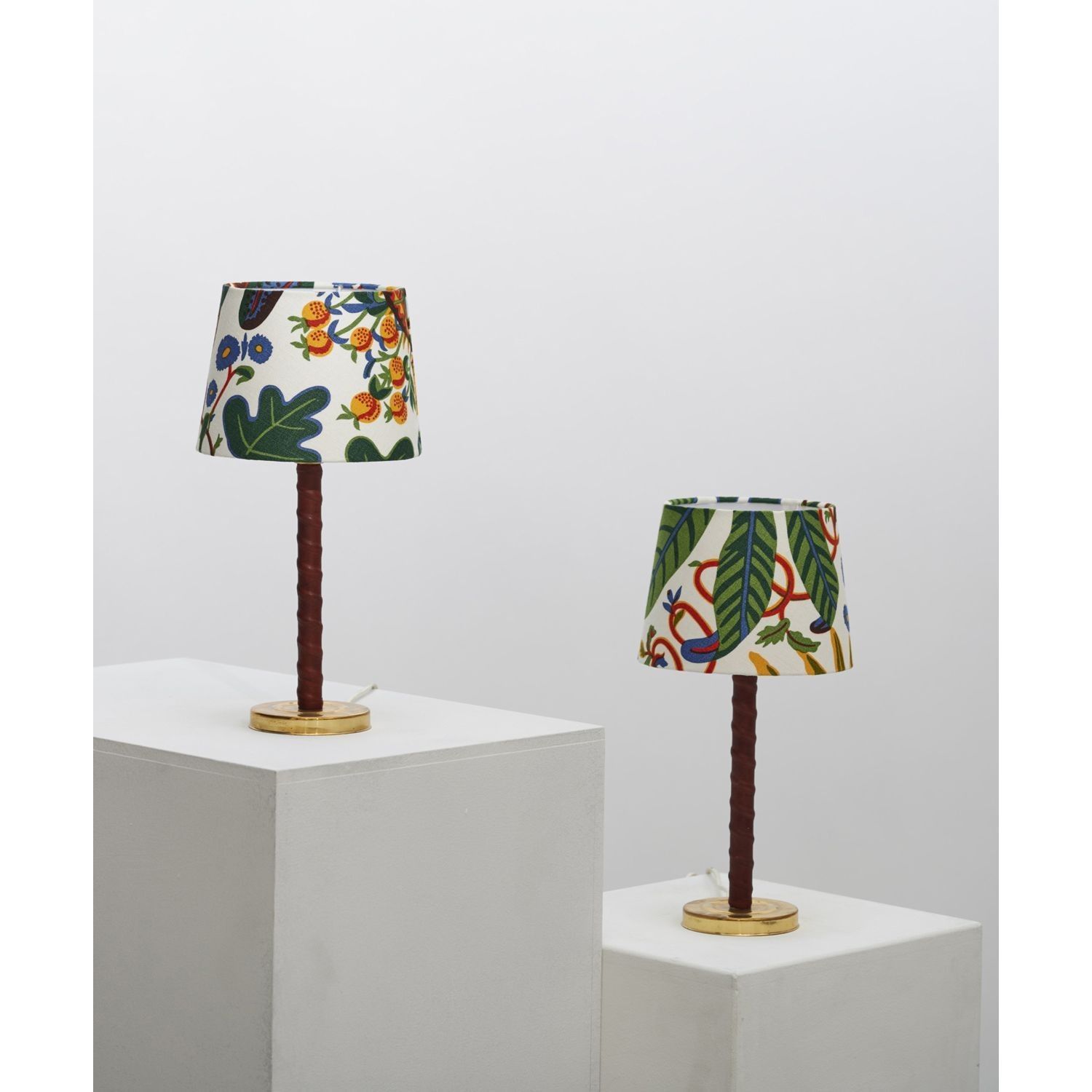 Pair of small lamps model "P429" in brass, the shaft partially sheathed with leather straps. Later shades in "Aralia" fabric designed by Josef Frank for Svenskt Tenn. Publisher's label "ABO, Randers". Circa 1960