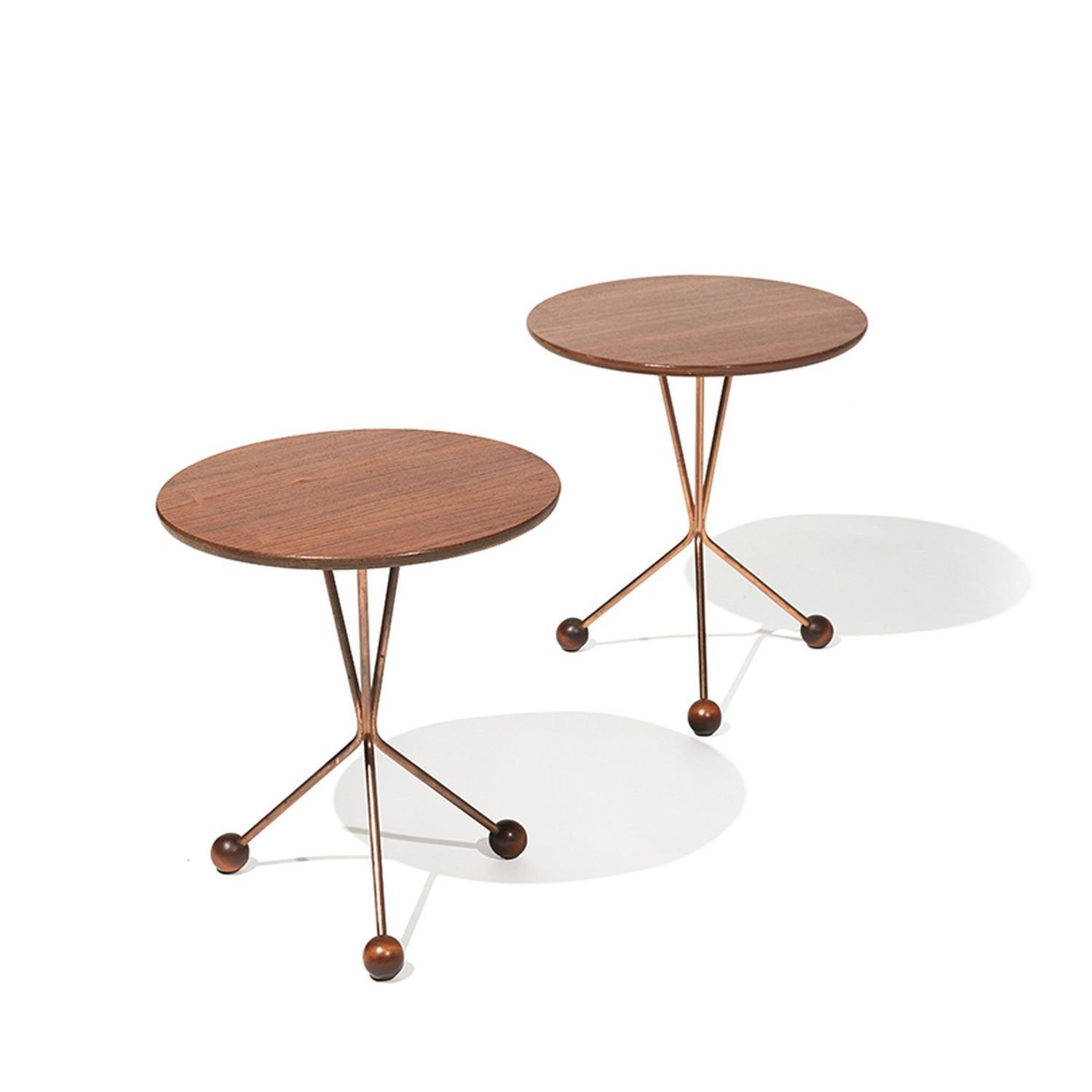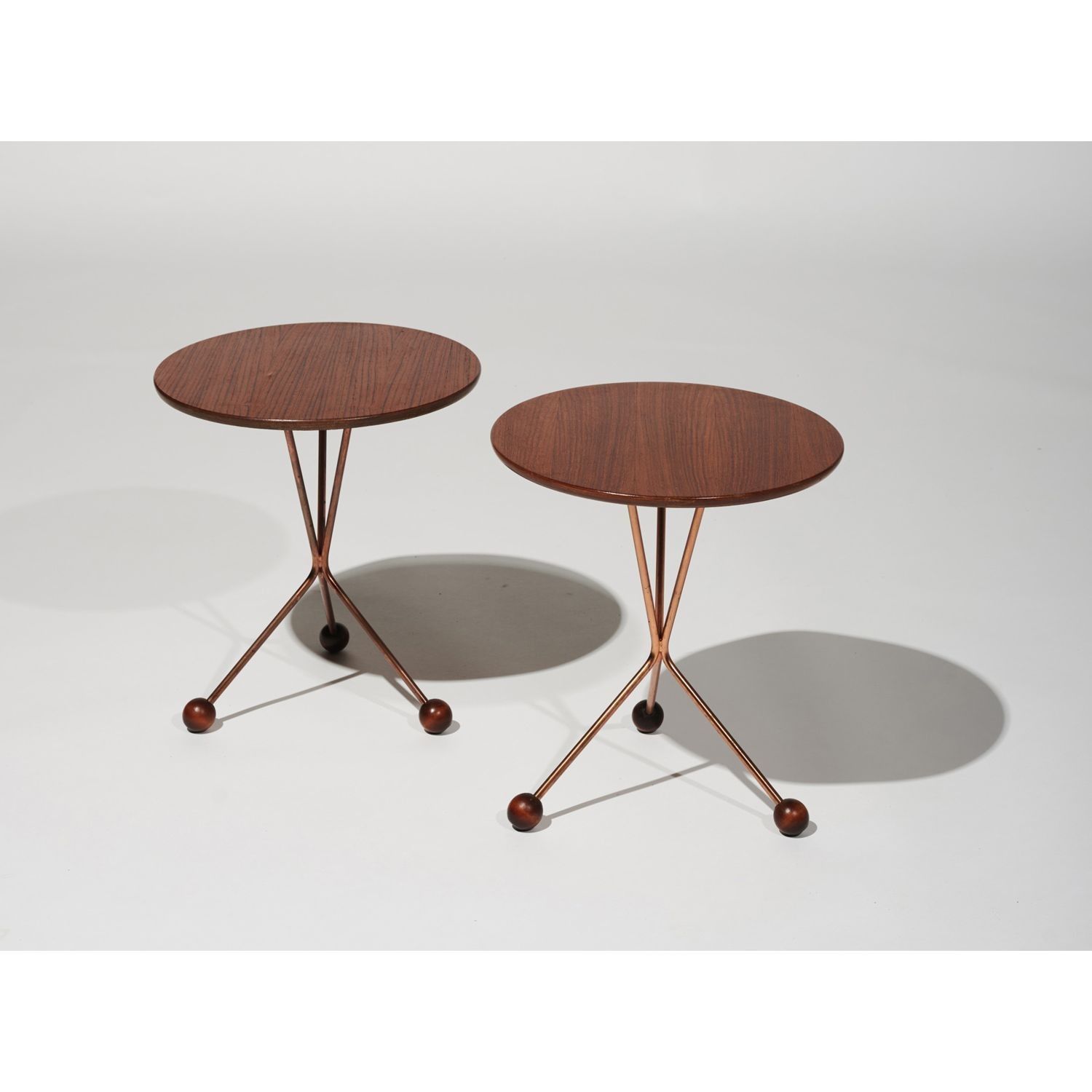 Pair of small pedestal tables with circular tops in stained teak, resting on three bent copper tube legs with wooden spheres. Alberts Tibro edition. Circa 1960
