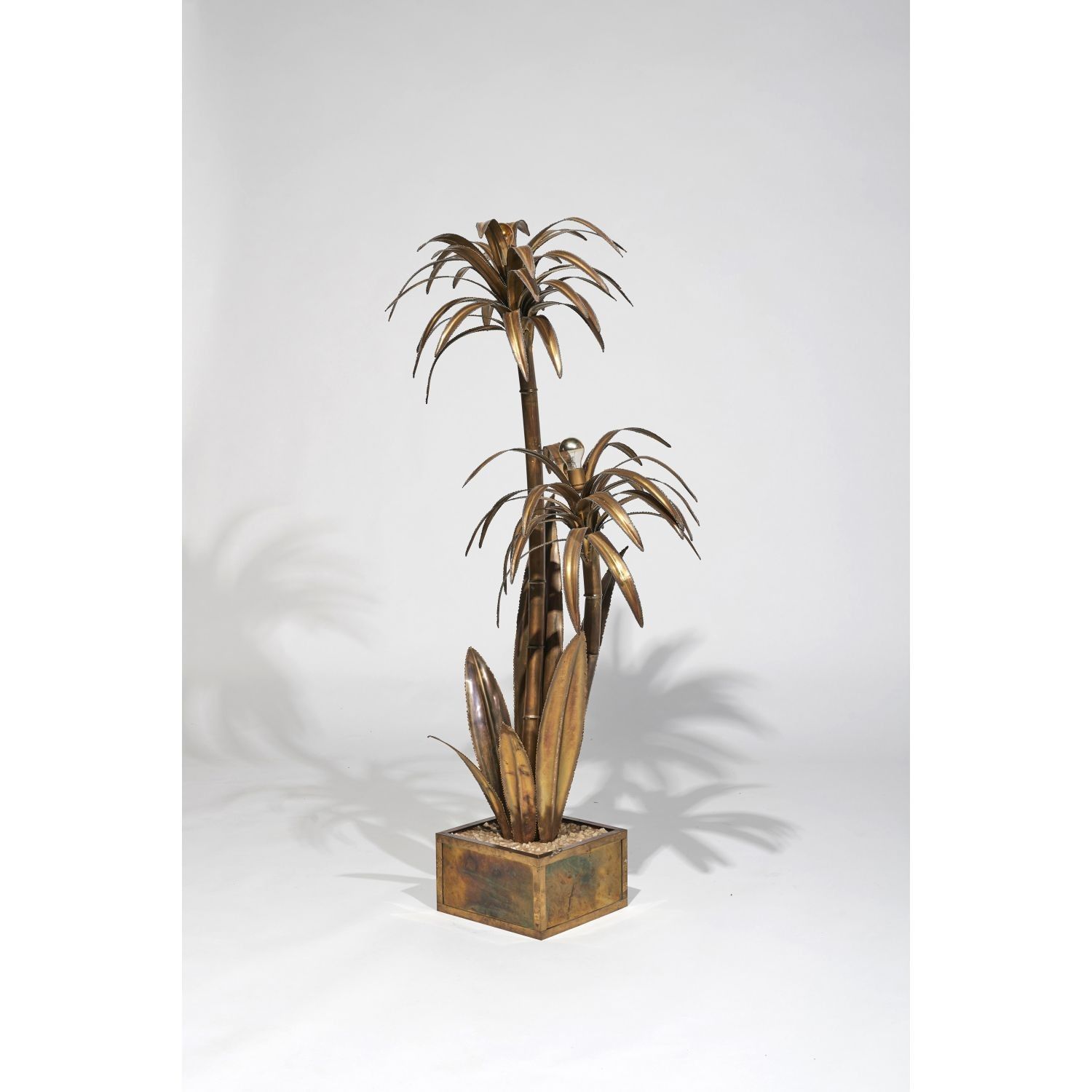 Plant lamp in tin-soldered gilded brass, with two branches of exotic plants on a brass-plated cubic base. Circa 1970