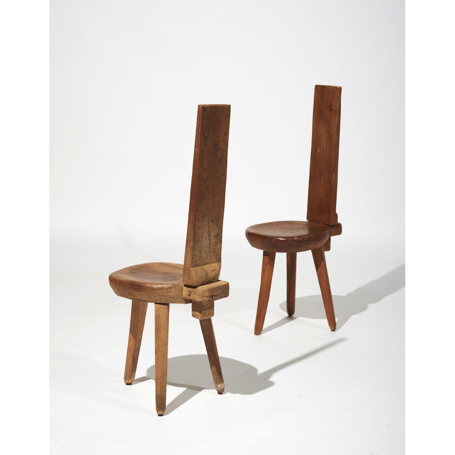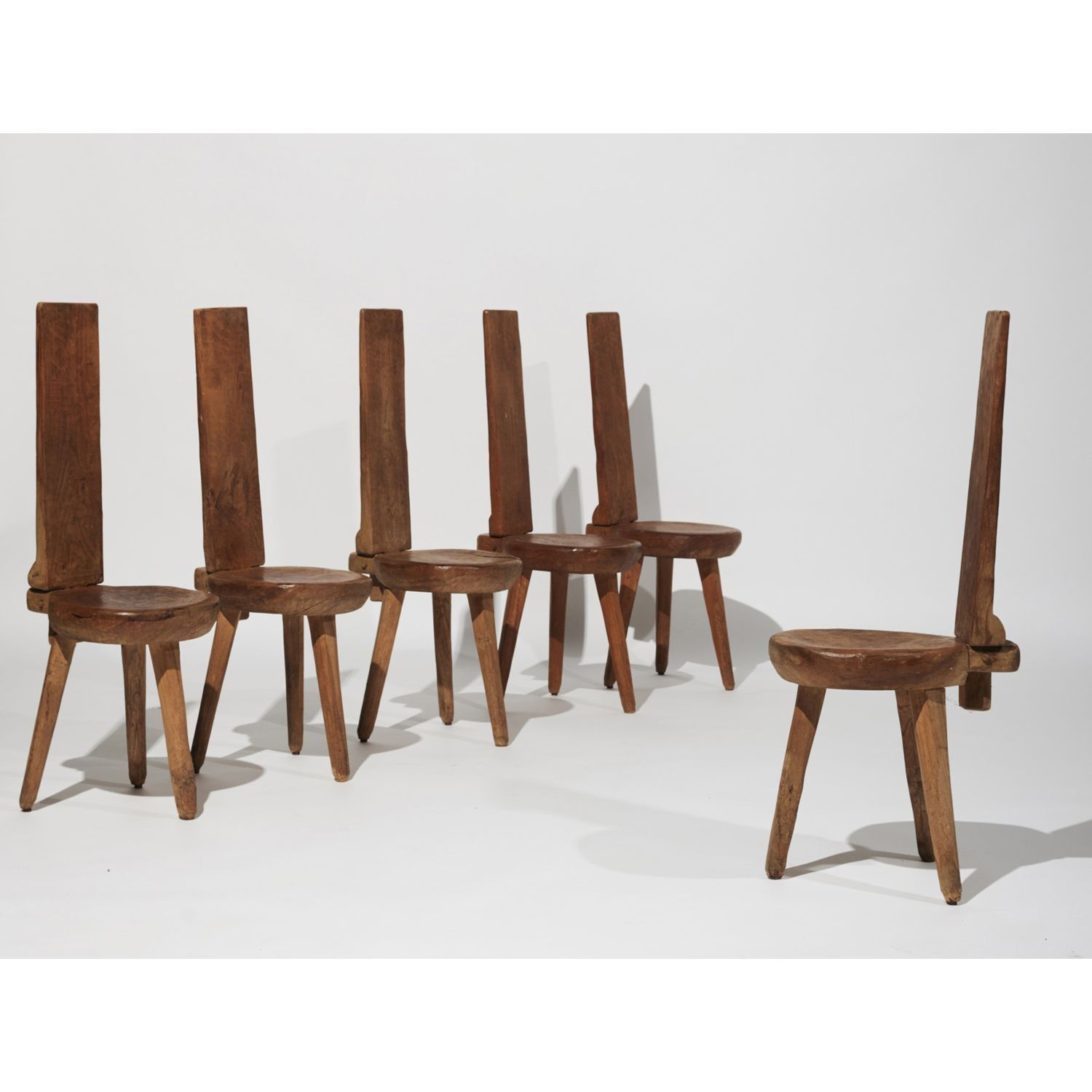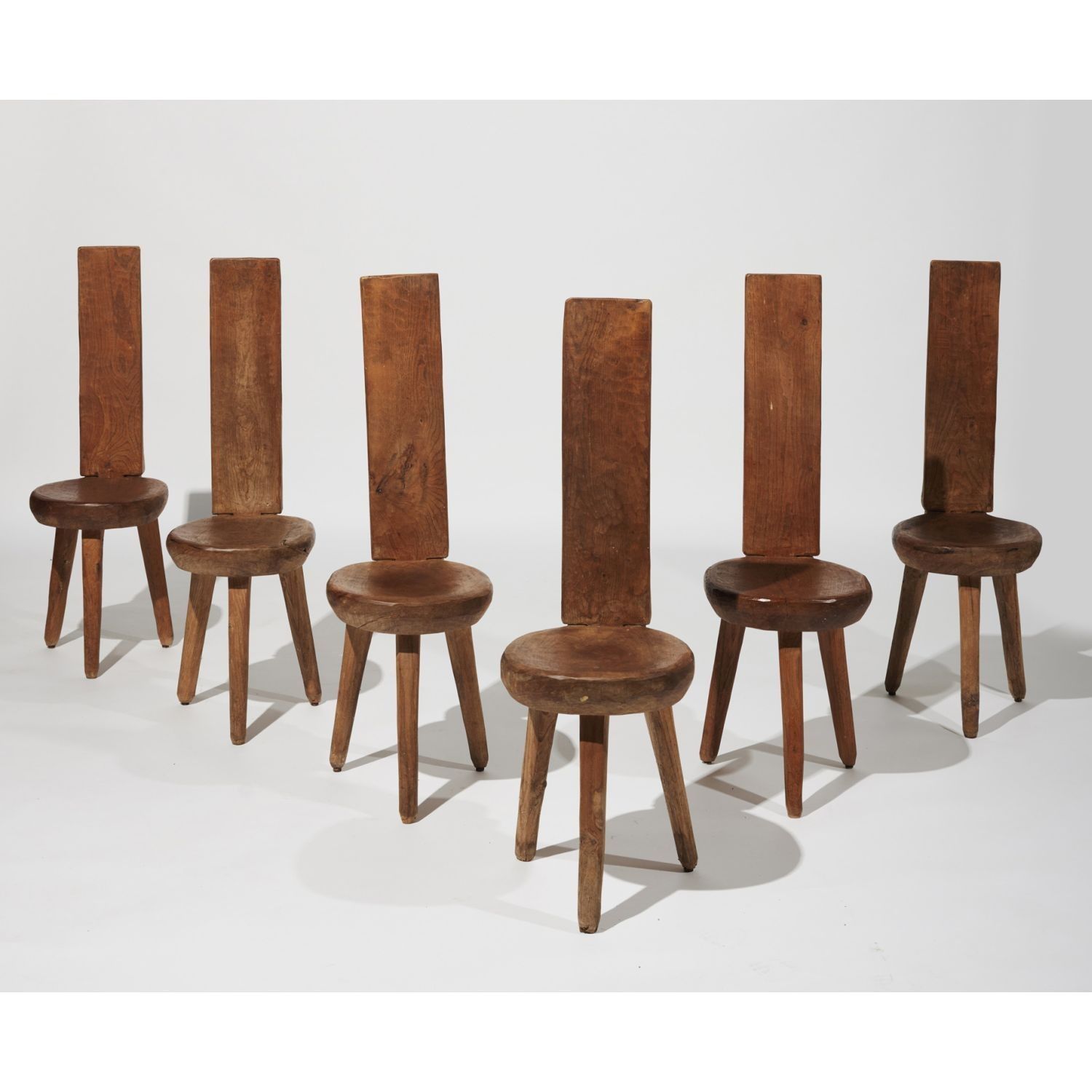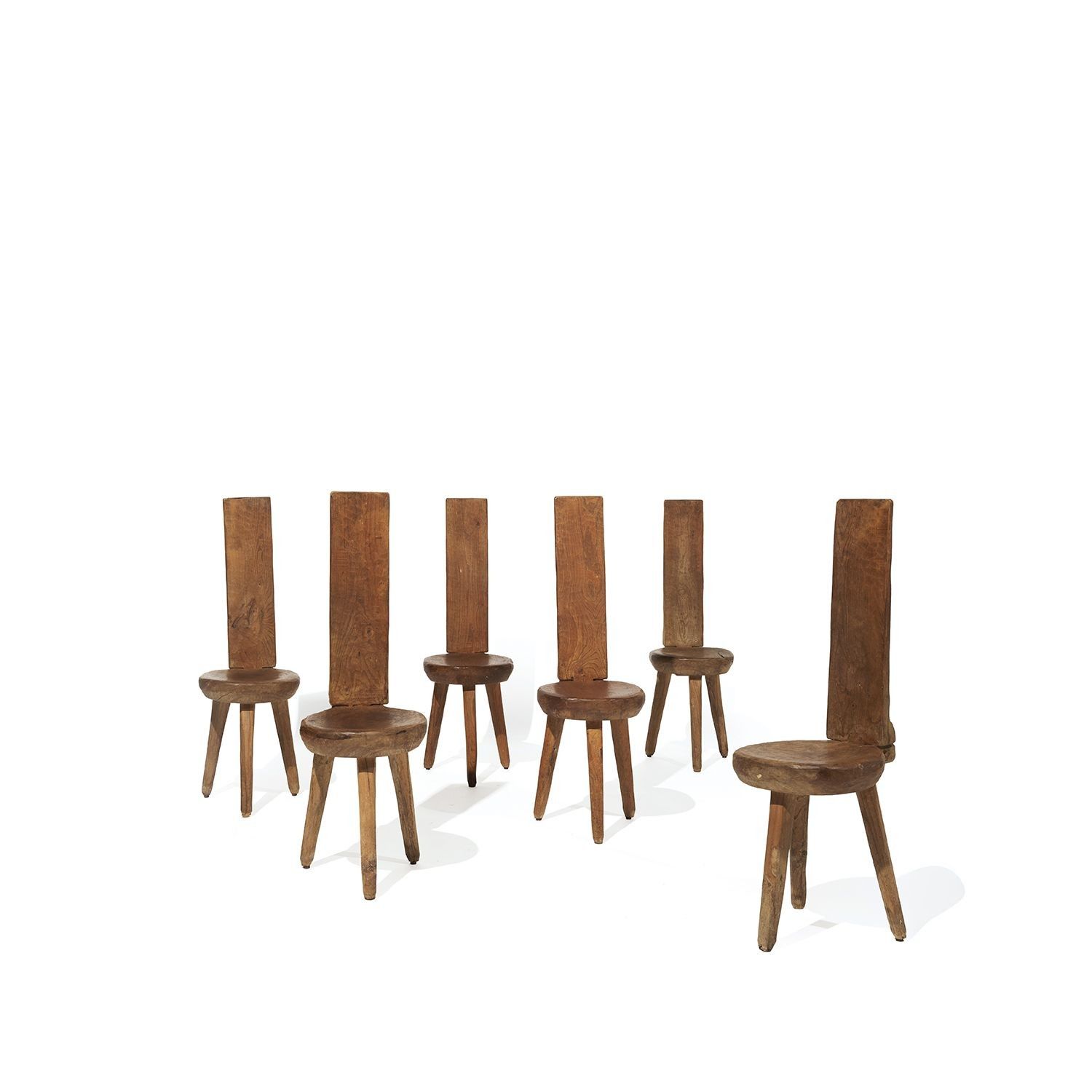 Suite of six rustic chairs in solid elm, shaped with an axe and finished in gouge, with a circular seat and a high, narrow straight back attached to the seat by a mortise and tenon system, resting on three legs. Unsigned. Circa 1960