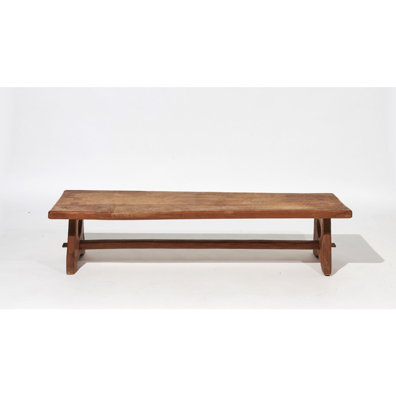 A large solid elm coffee table with a rectangular top resting on triangular legs with a circular opening, joined by a brace. Signed "Charles Flandres" on the belt. Circa 1960