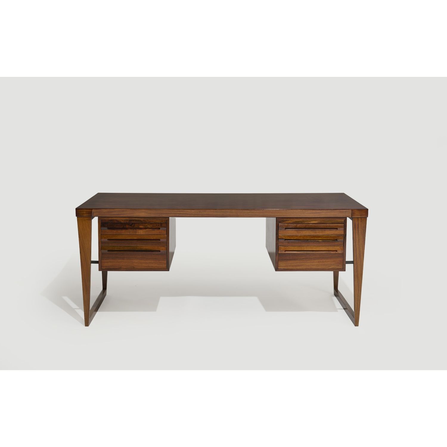 Rectangular desk with two large pedestals, opening on either side of the top, connected to the base by chromed metal rods.