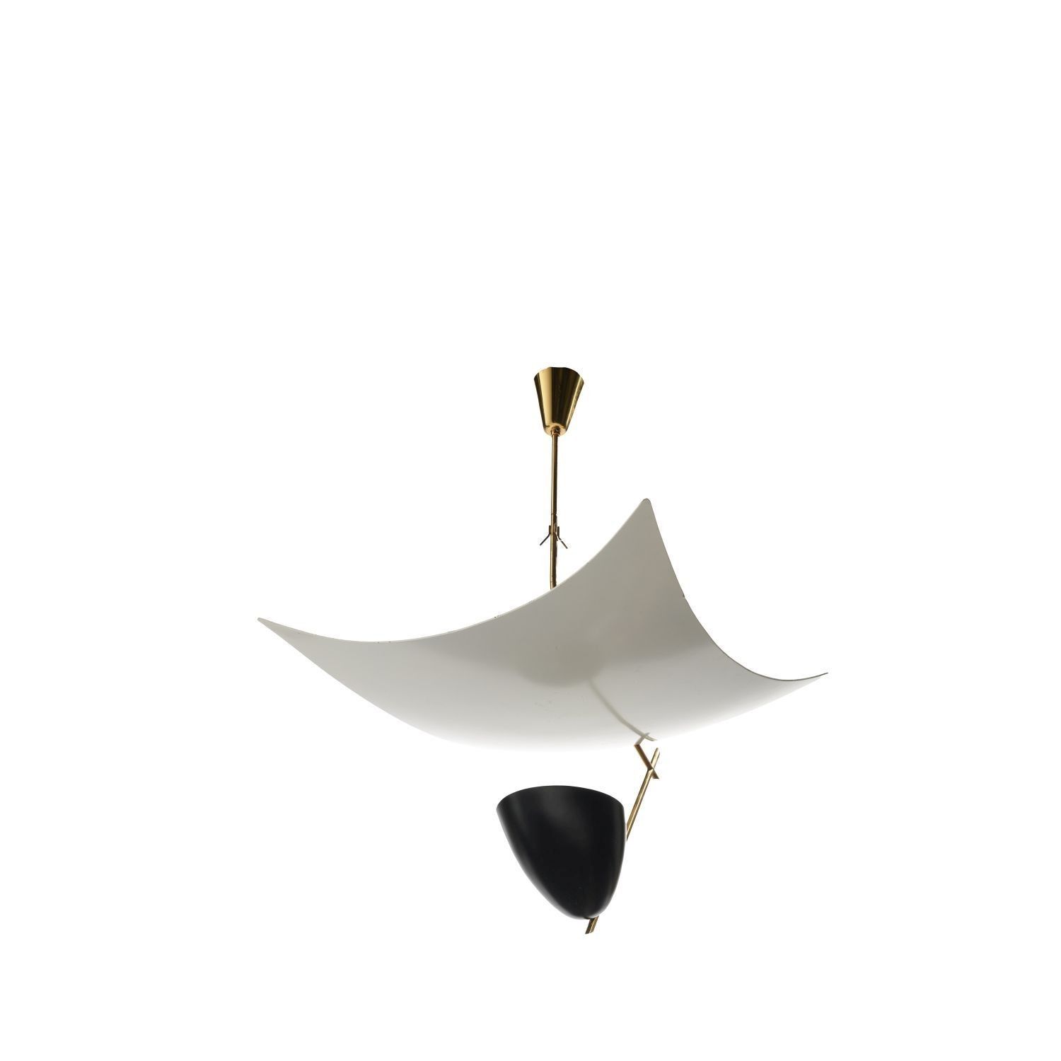 Vela" pendant light, model 12385, brass tube structure, with a white lacquered metal sheet deflector, resembling a suspended sail, held in place by transparent nylon threads; oblong black lacquered metal spotlight. Published by Arredoluce.