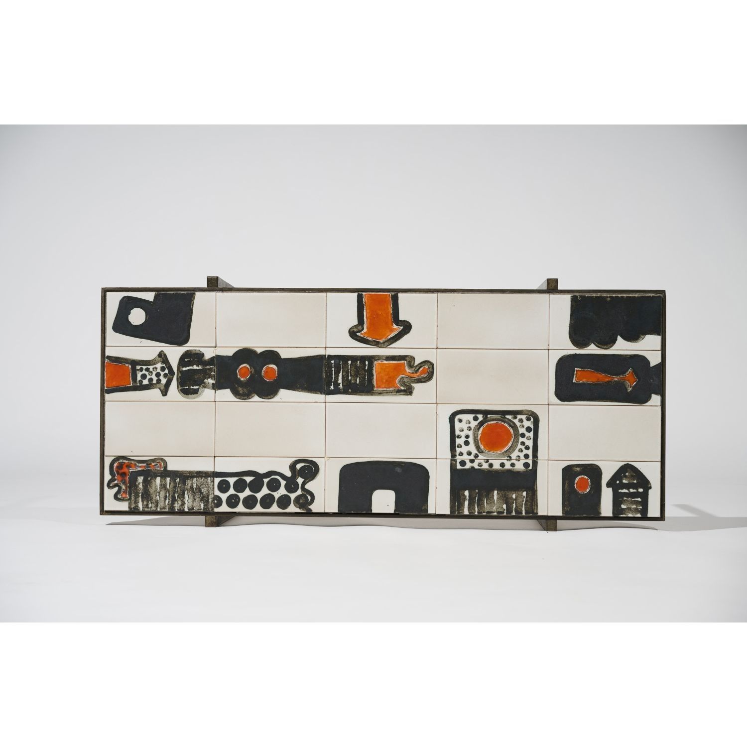 A large low table with lacquered metal frame and enamelled earthenware tiles. Not signed (Small chips on two tiles)