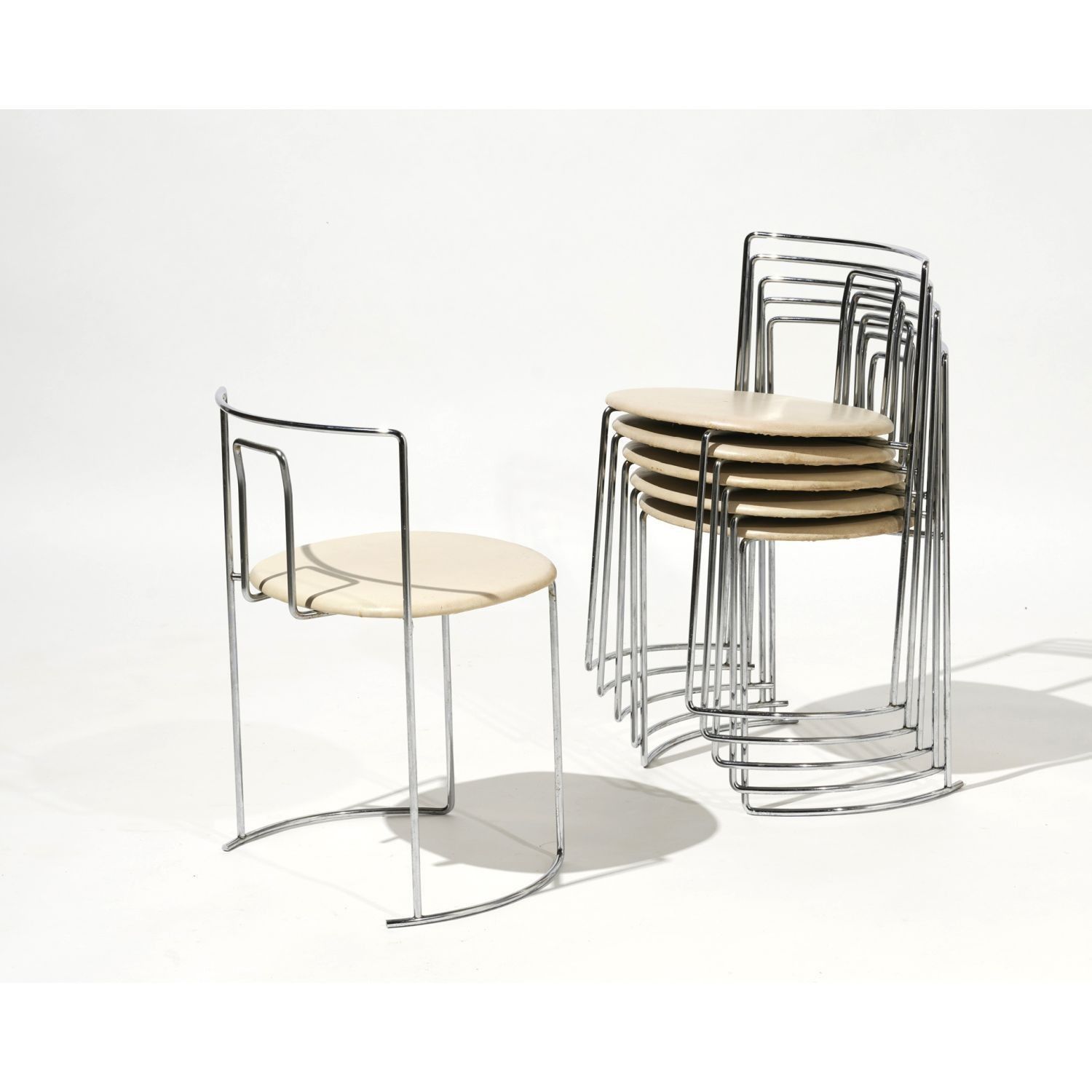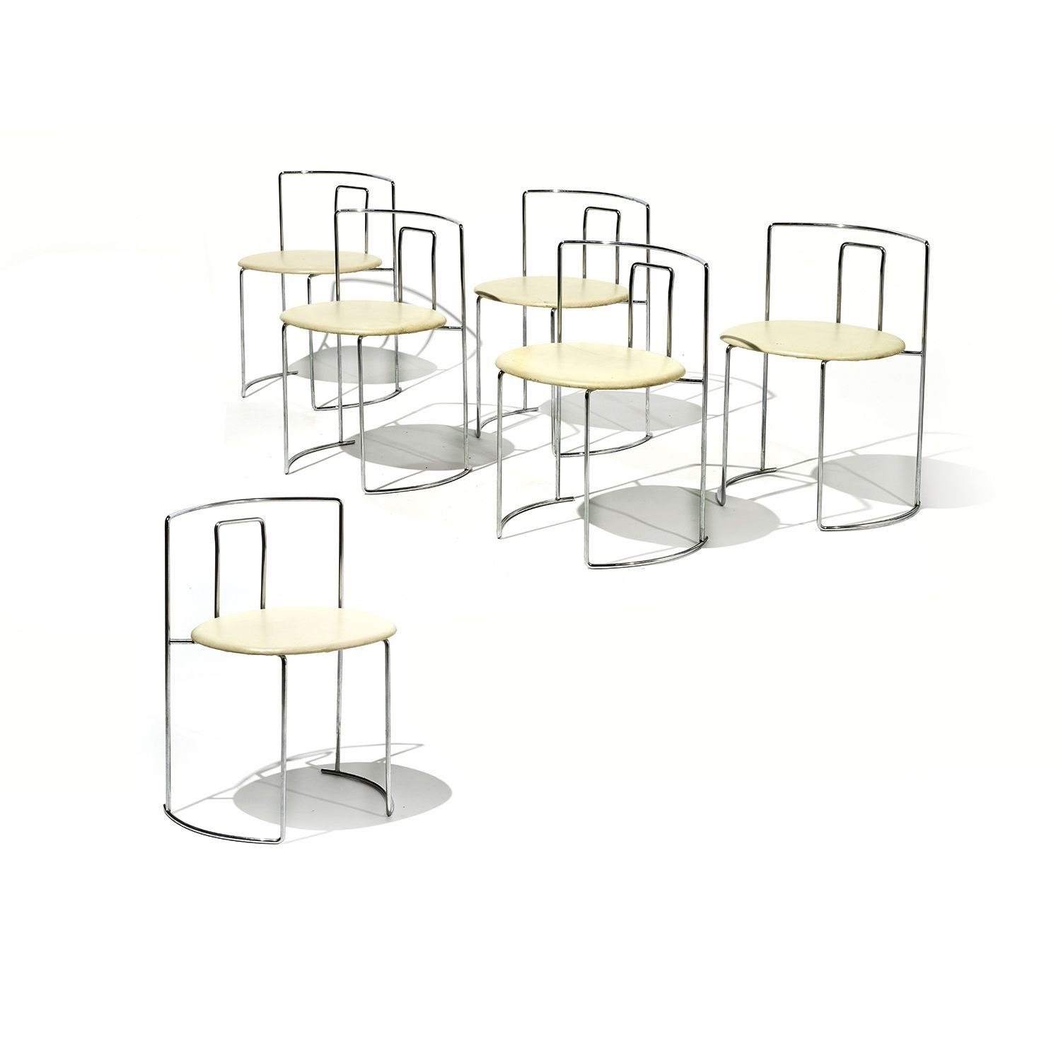 Suite of six "Gaja" chairs in chromed tubular metal, oval seat upholstered in ivory skai. Simon Gavina publisher's logo on the fabric on the back of the seats.