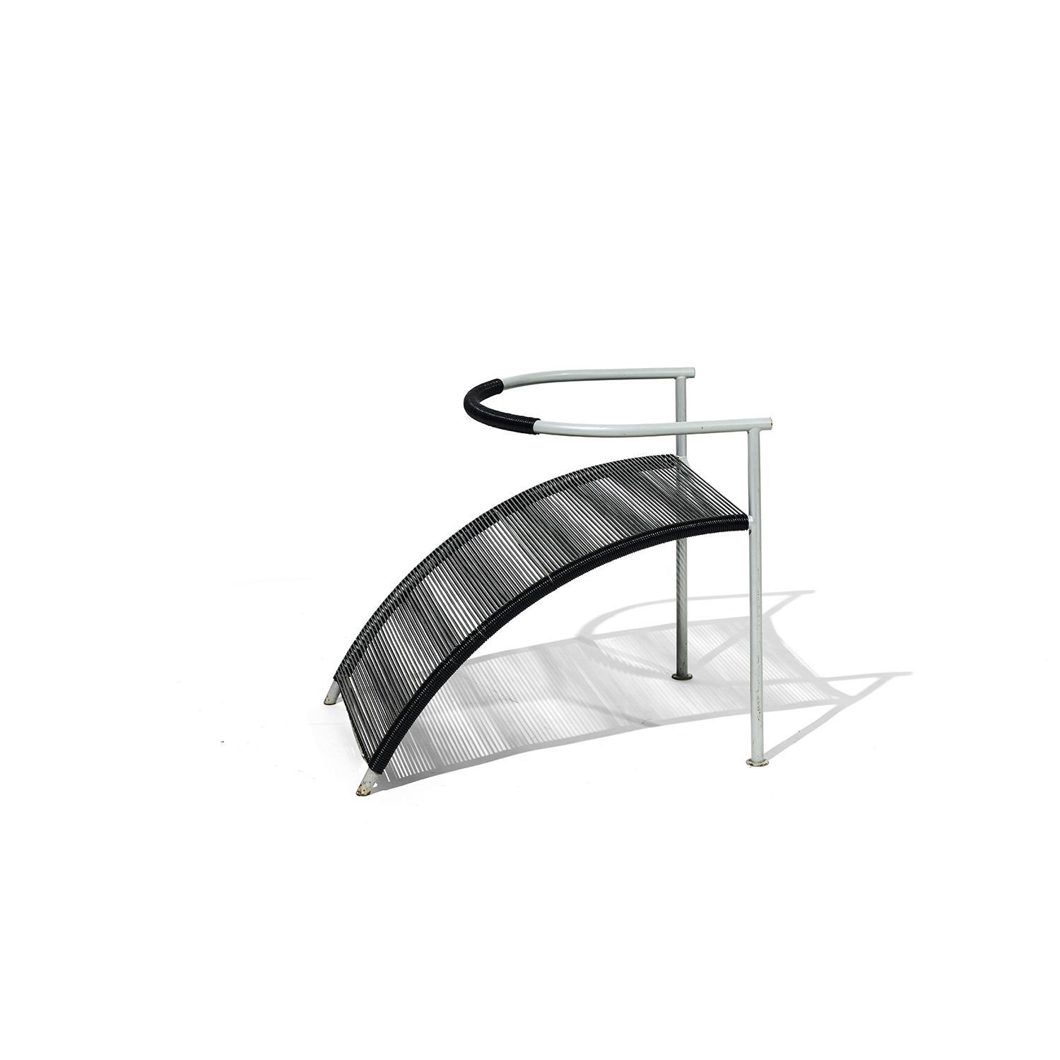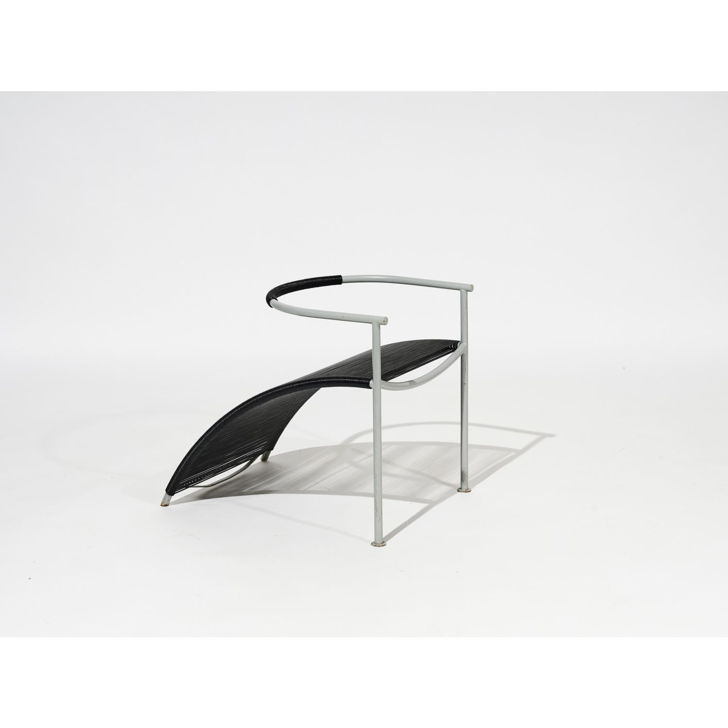 Pat Conley II" armchair in grey lacquered tubular metal, upholstered in black PVC thread, front legs with circular glides, arched back legs. XO edition. Circa 1985