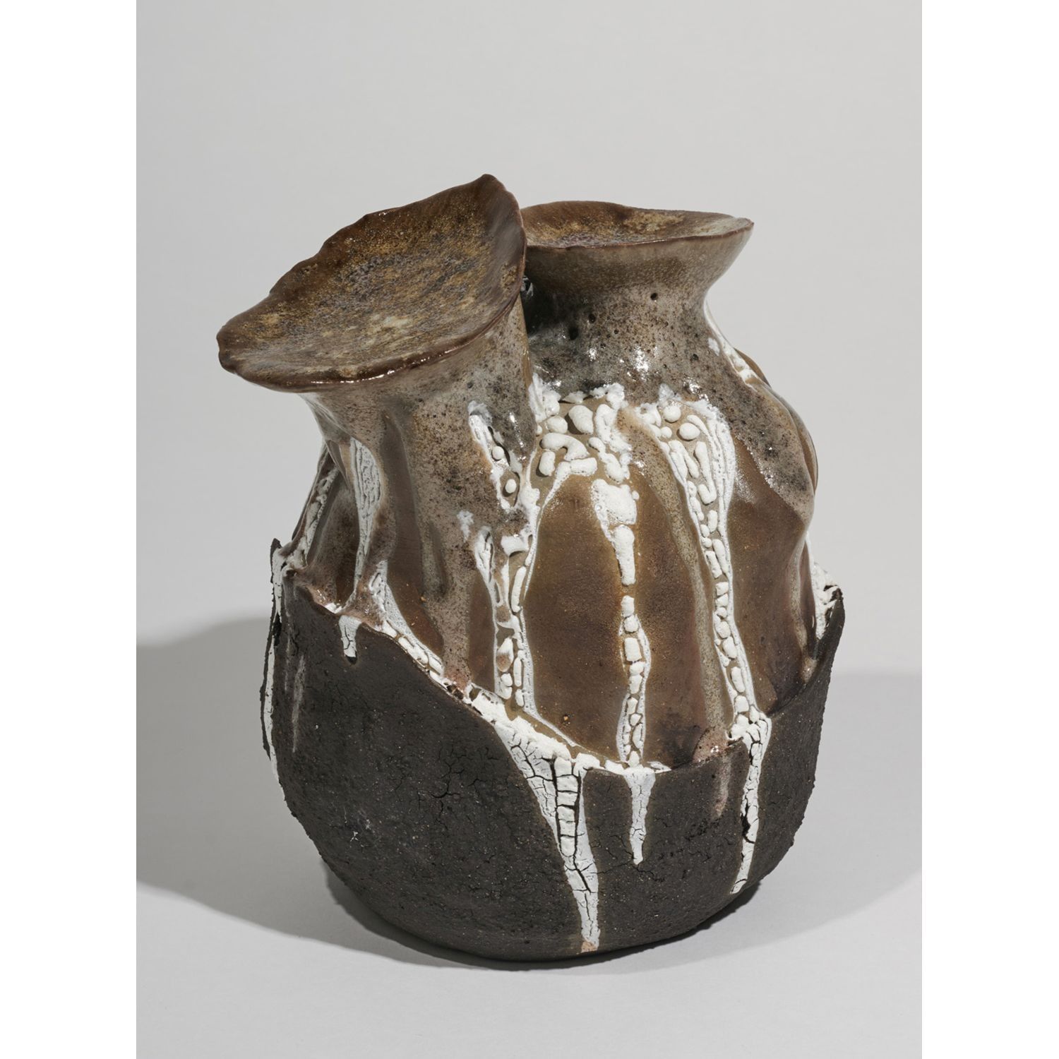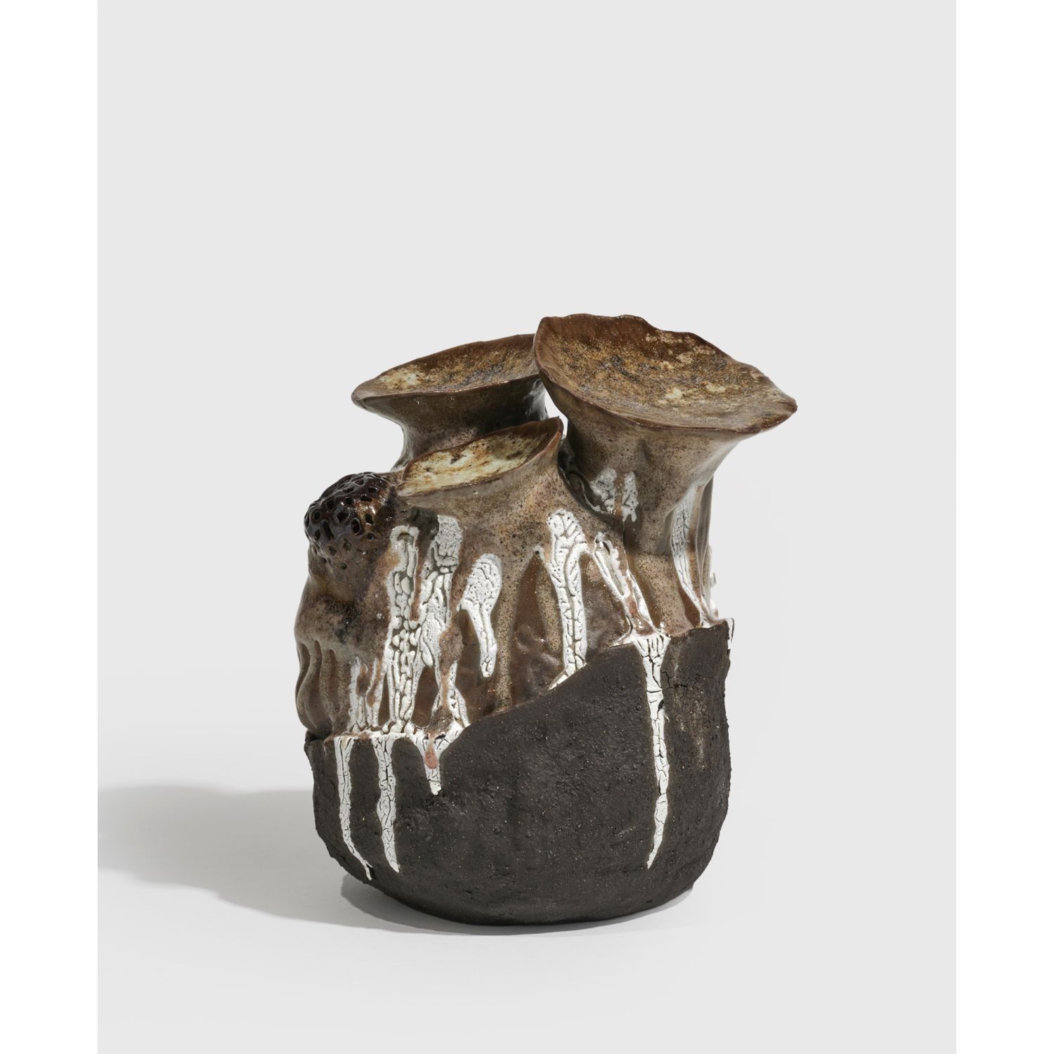 Vegetal-inspired sculpture in smoked ceramic, white slip. Incised handwritten signature "Nicole Toldi" on the reverse of the base. Circa 2024