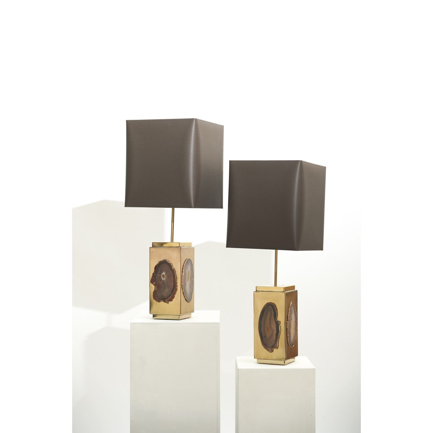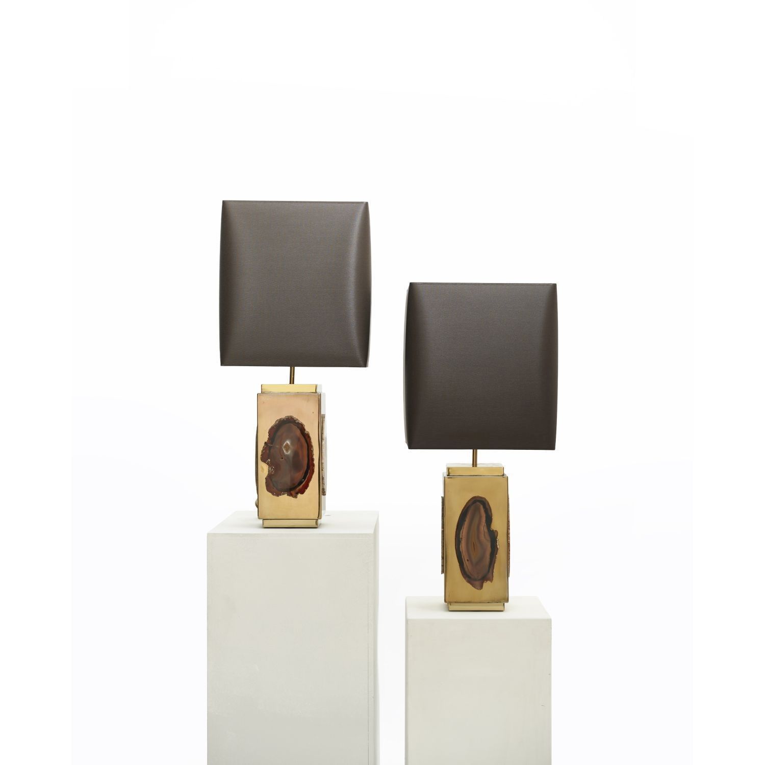 Pair of parallelepiped lamps in gilded metal, decorated with an agate plaque on each side of the shaft, anthracite grey lampshade fixed on a rod allowing the height to be adjusted. Each lamp is signed on a plaque on the base.