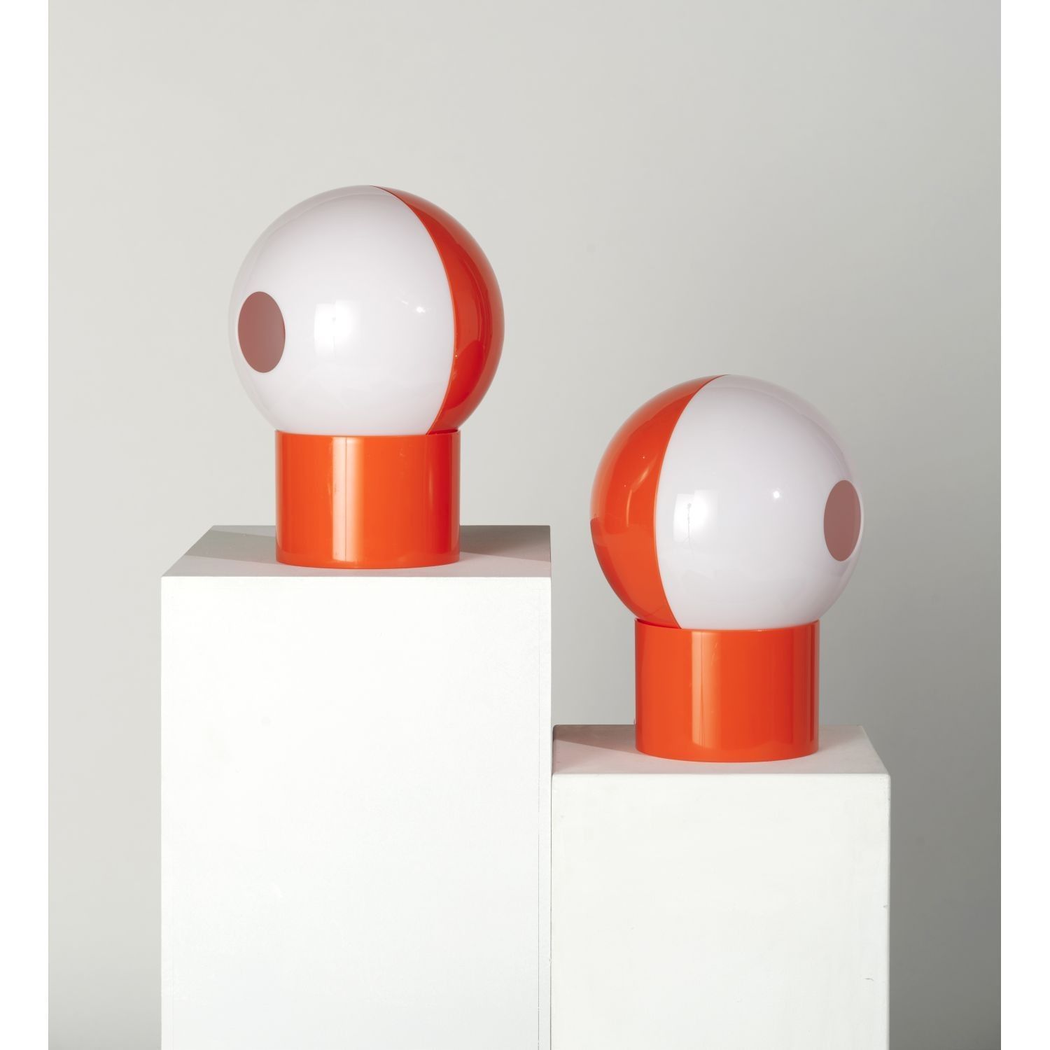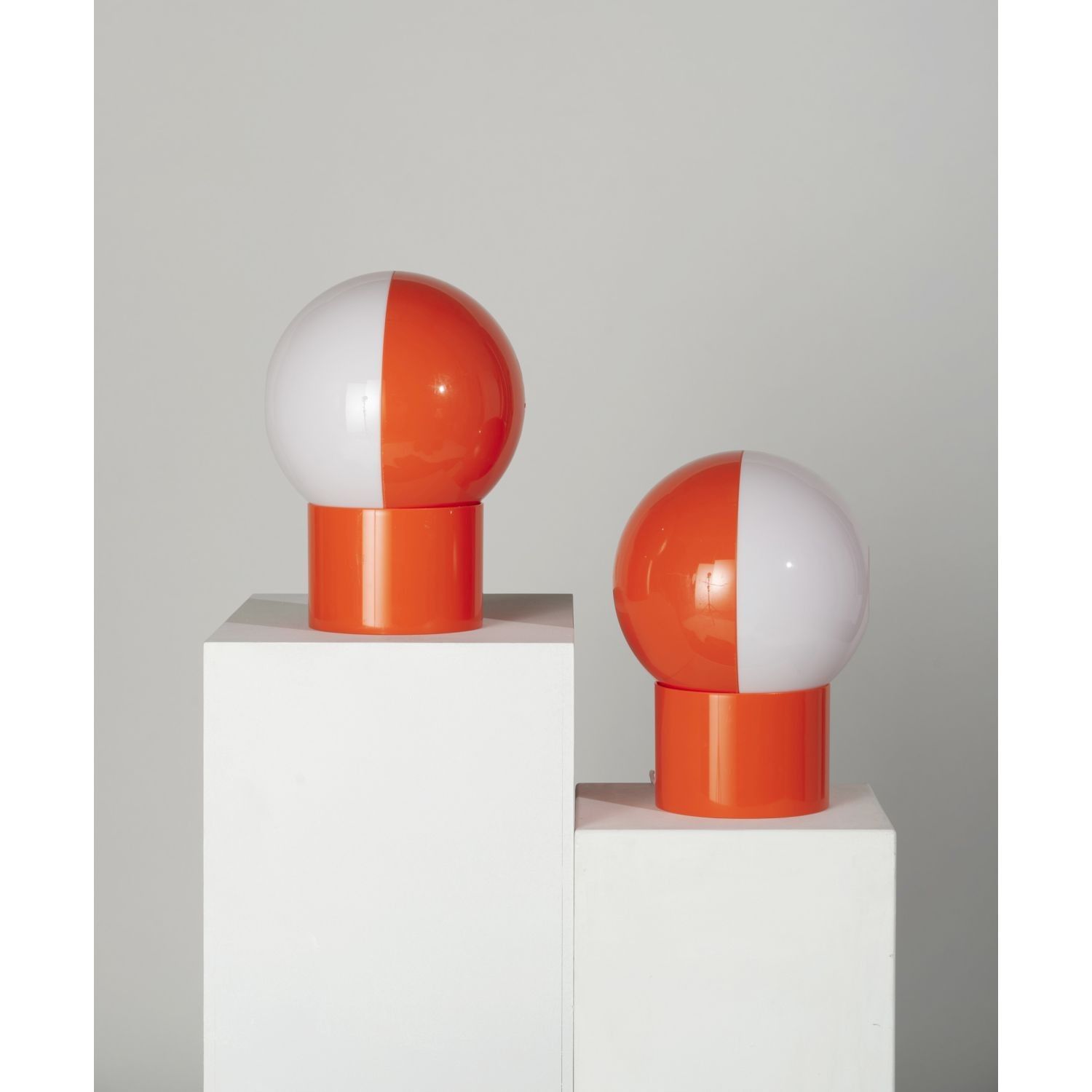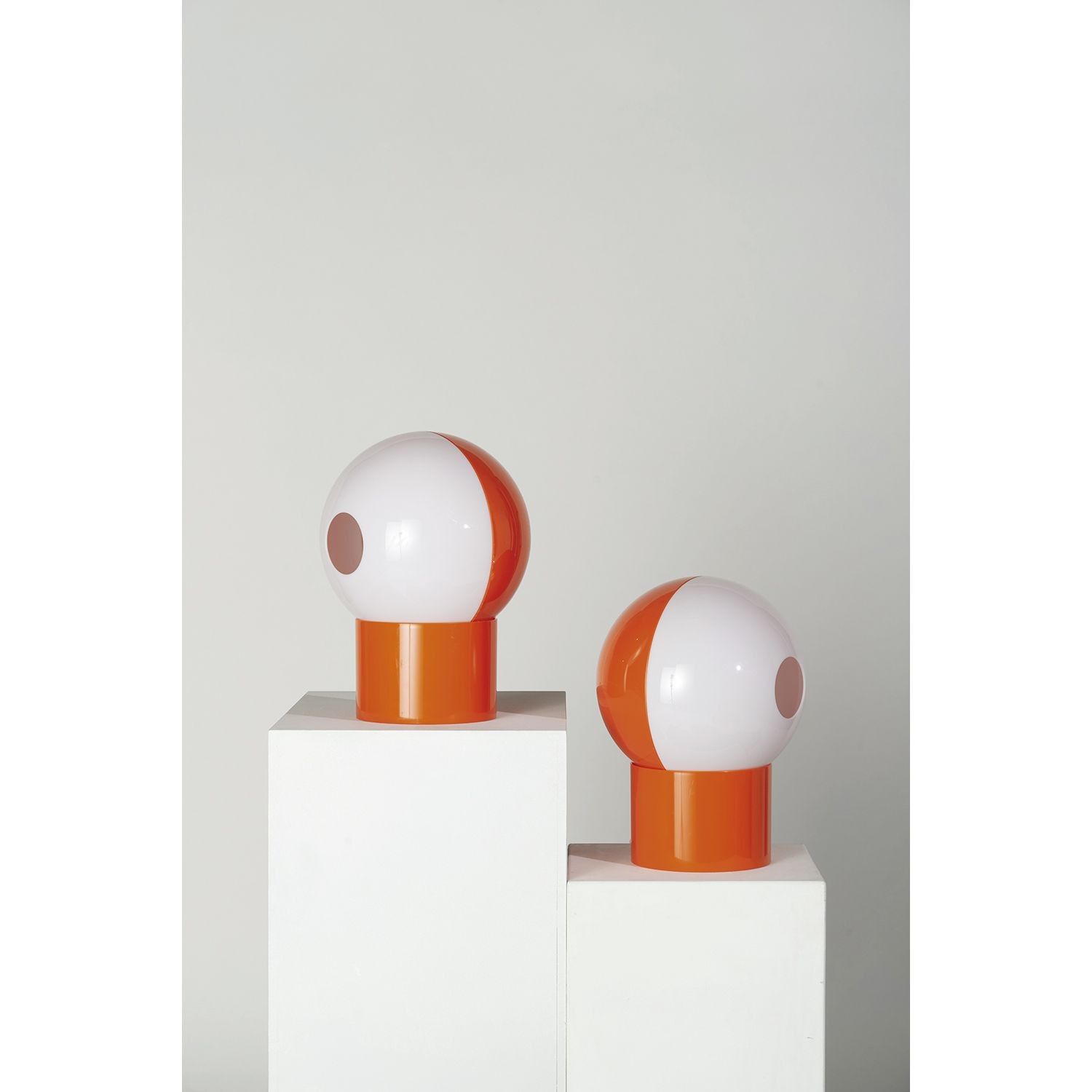 Pair of lamps in orange and white moulded plastic, cylindrical base housing a two-tone mobile sphere with a circular opening. Luxus label on the bases. Circa 1970