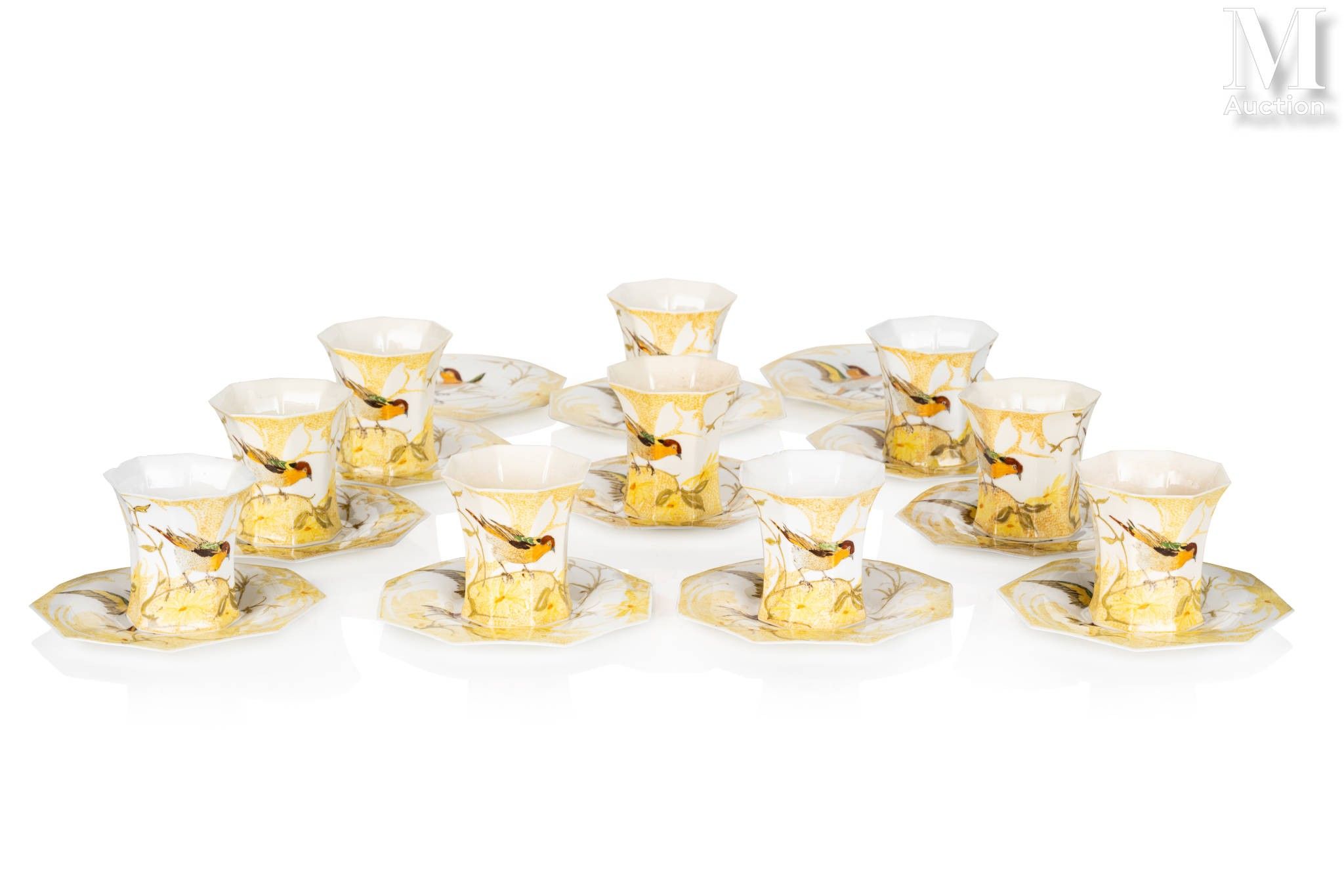 Set of ten cups and twelve saucers in fine polychrome porcelain decorated with robins among blossoming flowers.