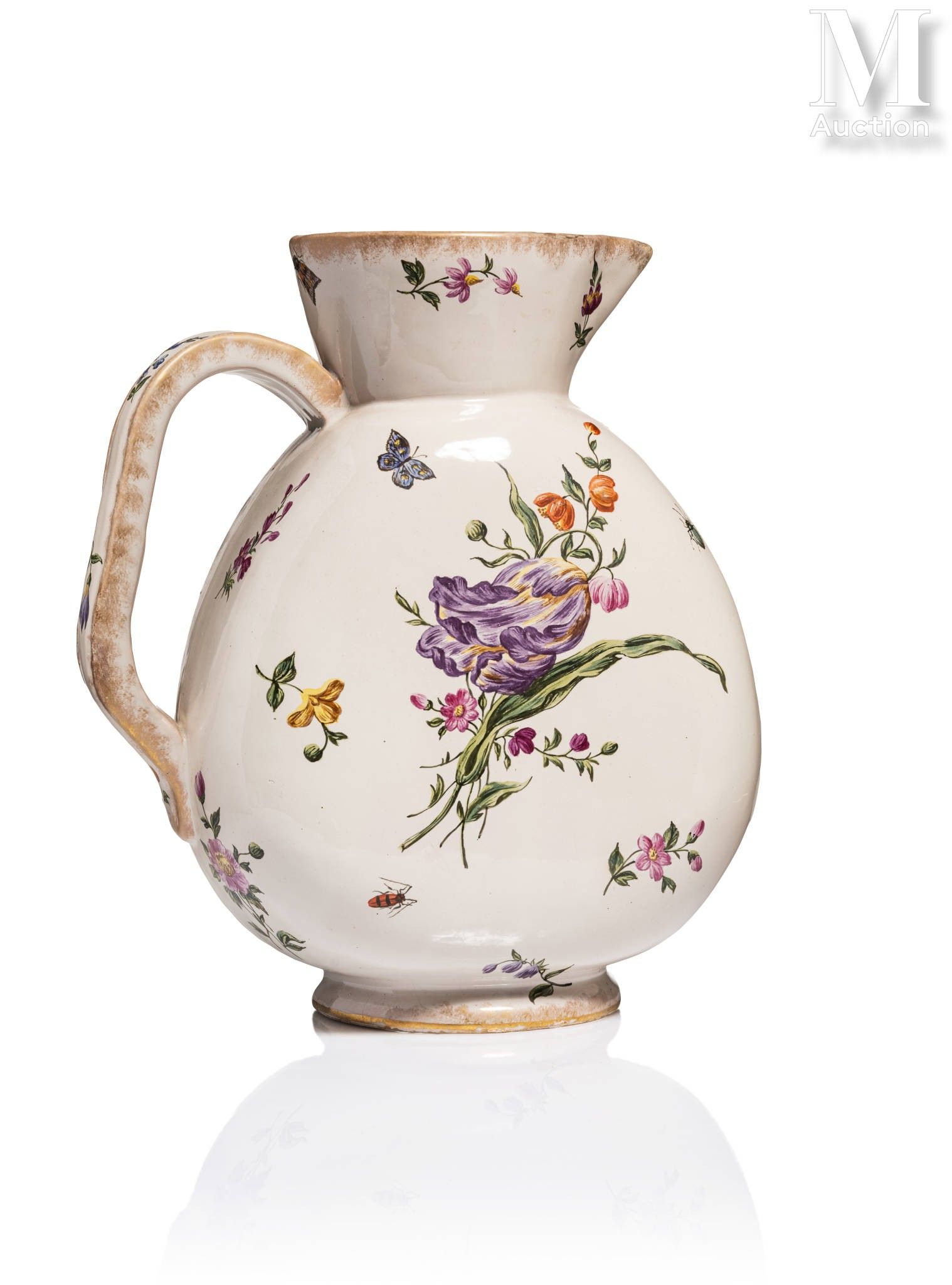 White enamelled earthenware jug with handle and pinched spout with polychrome enamelled decoration of flowers and insects and gold highlights.