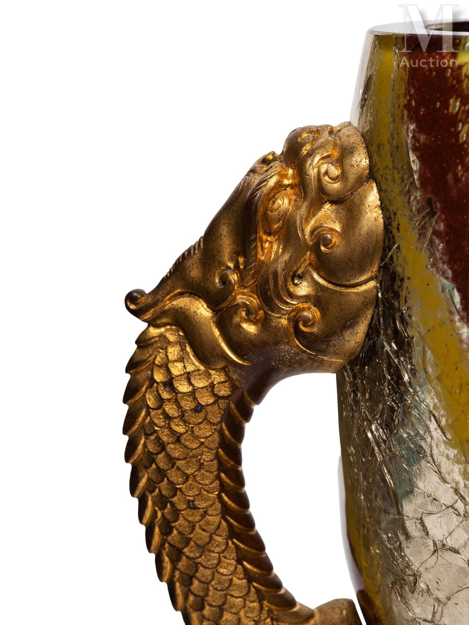 A double layer thick craked glass vase by Ernest Leveillé, with a décor of polychroamtic interlayer powders and flanked by two gilded bronze dragon heads.