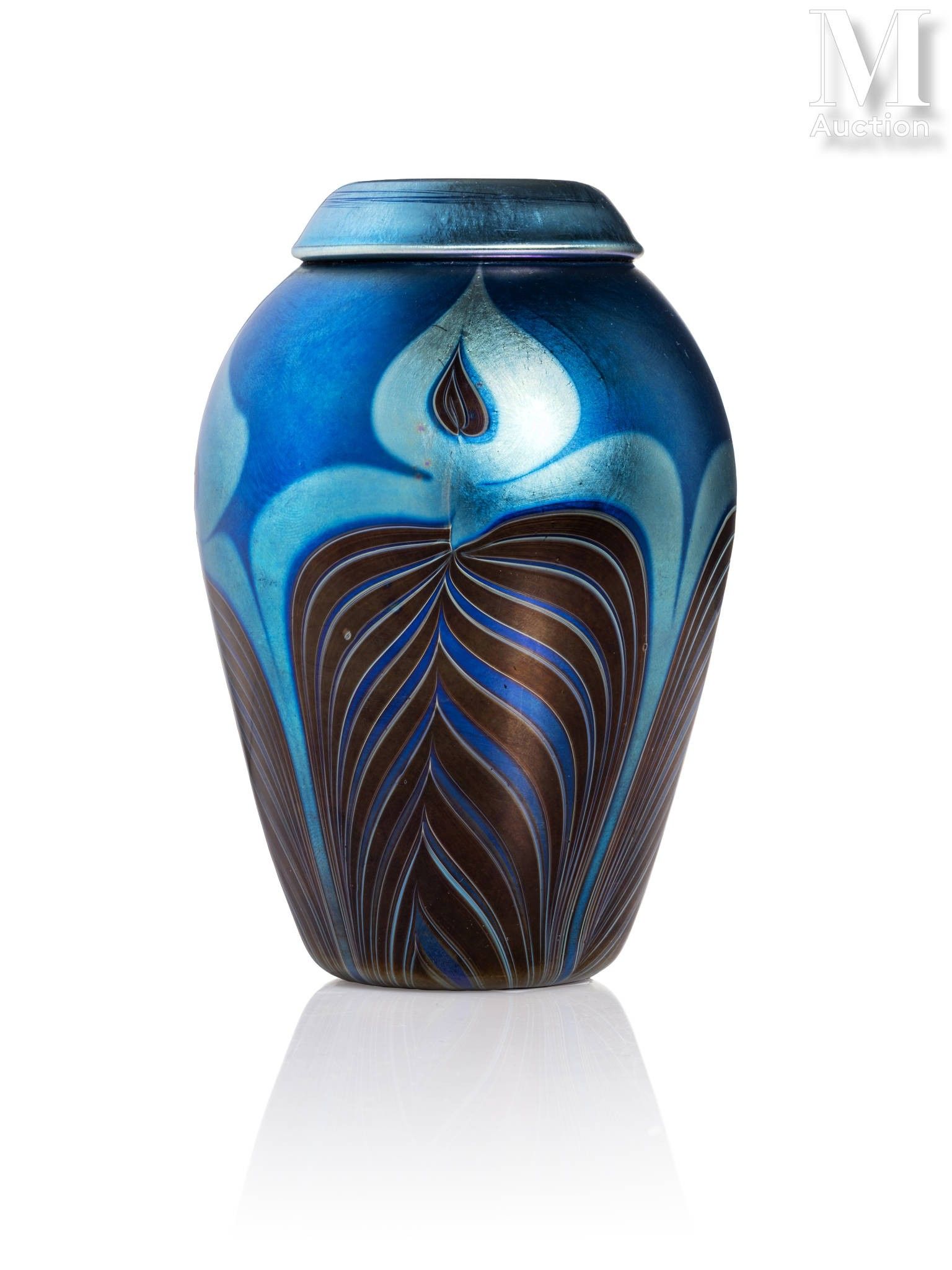 A blue iridescent "Favrile" glass vase with a decor of stylized peacock feathers designed by Louis Comfort Tiffany. Signed "L.C Tiffany" under the base.