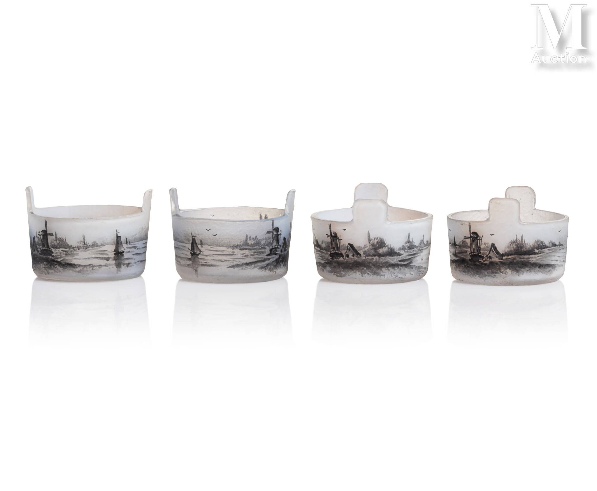 A set of two glass salt cellars from Daum - Nancy with a finely etched and greyish enamelled decof of lackside landscapes and sailboats. Signed "Daum # Nancy" under the base.